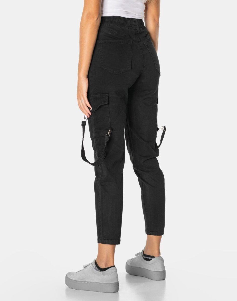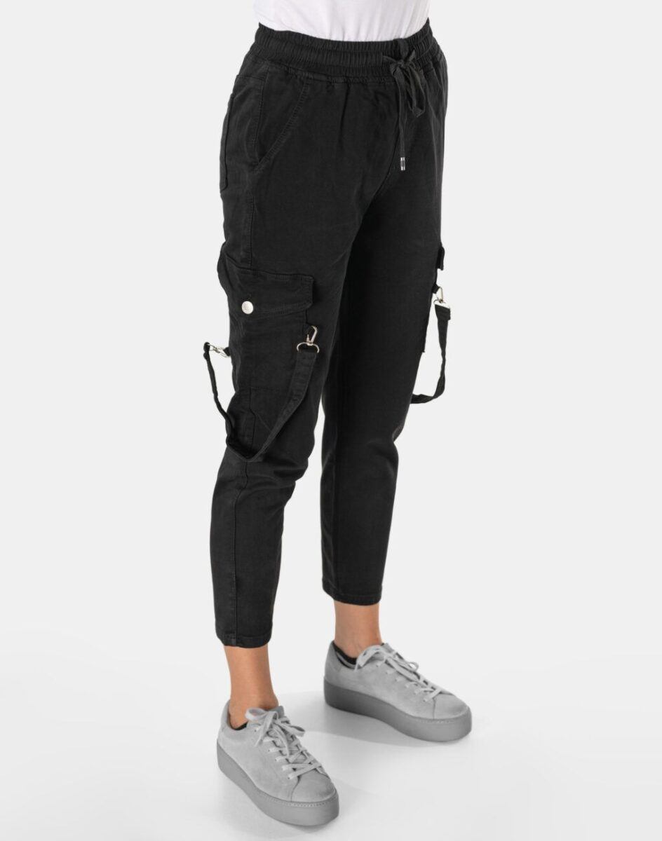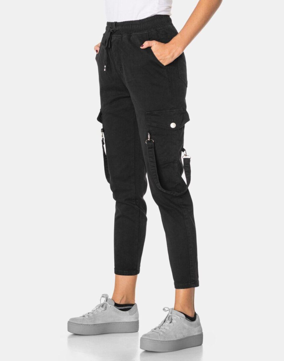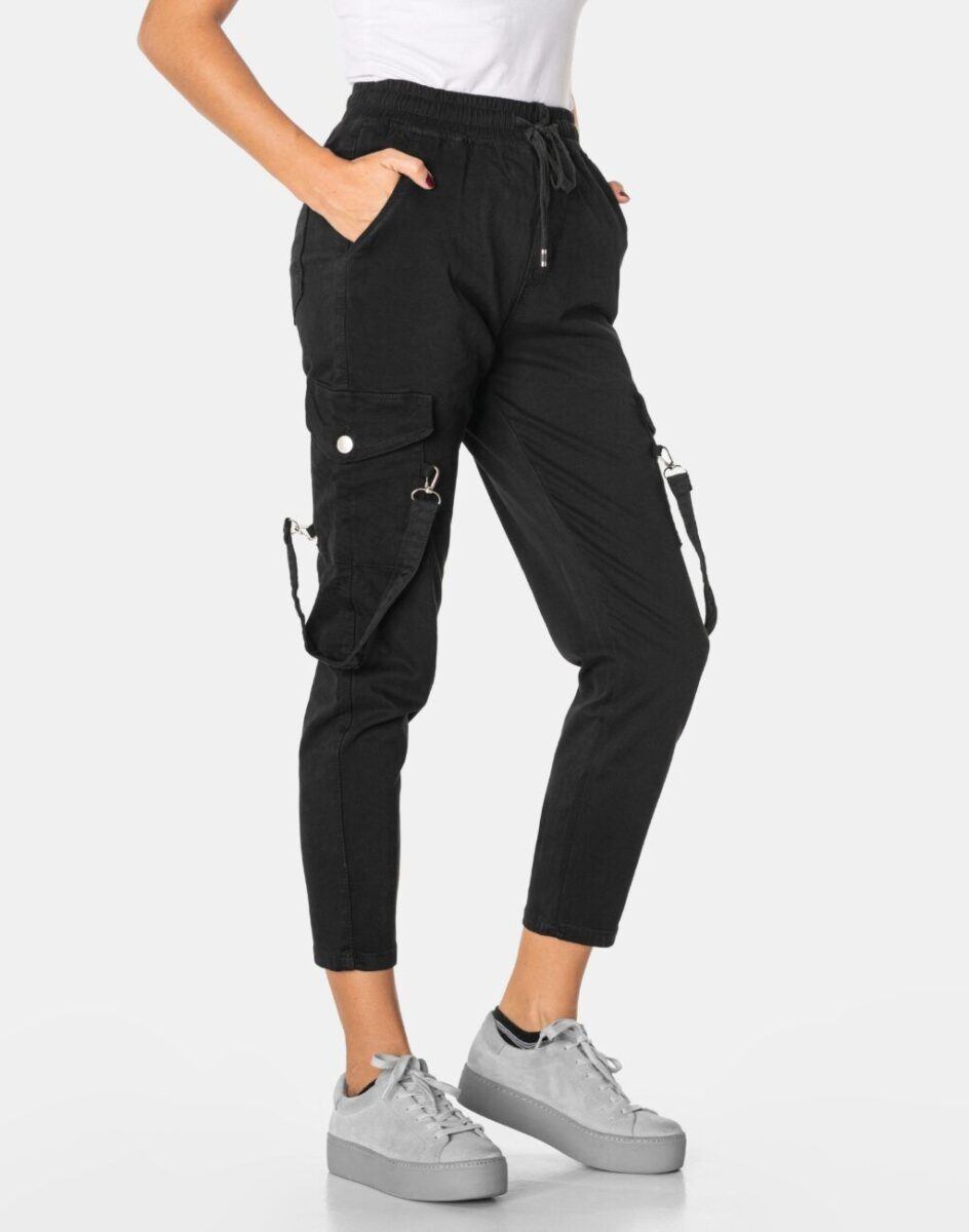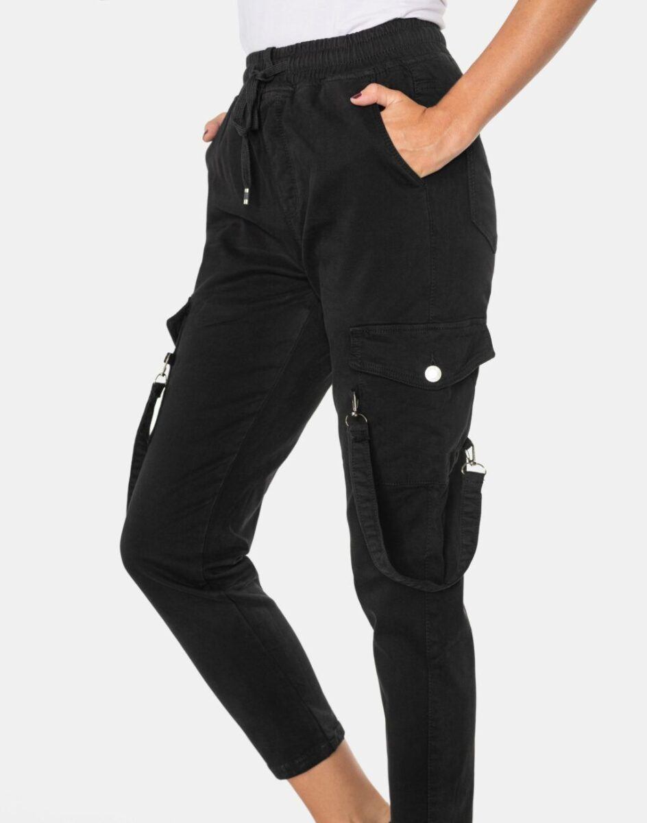 Spodnie bojówki o modnym fasonie Cargo powracają do mody w wielkim stylu. Z założenia wyróżniają się dużą wygodą a dopasowanie w pasie zapewnia szeroki, elastyczny pas ściągający oraz dodatkowo wpuszczona w pasek taśma regulacyjna z możliwością jej zawiązywania. Luźny militarny krój typu bojówki Cargo i elastyczny materiał pozwalają na pełną swobodę ruchów co daje użytkownikowi wygodę przy siadaniu i zapewnia ogromny komfort noszenia a dzięki zastosowaniu dodatkowych kieszeni na udach są także bardzo praktyczne bo schowasz w nich wiele przydatnych przedmiotów. Bardzo wygodne i stylowe ze zwężanymi nogawkami kończącymi się nad kostką co sprawia że sylwetka wygląda w nich lekko i zgrabnie. Na udach posiadają ozdobne paski z możliwością odpięcia. Doskonałe na co dzień i nie tylko bo są również świetną bazą do imprezowych stylizacji jeśli szukasz ciekawego akcentu.