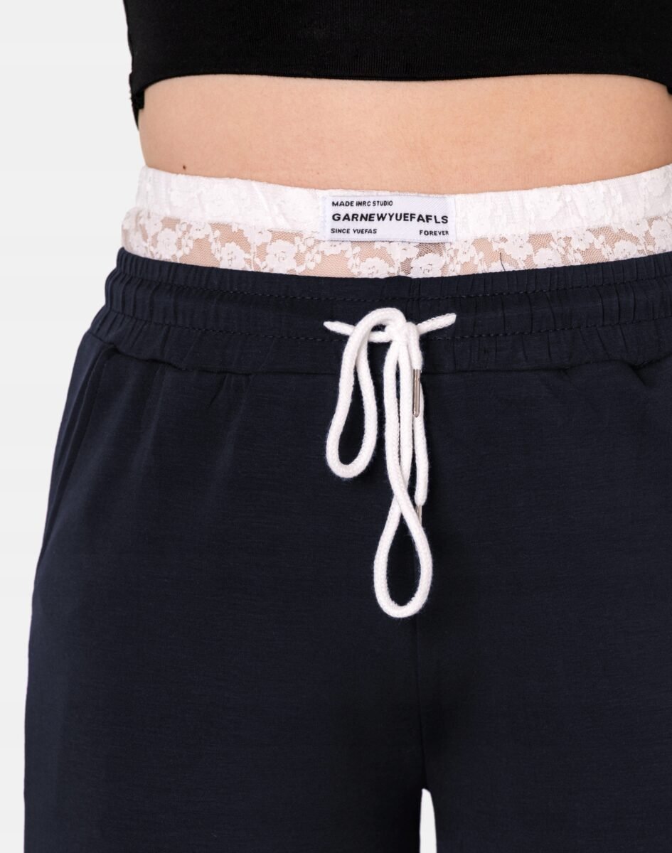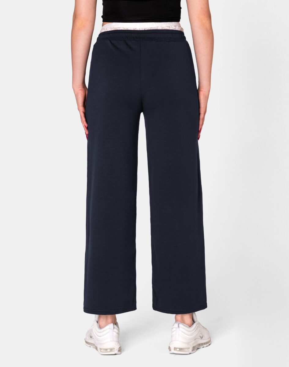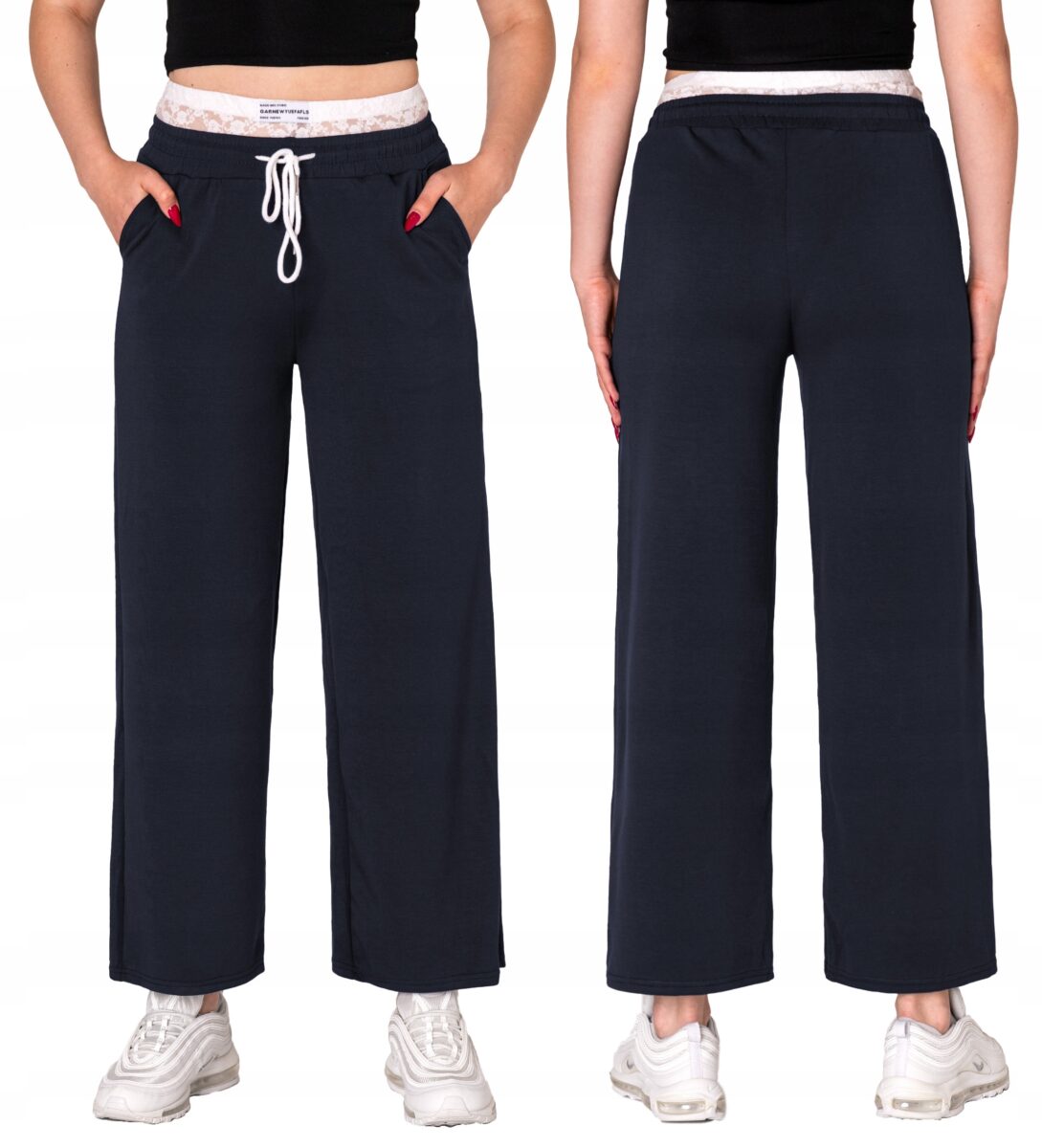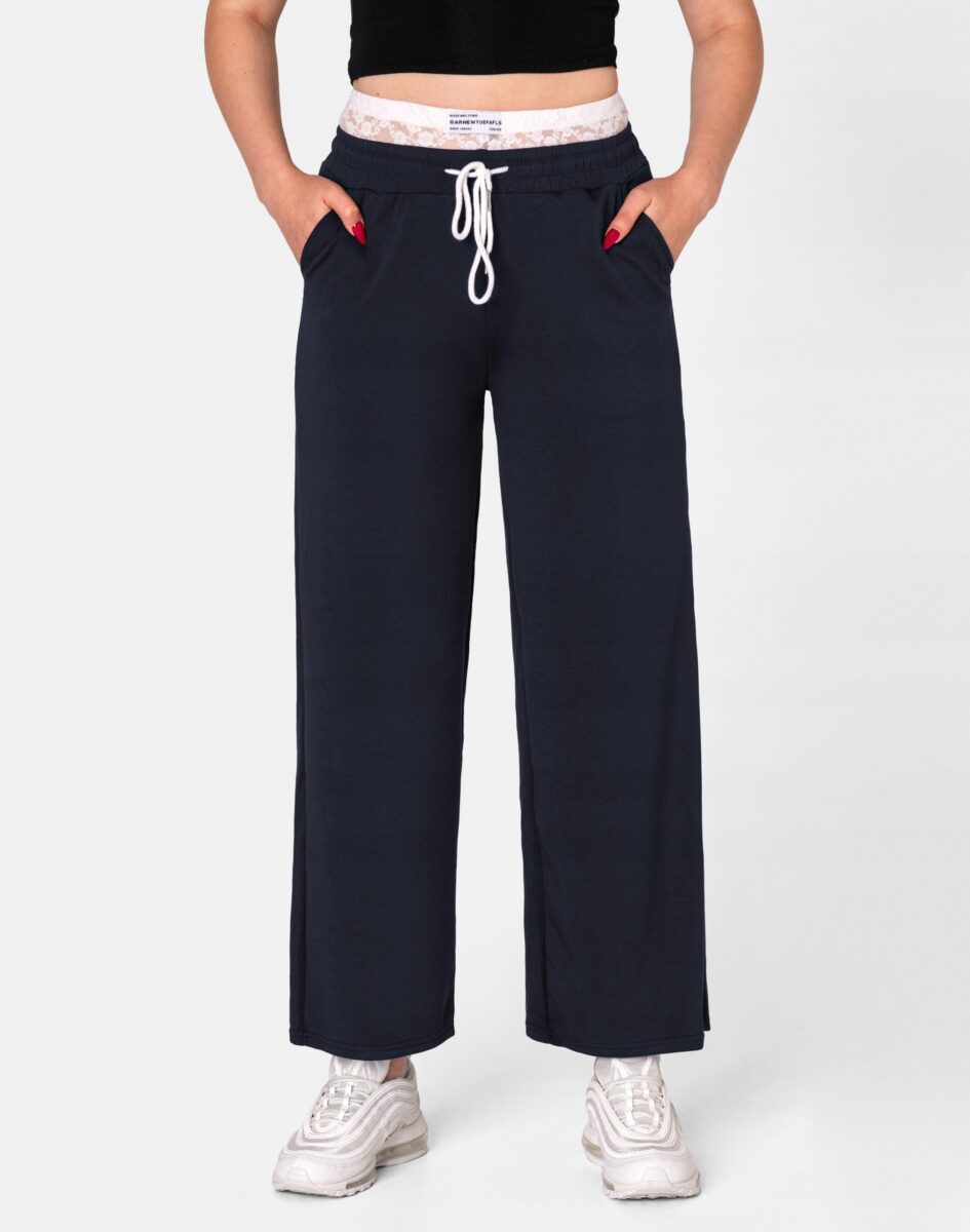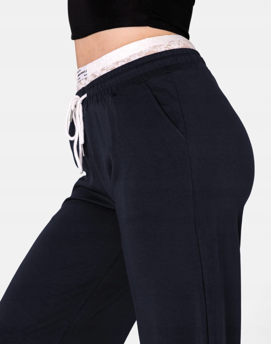 Z założenia wyróżniają się dużą wygodą a dopasowanie w pasie zapewnia szeroki, elastyczny pas ściągający zgrabnie modelujący talię, oraz dodatkowo wpuszczona w pasek taśma regulacyjna z możliwością jej zawiązywania. Z przodu mają dwie wpuszczane kieszenie na dłonie, tył gładki bez kieszeni. Stan podwyższony "High Rise" z ozdobną wstawką z koronki w pasie zapewnia świetne dopasowanie i zgrabnie modeluje sylwetkę w talii. Spodnie z szerokimi nogawkami idealnie równoważą proporcje sylwetki i dzięki nieco ekstrawaganckiemu charakterowi sprawią, że nawet minimalistyczna stylizacja będzie prezentować się nietuzinkowo. Zaprezentują Cię jako osobę, która lubi czuć się wygodnie i uwielbia najnowsze trendy aby bawić się własnym stylem w modzie.