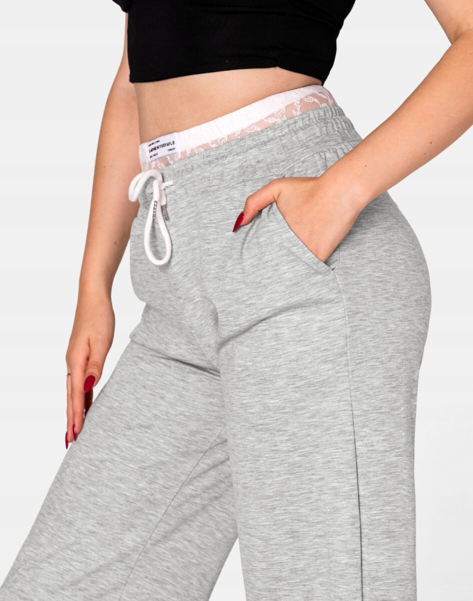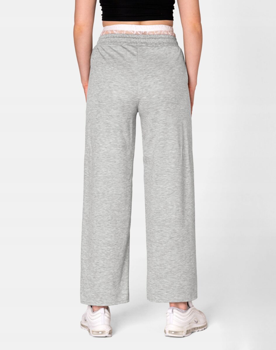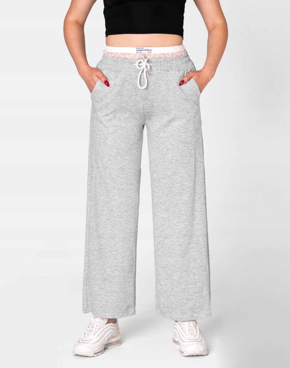 Z założenia wyróżniają się dużą wygodą a dopasowanie w pasie zapewnia szeroki, elastyczny pas ściągający zgrabnie modelujący talię, oraz dodatkowo wpuszczona w pasek taśma regulacyjna z możliwością jej zawiązywania. Z przodu mają dwie wpuszczane kieszenie na dłonie, tył gładki bez kieszeni. Stan podwyższony "High Rise" z ozdobną wstawką z koronki w pasie zapewnia świetne dopasowanie i zgrabnie modeluje sylwetkę w talii. Spodnie z szerokimi nogawkami idealnie równoważą proporcje sylwetki i dzięki nieco ekstrawaganckiemu charakterowi sprawią, że nawet minimalistyczna stylizacja będzie prezentować się nietuzinkowo. Zaprezentują Cię jako osobę, która lubi czuć się wygodnie i uwielbia najnowsze trendy aby bawić się własnym stylem w modzie.