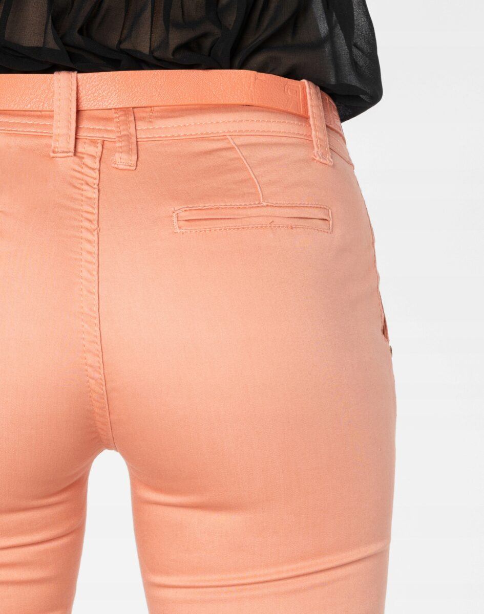 Spodnie damskie model 1570 to klasyczne, bardzo wygodne rurki damskie w letnim, pastelowym kolorze z wąskimi nogawkami o wyszczuplającym optycznie kobiecą sylwetkę fasonie i średnim stanie. Zapinane są na kryty zamek błyskawiczny i metalowy guzik sygnowany logiem firmy. Z przodu mają dwie ukośne kieszonki oraz imitację tzw. bilonówki, z tyłu imitacje klasycznych kieszeni wpuszczanych. W pasie szlufki umożliwiające stylizacje z paskiem. Najbardziej podatne na uszkodzenia miejsca wzmocnione są dodatkowymi przeszyciami oraz ozdobnymi nitami.
