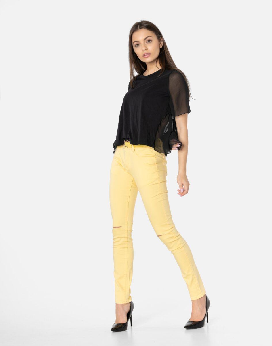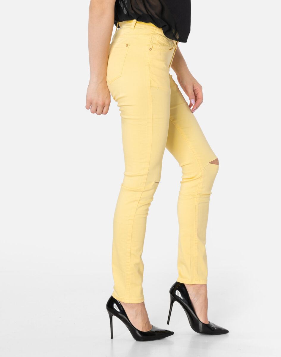 Oferowane przez nas spodnie uszyte są z wysokiej jakości cienkiej tkaniny typu „Light Denim”, która odznacza się wysoką elastycznością gwarantującą doskonałe dopasowanie do każdej figury. Spodnie nie będą się deformować i odkształcać nawet po długim użytkowaniu. Świetnie przylegają do ciała, a jednocześnie pozwalają na pełną swobodę ruchów, co daje komfort przy siadaniu i zapewnia ogromną wygodę noszenia. Na kolanach bardzo popularne od kilku sezonów poziome rozcięcia będące synonimem niezależności i subiektywności w wyrażaniu siebie oraz pojmowaniu mody. Możesz je śmiało łączyć zarówno ze szpilkami (idealnie wydłużają kobiece nogi), jak i obuwiem sportowym. Dobrze wyglądają również z podwiniętymi nogawkami.