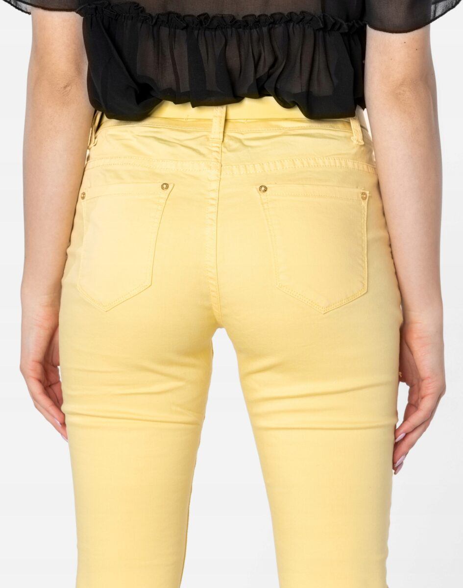 Spodnie damskie model 20570 to klasyczne, bardzo wygodne rurki damskie w letnim, pastelowym kolorze z wąskimi nogawkami o wyszczuplającym optycznie kobiecą sylwetkę fasonie i średnim stanie. Zapinane są na kryty zamek błyskawiczny i metalowy guzik sygnowany logiem firmy. Z przodu mają dwie zaokrąglone kieszonki oraz mniejszą tzw. bilonówkę, a na tyle klasyczne kieszenie naszywane jak w typowych spodniach jeansowych. W pasie szlufki umożliwiające stylizacje z paskiem. Najbardziej podatne na uszkodzenia miejsca wzmocnione są dodatkowymi przeszyciami oraz ozdobnymi nitami.
