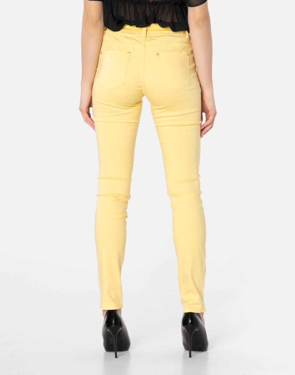 Spodnie damskie model 20570 to klasyczne, bardzo wygodne rurki damskie w letnim, pastelowym kolorze z wąskimi nogawkami o wyszczuplającym optycznie kobiecą sylwetkę fasonie i średnim stanie. Zapinane są na kryty zamek błyskawiczny i metalowy guzik sygnowany logiem firmy. Z przodu mają dwie zaokrąglone kieszonki oraz mniejszą tzw. bilonówkę, a na tyle klasyczne kieszenie naszywane jak w typowych spodniach jeansowych. W pasie szlufki umożliwiające stylizacje z paskiem. Najbardziej podatne na uszkodzenia miejsca wzmocnione są dodatkowymi przeszyciami oraz ozdobnymi nitami.