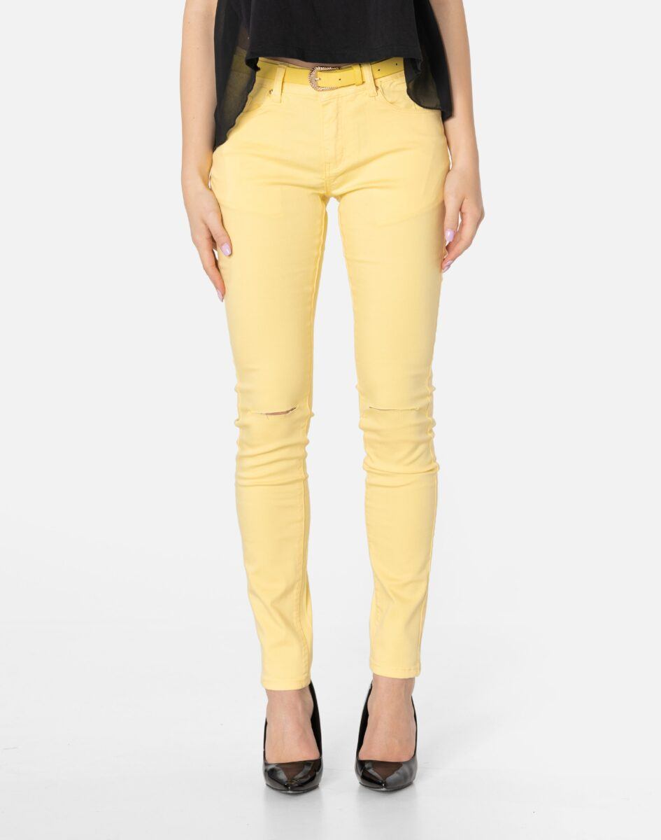 Oferowane przez nas spodnie uszyte są z wysokiej jakości cienkiej tkaniny typu „Light Denim”, która odznacza się wysoką elastycznością gwarantującą doskonałe dopasowanie do każdej figury. Spodnie nie będą się deformować i odkształcać nawet po długim użytkowaniu. Świetnie przylegają do ciała, a jednocześnie pozwalają na pełną swobodę ruchów, co daje komfort przy siadaniu i zapewnia ogromną wygodę noszenia. Na kolanach bardzo popularne od kilku sezonów poziome rozcięcia będące synonimem niezależności i subiektywności w wyrażaniu siebie oraz pojmowaniu mody. Możesz je śmiało łączyć zarówno ze szpilkami (idealnie wydłużają kobiece nogi), jak i obuwiem sportowym. Dobrze wyglądają również z podwiniętymi nogawkami.