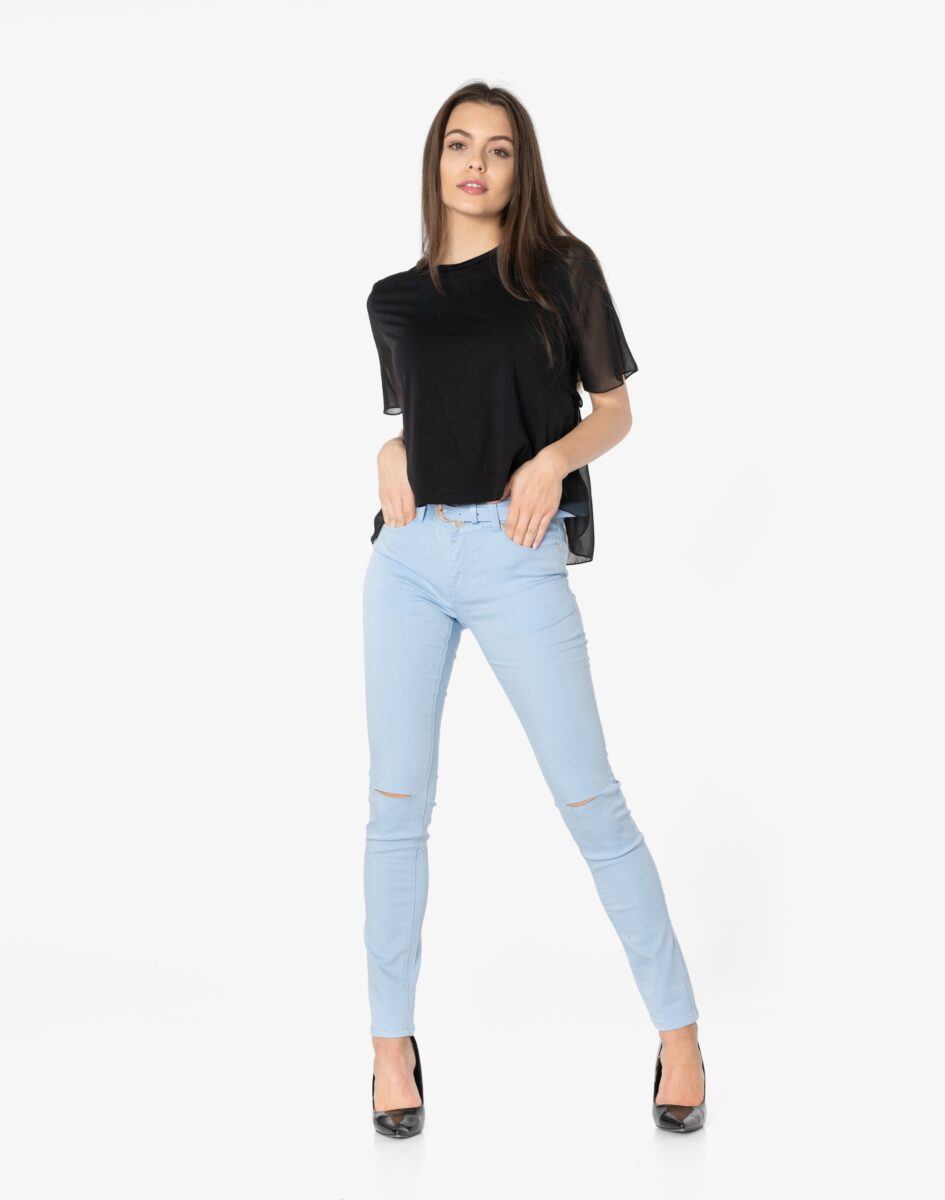 Oferowane przez nas spodnie uszyte są z wysokiej jakości cienkiej tkaniny typu „Light Denim”, która odznacza się wysoką elastycznością gwarantującą doskonałe dopasowanie do każdej figury. Spodnie nie będą się deformować i odkształcać nawet po długim użytkowaniu. Świetnie przylegają do ciała, a jednocześnie pozwalają na pełną swobodę ruchów, co daje komfort przy siadaniu i zapewnia ogromną wygodę noszenia. Na kolanach bardzo popularne od kilku sezonów poziome rozcięcia będące synonimem niezależności i subiektywności w wyrażaniu siebie oraz pojmowaniu mody. Możesz je śmiało łączyć zarówno ze szpilkami (idealnie wydłużają kobiece nogi), jak i obuwiem sportowym. Dobrze wyglądają również z podwiniętymi nogawkami.