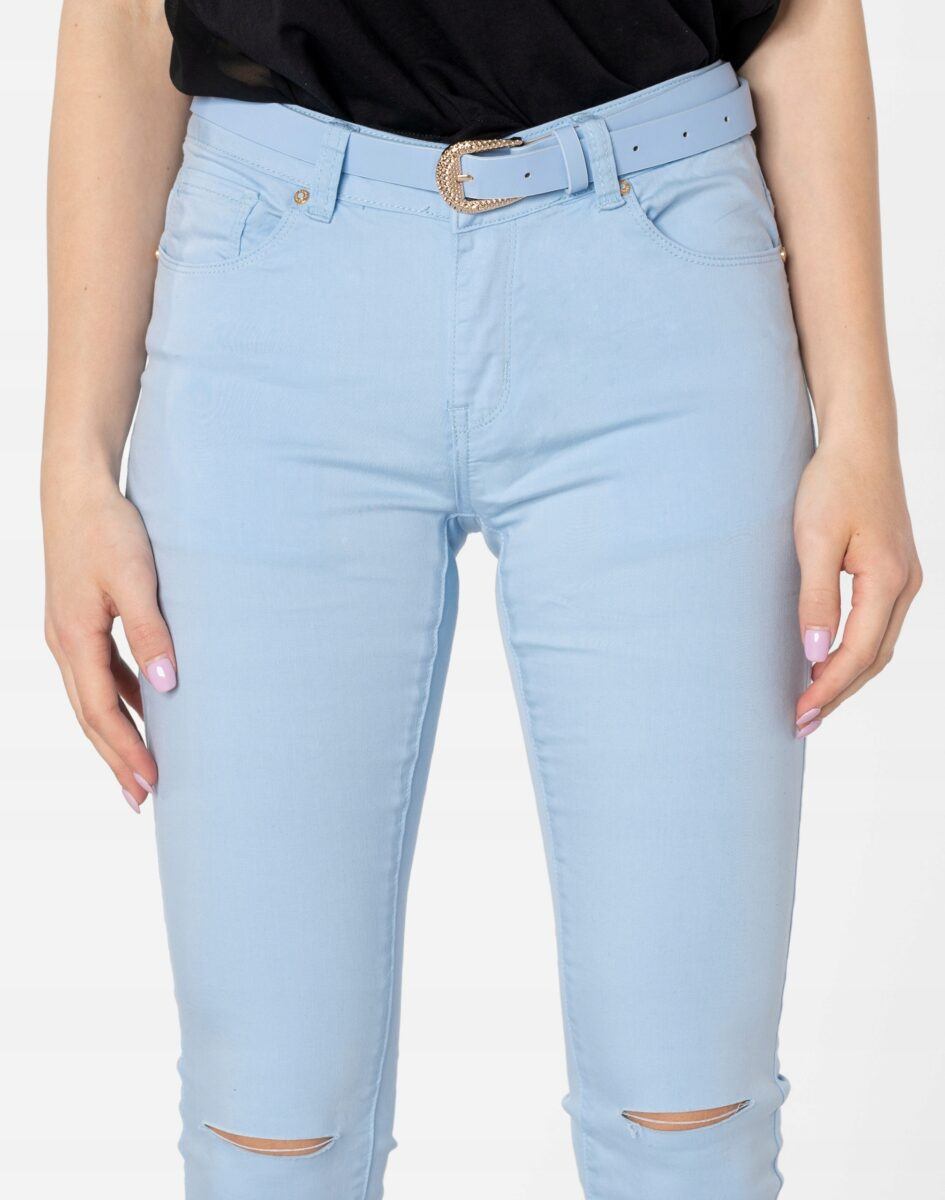 Oferowane przez nas spodnie uszyte są z wysokiej jakości cienkiej tkaniny typu „Light Denim”, która odznacza się wysoką elastycznością gwarantującą doskonałe dopasowanie do każdej figury. Spodnie nie będą się deformować i odkształcać nawet po długim użytkowaniu. Świetnie przylegają do ciała, a jednocześnie pozwalają na pełną swobodę ruchów, co daje komfort przy siadaniu i zapewnia ogromną wygodę noszenia. Na kolanach bardzo popularne od kilku sezonów poziome rozcięcia będące synonimem niezależności i subiektywności w wyrażaniu siebie oraz pojmowaniu mody. Możesz je śmiało łączyć zarówno ze szpilkami (idealnie wydłużają kobiece nogi), jak i obuwiem sportowym. Dobrze wyglądają również z podwiniętymi nogawkami.