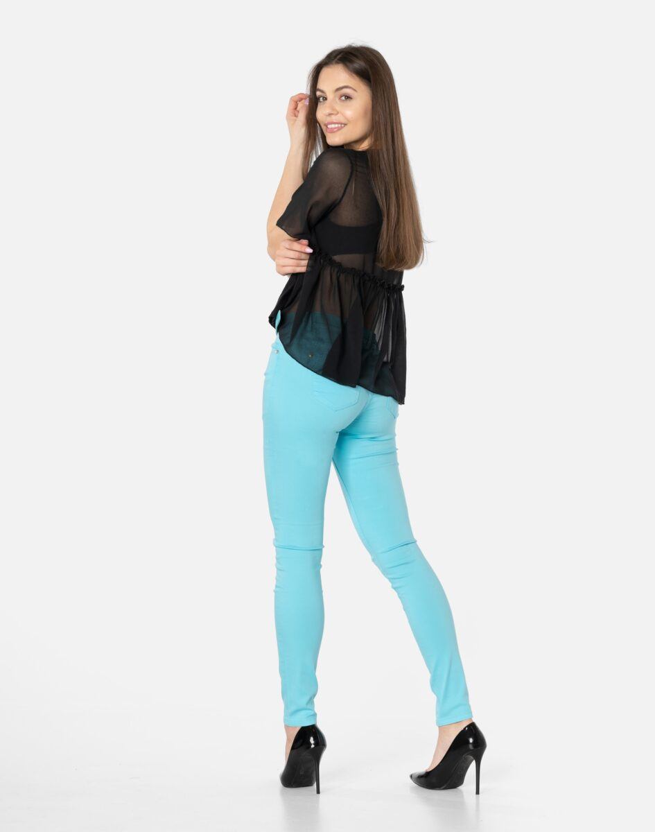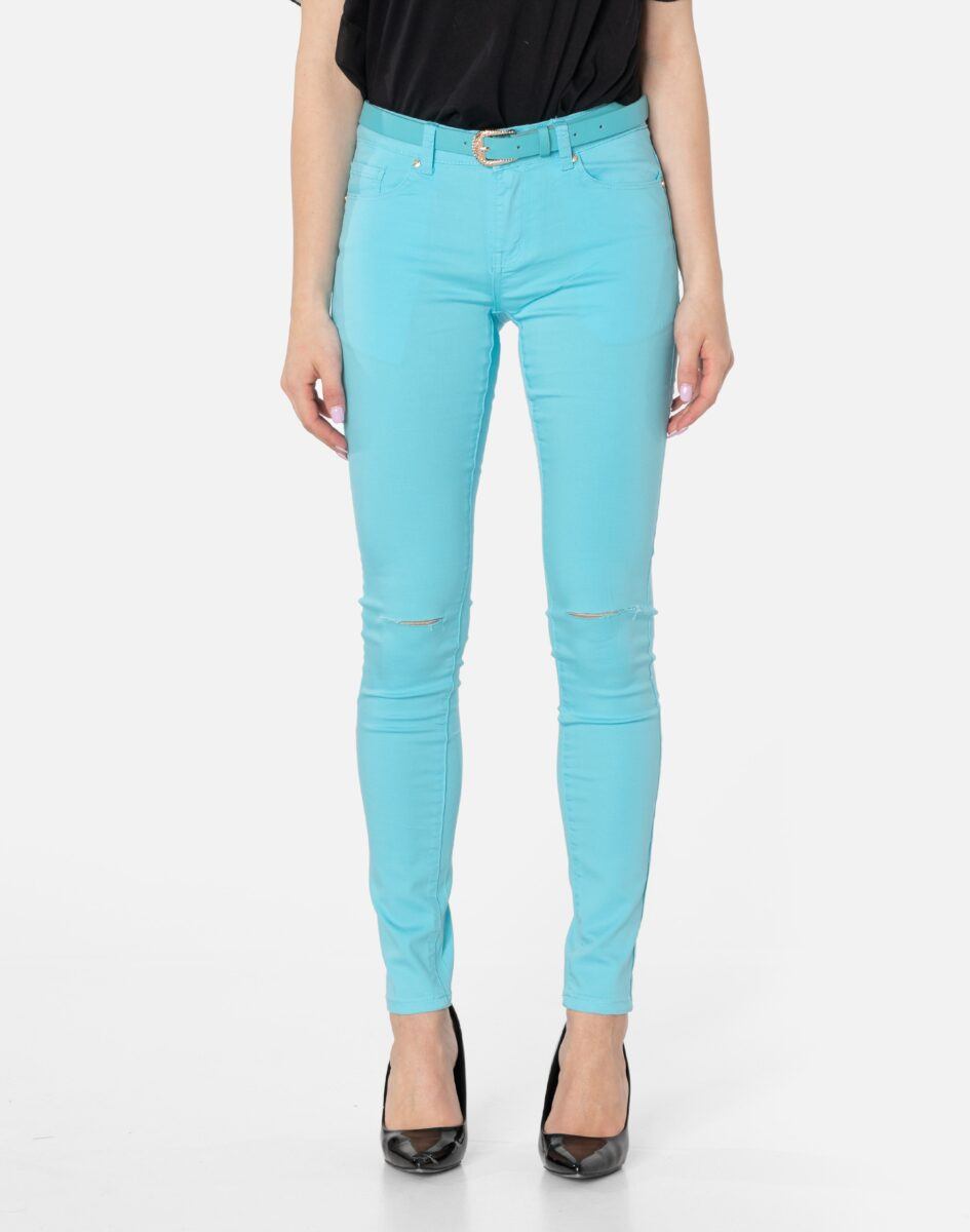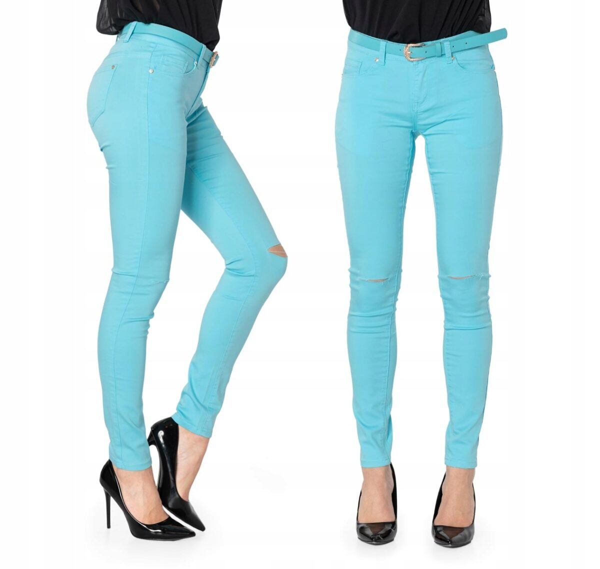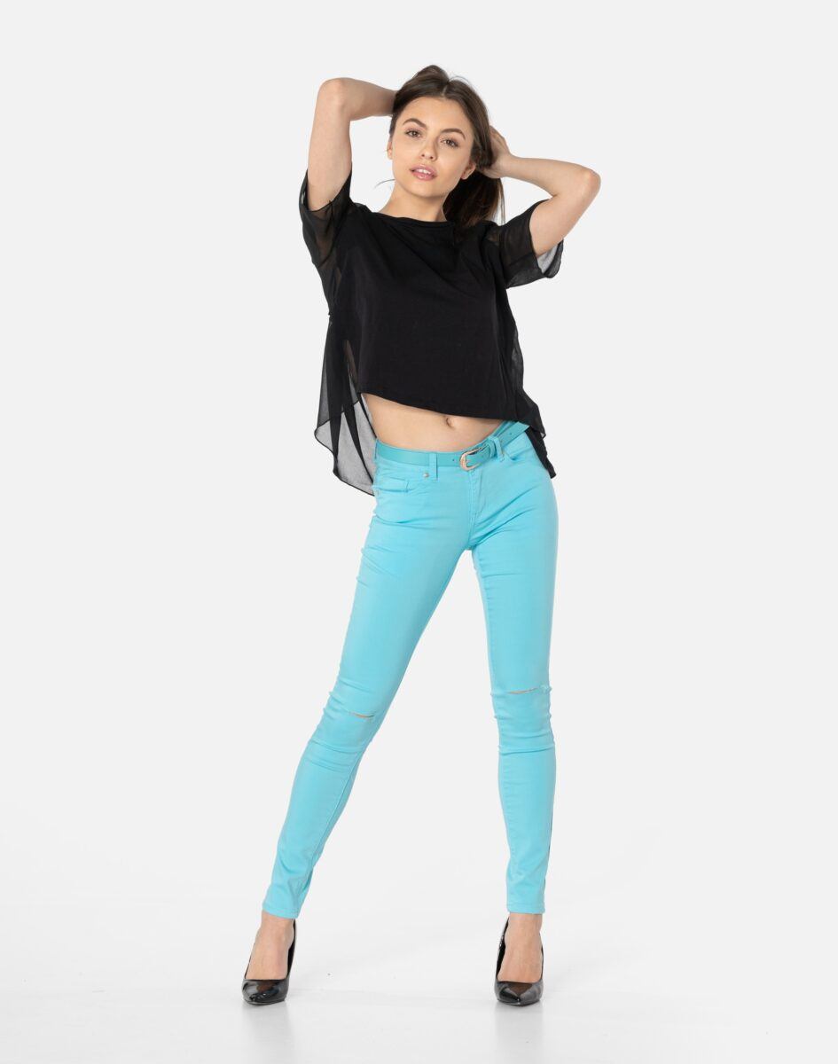 Oferowane przez nas spodnie uszyte są z wysokiej jakości cienkiej tkaniny typu „Light Denim”, która odznacza się wysoką elastycznością gwarantującą doskonałe dopasowanie do każdej figury. Spodnie nie będą się deformować i odkształcać nawet po długim użytkowaniu. Świetnie przylegają do ciała, a jednocześnie pozwalają na pełną swobodę ruchów, co daje komfort przy siadaniu i zapewnia ogromną wygodę noszenia. Na kolanach bardzo popularne od kilku sezonów poziome rozcięcia będące synonimem niezależności i subiektywności w wyrażaniu siebie oraz pojmowaniu mody. Możesz je śmiało łączyć zarówno ze szpilkami (idealnie wydłużają kobiece nogi), jak i obuwiem sportowym. Dobrze wyglądają również z podwiniętymi nogawkami.