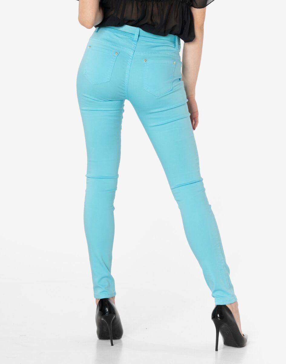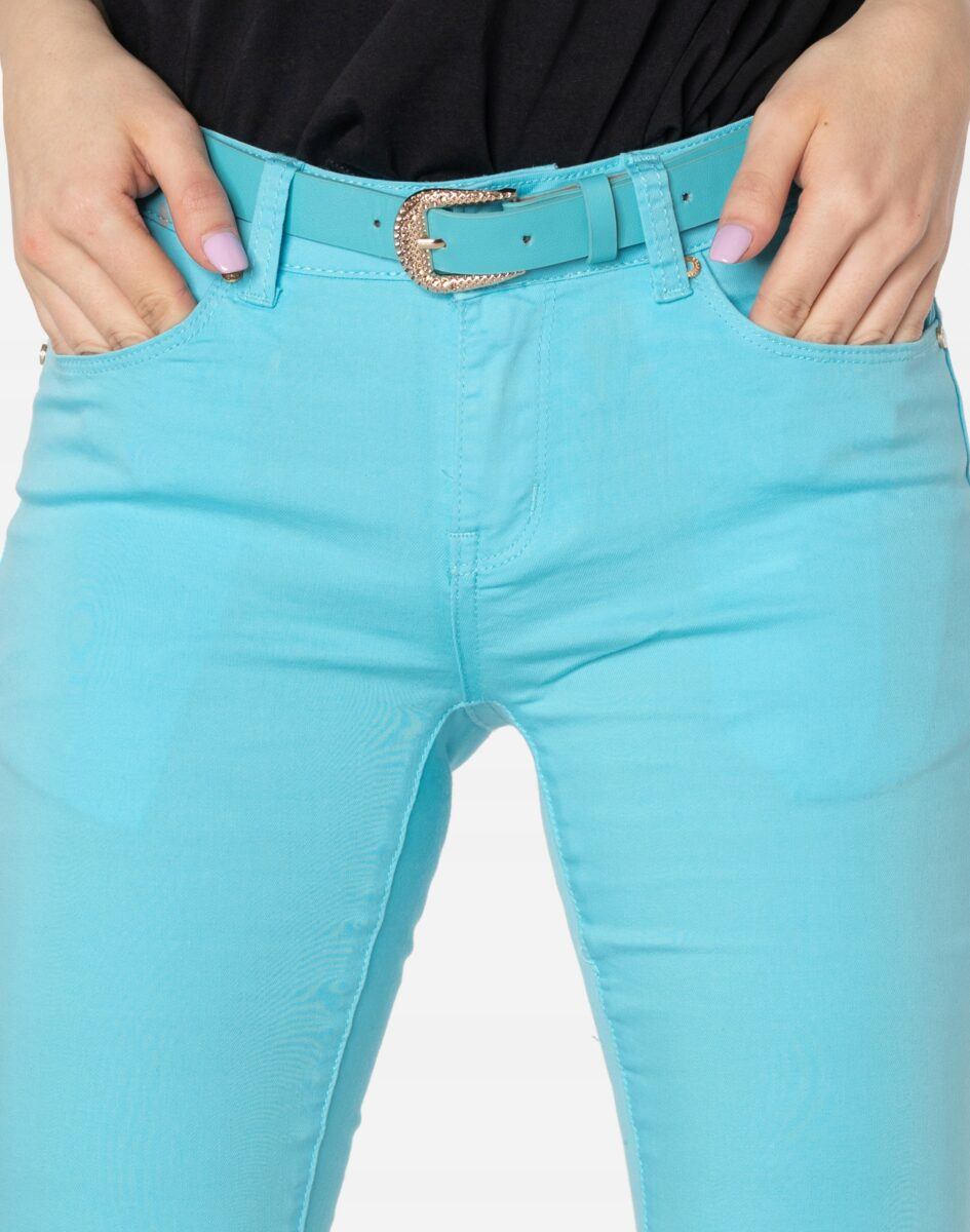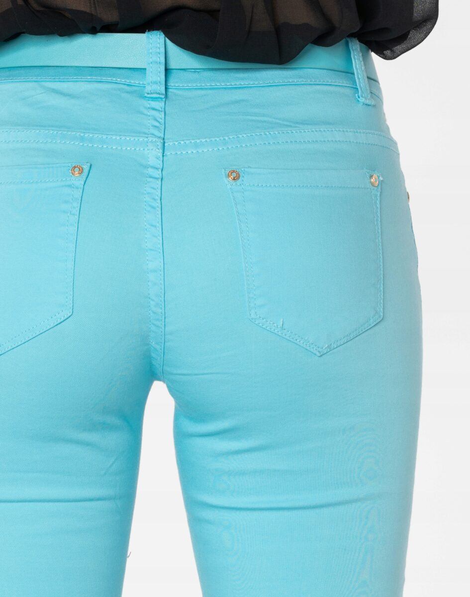 Spodnie damskie model 20570 to klasyczne, bardzo wygodne rurki damskie w letnim, pastelowym kolorze z wąskimi nogawkami o wyszczuplającym optycznie kobiecą sylwetkę fasonie i średnim stanie. Zapinane są na kryty zamek błyskawiczny i metalowy guzik sygnowany logiem firmy. Z przodu mają dwie zaokrąglone kieszonki oraz mniejszą tzw. bilonówkę, a na tyle klasyczne kieszenie naszywane jak w typowych spodniach jeansowych. W pasie szlufki umożliwiające stylizacje z paskiem. Najbardziej podatne na uszkodzenia miejsca wzmocnione są dodatkowymi przeszyciami oraz ozdobnymi nitami.