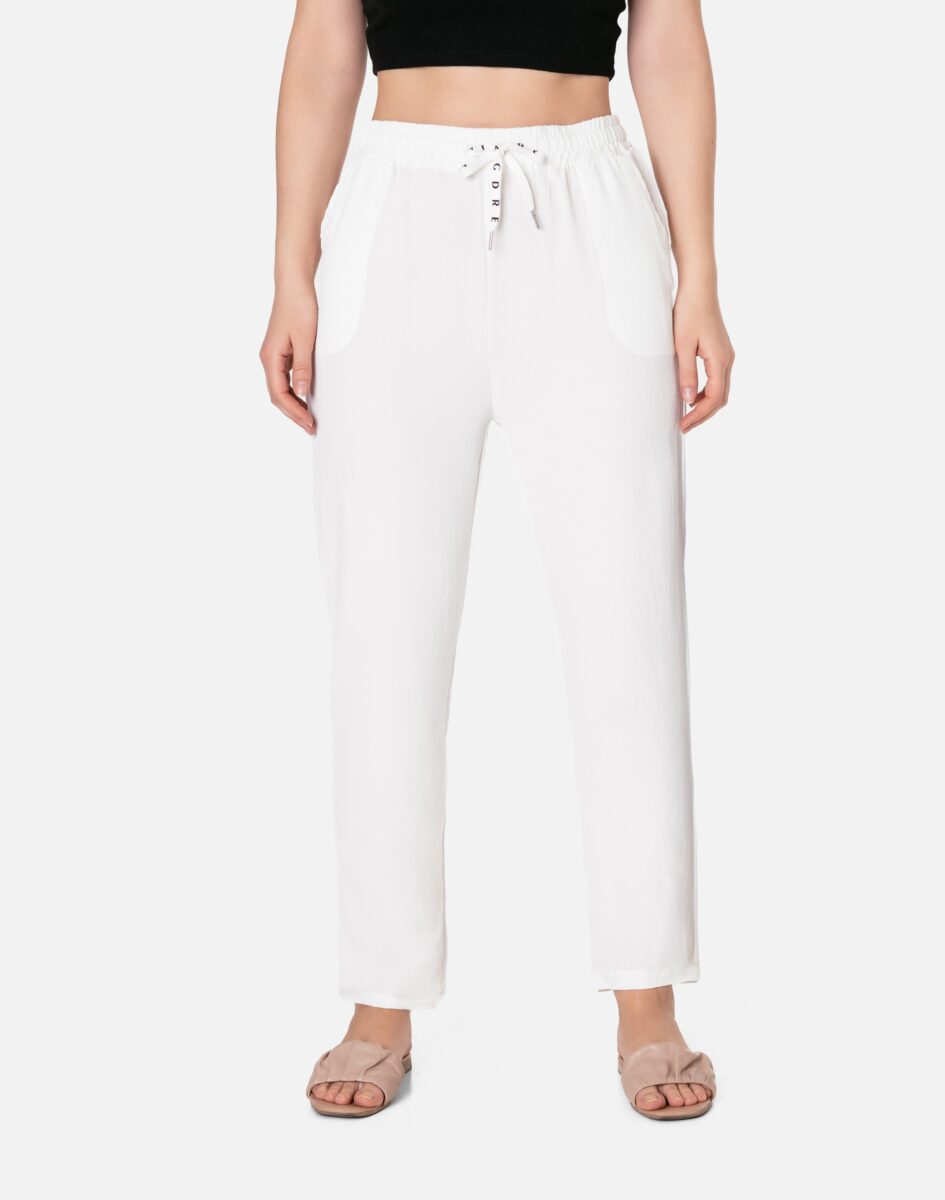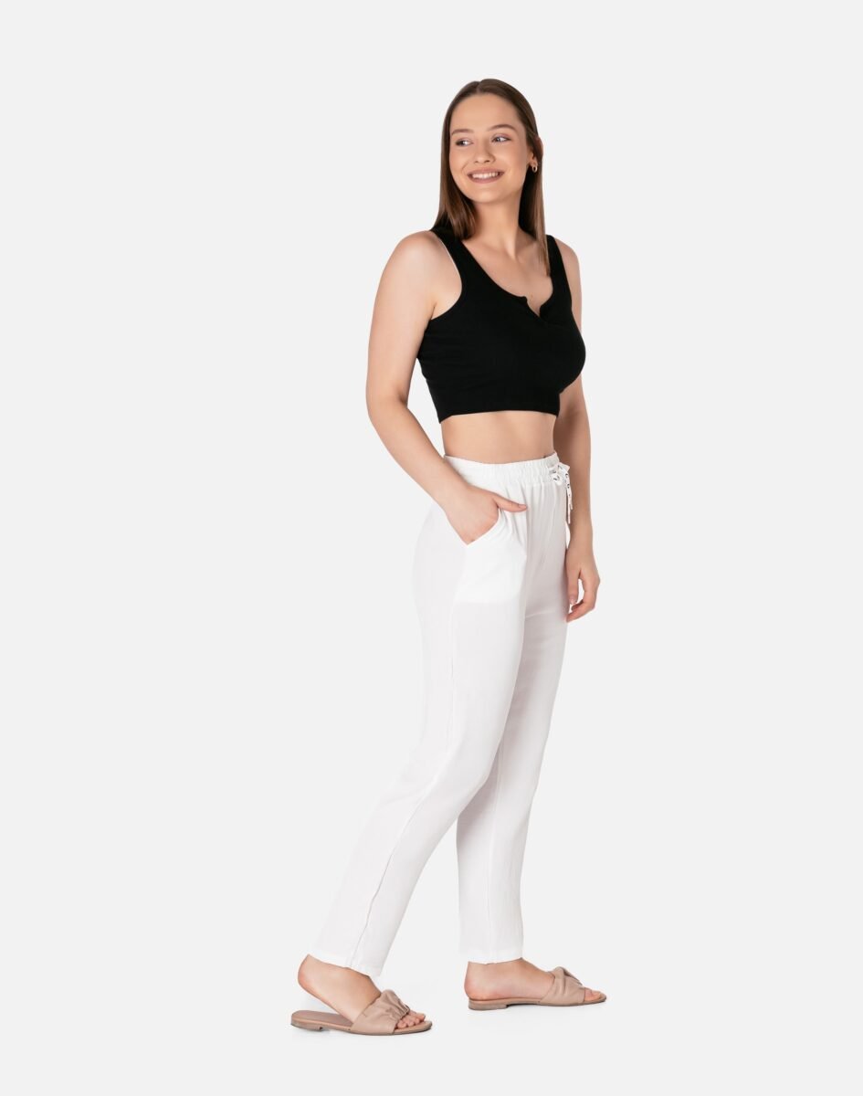 Wyjątkowo lekkie i przewiewne damskie spodnie bawełniane z wysokim stanem i luźną, lekko zwężaną nogawką to jeden z najczęściej wybieranych na ciepłe i gorące dni wiosny i lata modeli spodni. Wykonane z wysokiej jakości cienkiej, przewiewnej i oddychającej tkaniny bawełnianej. Dopasowanie w pasie zapewnia szeroki, elastyczny pas ściągający zgrabnie modelujący sylwetkę w talii oraz dodatkowo wpuszczona w pasek taśma regulacyjna z możliwością jej zawiązywania. Na bokach spodni dwie wpuszczane kieszonki na dłonie. Odpowiedni na wysokie temperatury luźny krój spodni nie ogranicza swobody ruchów, a niewielka gramatura tkaniny (140 g/m2) pozytywnie wpływa na komfort użytkowania. Idealne na co dzień jako element casualowego stroju czyniąc go lekkim i dostosowanym do wysokich temperatur.
