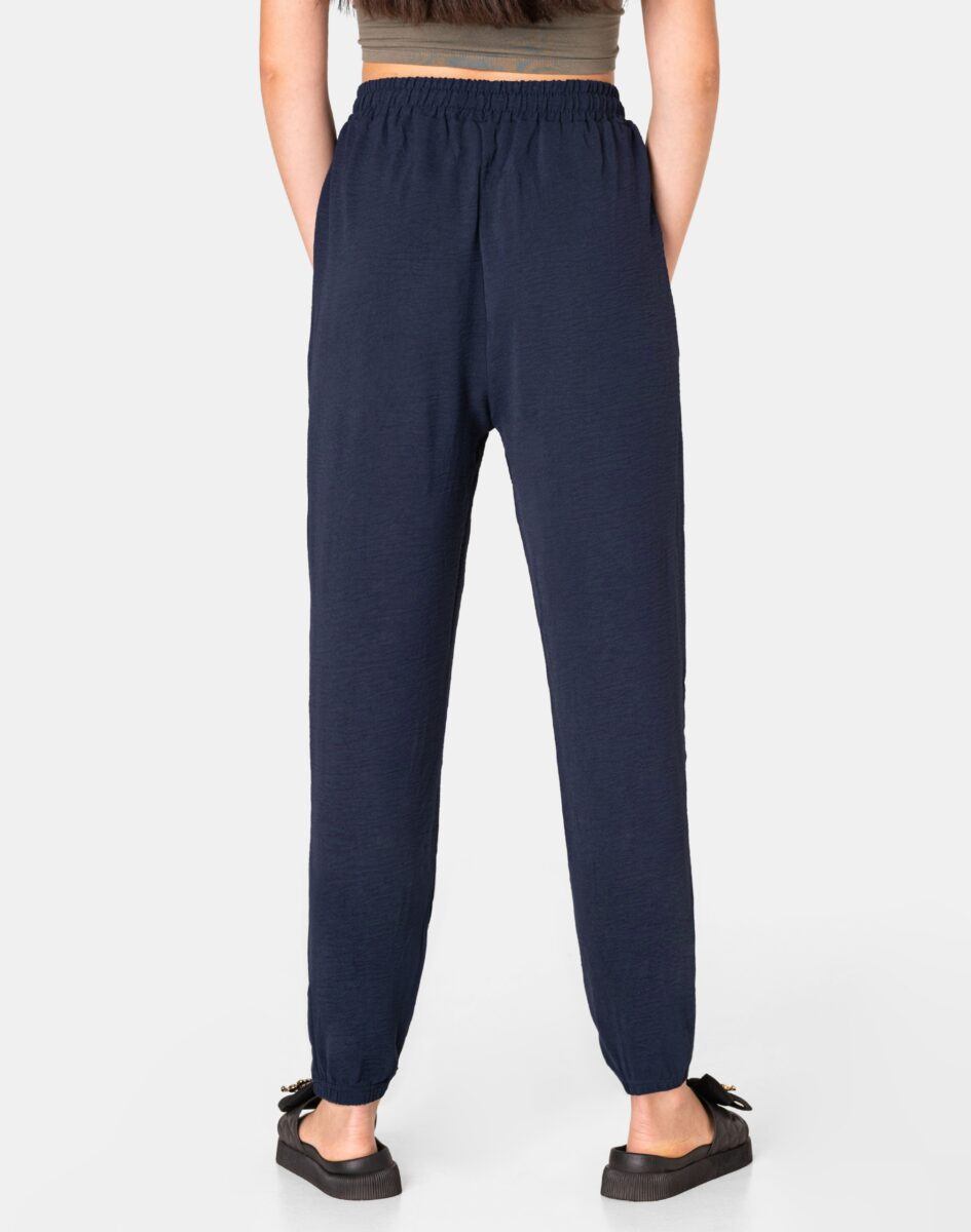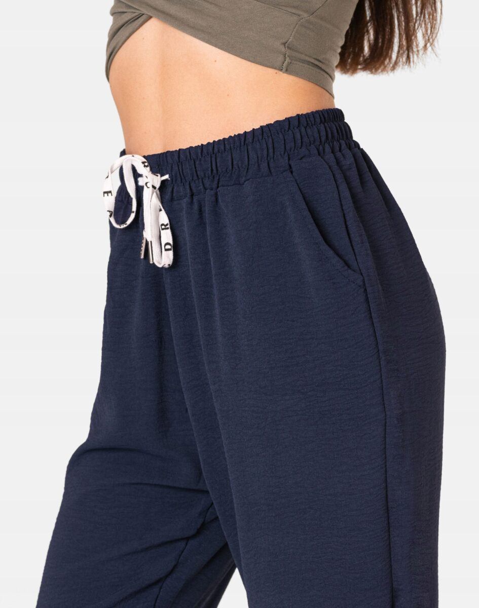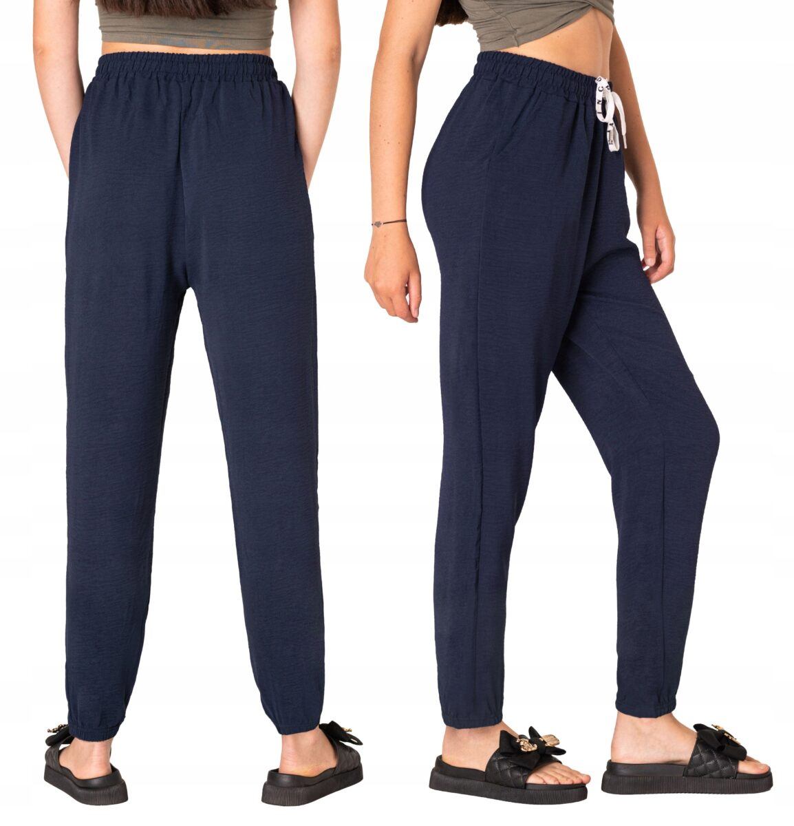 Wyjątkowo lekkie i przewiewne damskie spodnie bawełniane z wysokim stanem i luźną, zwężaną nogawką zakończoną ściągaczem to jeden z najczęściej wybieranych na ciepłe i gorące dni wiosny i lata modeli spodni. Wykonane z wysokiej jakości cienkiej, przewiewnej i oddychającej tkaniny bawełnianej. Dopasowanie w pasie zapewnia szeroki, elastyczny pas ściągający zgrabnie modelujący sylwetkę w talii oraz dodatkowo wpuszczona w pasek ozdobna taśma regulacyjna z możliwością jej zawiązywania. Na bokach spodni dwie wpuszczane kieszonki na dłonie. Odpowiedni na wysokie temperatury luźny krój spodni nie ogranicza swobody ruchów, a niewielka gramatura tkaniny (140 g/m2) pozytywnie wpływa na komfort użytkowania w upalne dni. Idealne na co dzień jako element casualowego stroju czyniąc go lekkim i dostosowanym do wysokich temperatur.