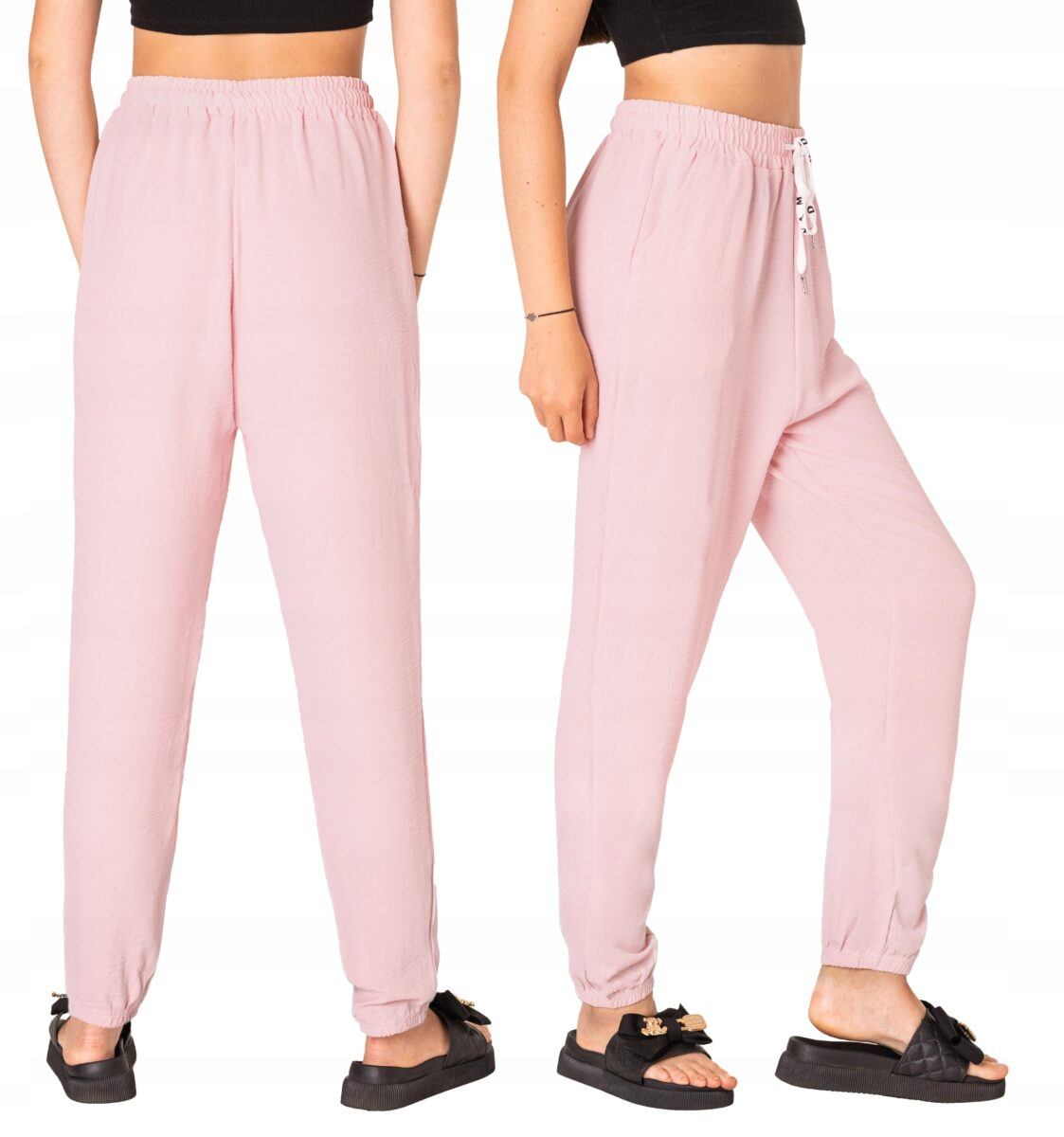 Wyjątkowo lekkie i przewiewne damskie spodnie bawełniane z wysokim stanem i luźną, zwężaną nogawką zakończoną ściągaczem to jeden z najczęściej wybieranych na ciepłe i gorące dni wiosny i lata modeli spodni. Wykonane z wysokiej jakości cienkiej, przewiewnej i oddychającej tkaniny bawełnianej. Dopasowanie w pasie zapewnia szeroki, elastyczny pas ściągający zgrabnie modelujący sylwetkę w talii oraz dodatkowo wpuszczona w pasek ozdobna taśma regulacyjna z możliwością jej zawiązywania. Na bokach spodni dwie wpuszczane kieszonki na dłonie. Odpowiedni na wysokie temperatury luźny krój spodni nie ogranicza swobody ruchów, a niewielka gramatura tkaniny (140 g/m2) pozytywnie wpływa na komfort użytkowania w upalne dni. Idealne na co dzień jako element casualowego stroju czyniąc go lekkim i dostosowanym do wysokich temperatur.
