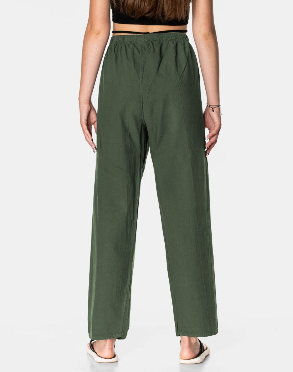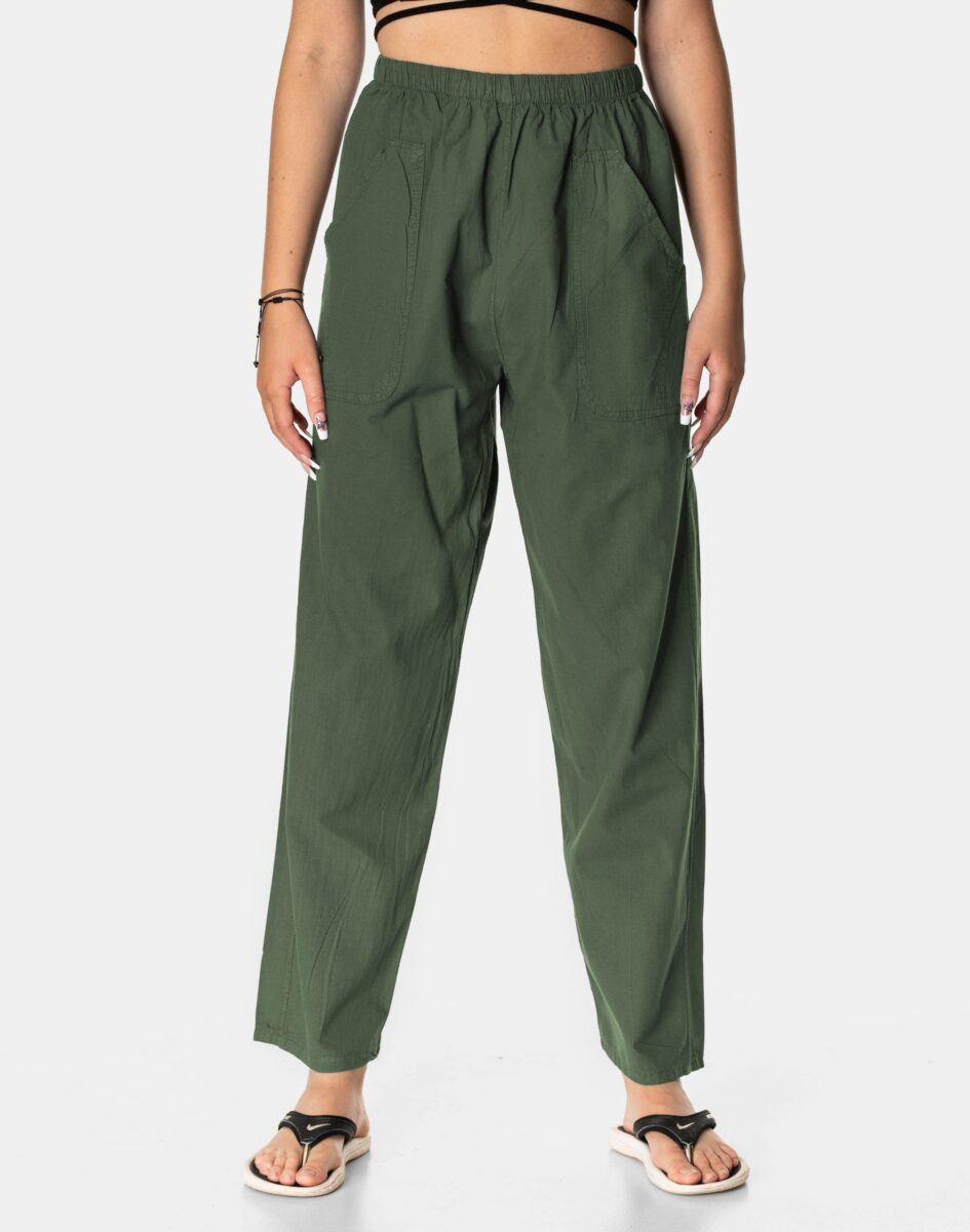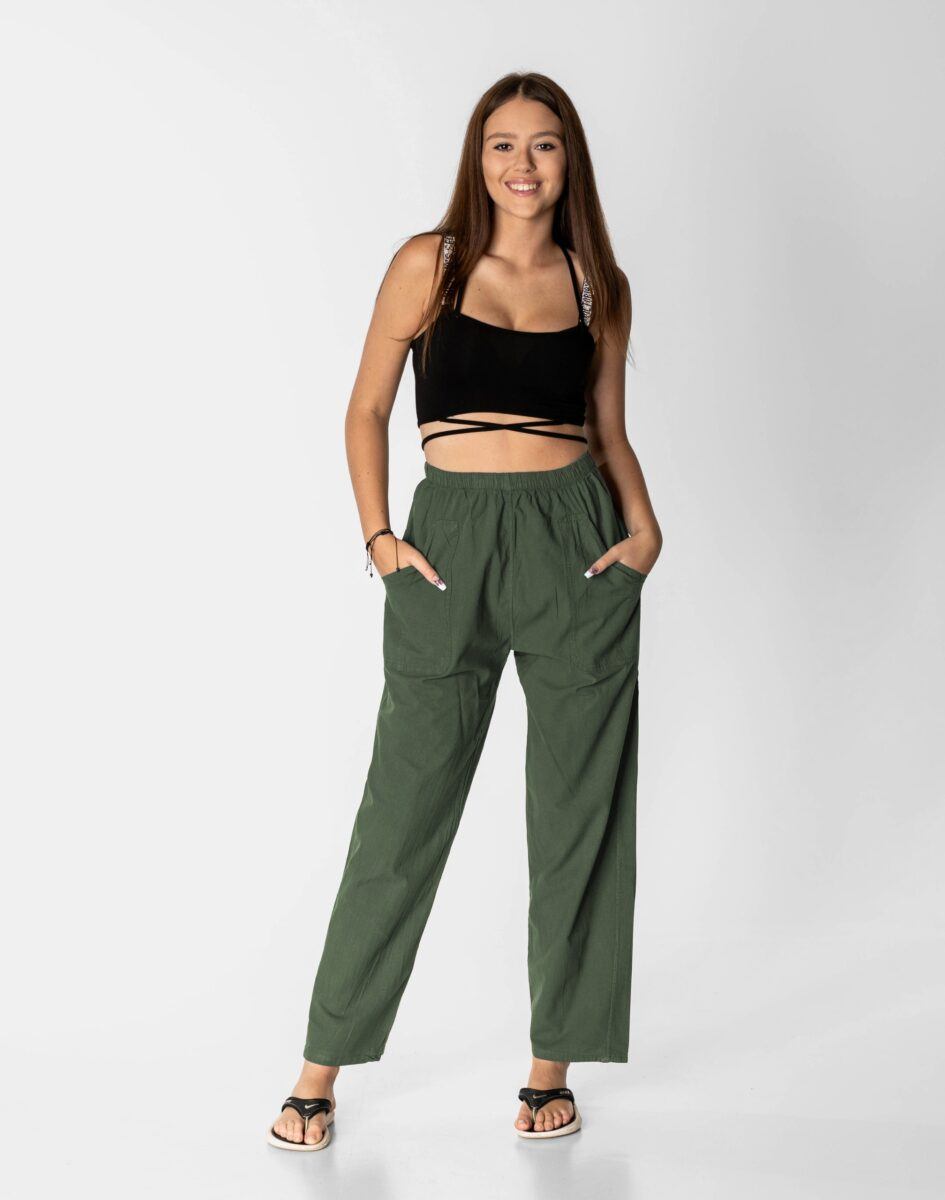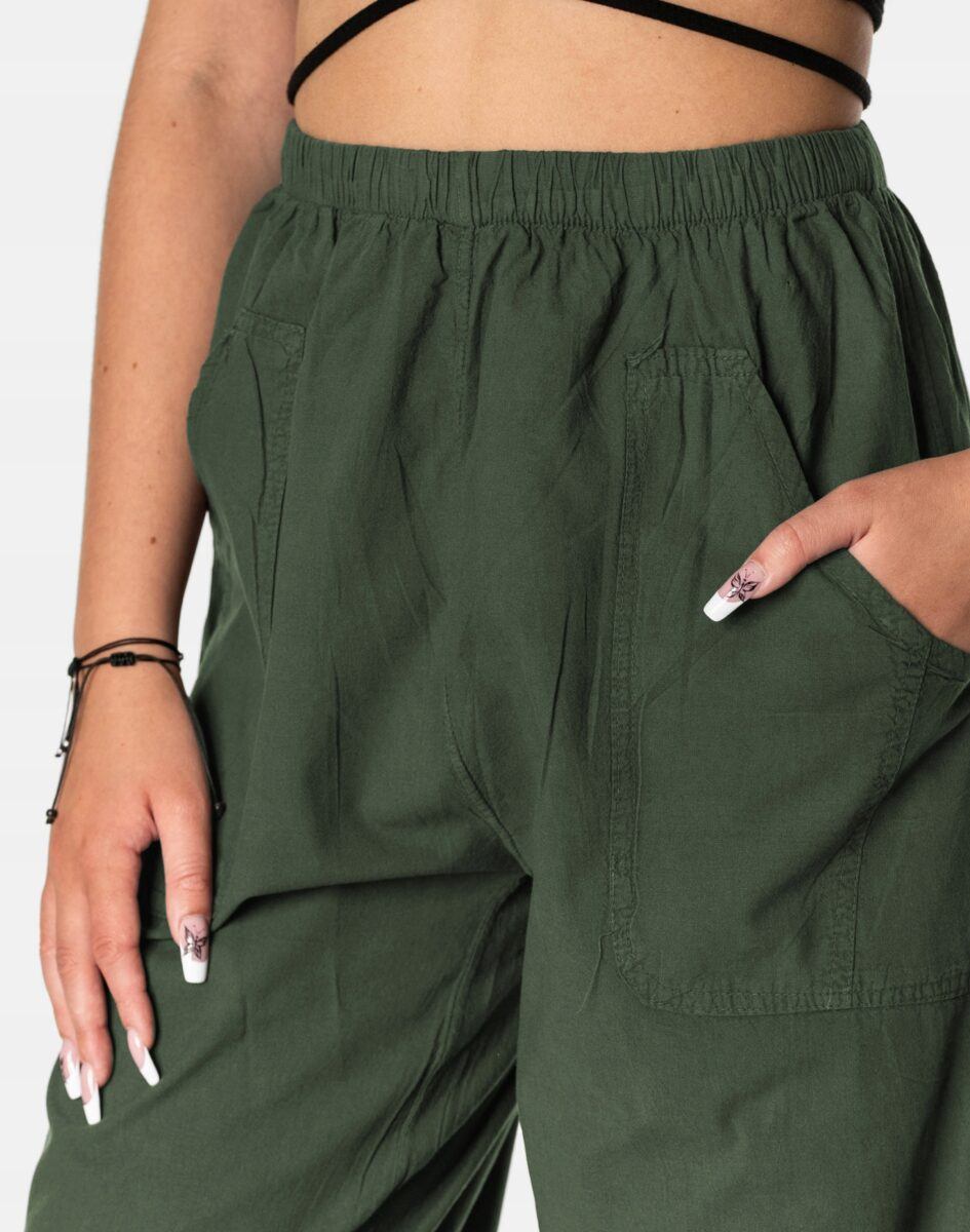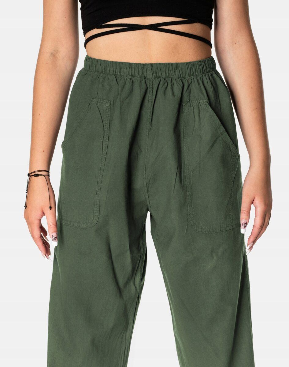 Wyjątkowo lekkie i przewiewne damskie spodnie bawełniane z wysokim stanem i klasyczną prostą luźną nogawką to jeden z najczęściej wybieranych na ciepłe i gorące dni wiosny i lata model spodni. Wykonane z wysokiej jakości cienkiej tkaniny 100% bawełnianej o jednolitym wybarwieniu. Odpowiedni na wysokie temperatury krój spodni nie ogranicza swobody ruchów a niewielka gramatura pozytywnie wpływa na komfort użytkowania. W talii posiadają szeroki elastyczny pas ściągający oraz dodatkowo wpuszczoną w pasek taśmę regulacyjną z możliwością jej zawiązywania. Z przodu dwie wpuszczane zaokrąglone kieszonki na dłonie. Idealne na co dzień jako element casualowego stroju czyniąc go lekkim i dostosowanym do wysokich temperatur.