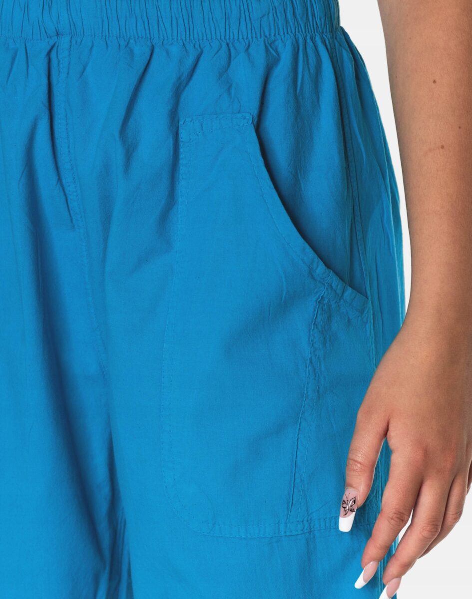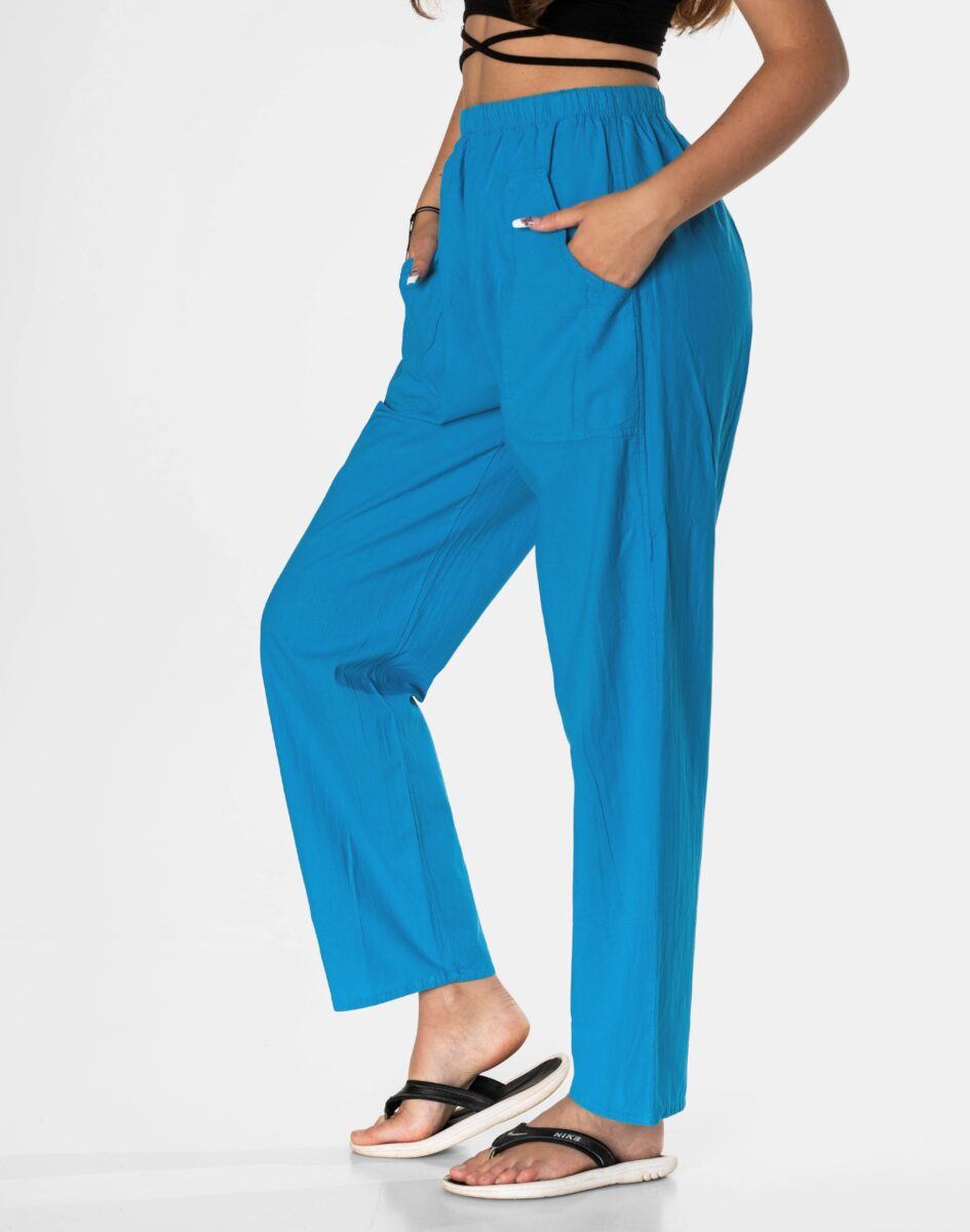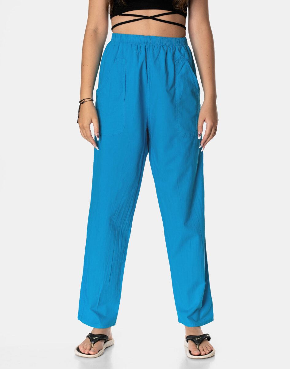 Wyjątkowo lekkie i przewiewne damskie spodnie bawełniane z wysokim stanem i klasyczną prostą luźną nogawką to jeden z najczęściej wybieranych na ciepłe i gorące dni wiosny i lata model spodni. Wykonane z wysokiej jakości cienkiej tkaniny 100% bawełnianej o jednolitym wybarwieniu. Odpowiedni na wysokie temperatury krój spodni nie ogranicza swobody ruchów a niewielka gramatura pozytywnie wpływa na komfort użytkowania. W talii posiadają szeroki elastyczny pas ściągający oraz dodatkowo wpuszczoną w pasek taśmę regulacyjną z możliwością jej zawiązywania. Z przodu dwie wpuszczane zaokrąglone kieszonki na dłonie. Idealne na co dzień jako element casualowego stroju czyniąc go lekkim i dostosowanym do wysokich temperatur.