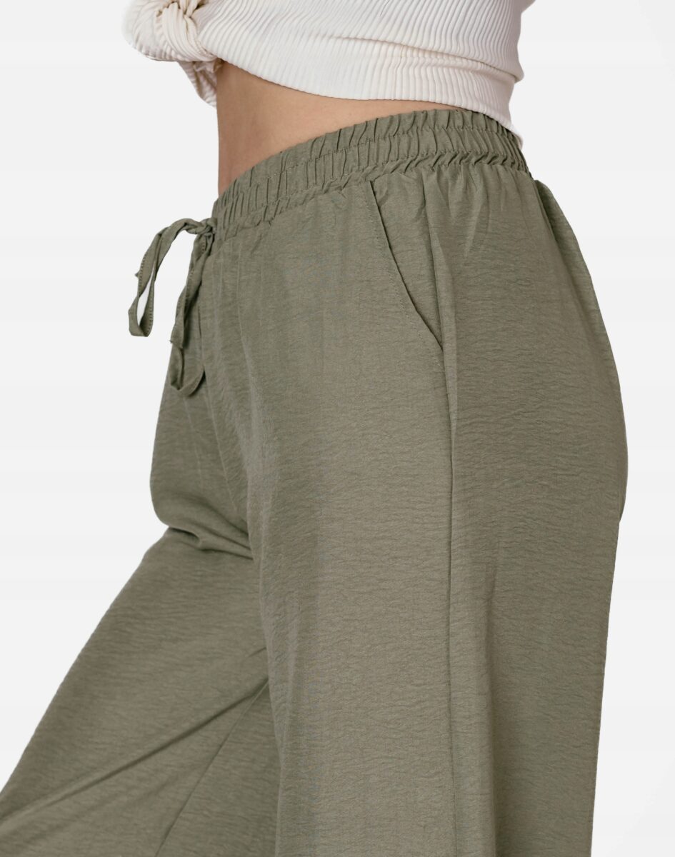 Wyjątkowo lekkie i przewiewne spodnie damskie z wysokim stanem i szeroką, luźną nogawką to jeden z najczęściej wybieranych na ciepłe i gorące dni wiosny i lata modeli spodni. Wykonane z wysokiej jakości cienkiej, przewiewnej i oddychającej tkaniny o jednolitym wybarwieniu. Dopasowanie w pasie zapewnia szeroki, elastyczny pas ściągający zgrabnie modelujący sylwetkę w talii oraz dodatkowo wpuszczona w pasek taśma regulacyjna z możliwością jej zawiązywania. Na bokach spodni dwie wpuszczane kieszonki na dłonie. Odpowiedni na wysokie temperatury luźny krój spodni nie ogranicza swobody ruchów, a niewielka gramatura tkaniny (140 g/m2) pozytywnie wpływa na komfort użytkowania. Idealne na co dzień jako element casualowego stroju czyniąc go lekkim i dostosowanym do wysokich temperatur.