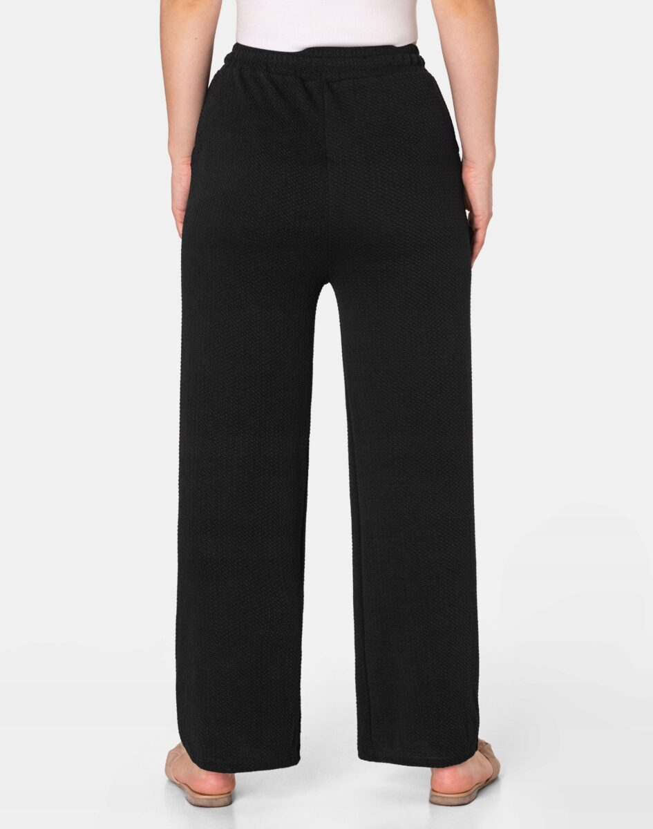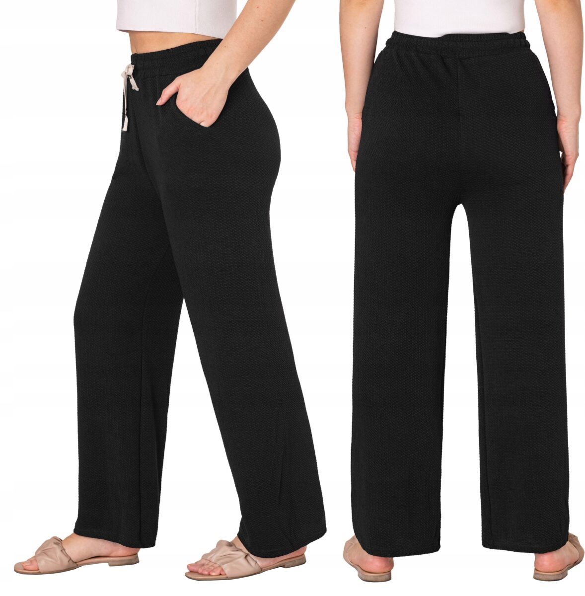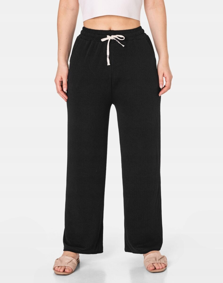 Wyjątkowo lekkie i przewiewne spodnie damskie z wysokim stanem i szeroką, luźną nogawką to jeden z najczęściej wybieranych na ciepłe i gorące dni wiosny i lata modeli spodni. Wykonane z wysokiej jakości cienkiej, przewiewnej i oddychającej tkaniny delikatnie gufrowanej. Dopasowanie w pasie zapewnia szeroki, elastyczny pas ściągający zgrabnie modelujący sylwetkę w talii oraz dodatkowo wpuszczona w pasek taśma regulacyjna z możliwością jej zawiązywania. Na bokach spodni dwie wpuszczane kieszonki na dłonie. Odpowiedni na wysokie temperatury luźny krój spodni nie ogranicza swobody ruchów, a niewielka gramatura tkaniny (140 g/m2) pozytywnie wpływa na komfort użytkowania. Idealne na co dzień jako element casualowego stroju czyniąc go lekkim i dostosowanym do wysokich temperatur.