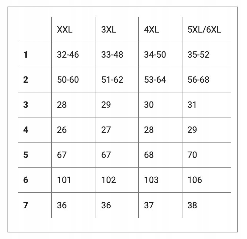 Proszę nie sugerować się rozmiarem podanym na metce przez producenta ( np: XXL, 4XL czy 5XL/6XL) ponieważ różne firmy stosują bardzo różne oznaczenia rozmiaru na co my jako sprzedawcy na Allegro nie mamy żadnego wpływu. Najlepiej jest zmierzyć się dokładnie centymetrem a następnie porównać swoje wymiary z tabelą wymiarów podaną przez nas na aukcji i wybrać odpowiedni rozmiar.