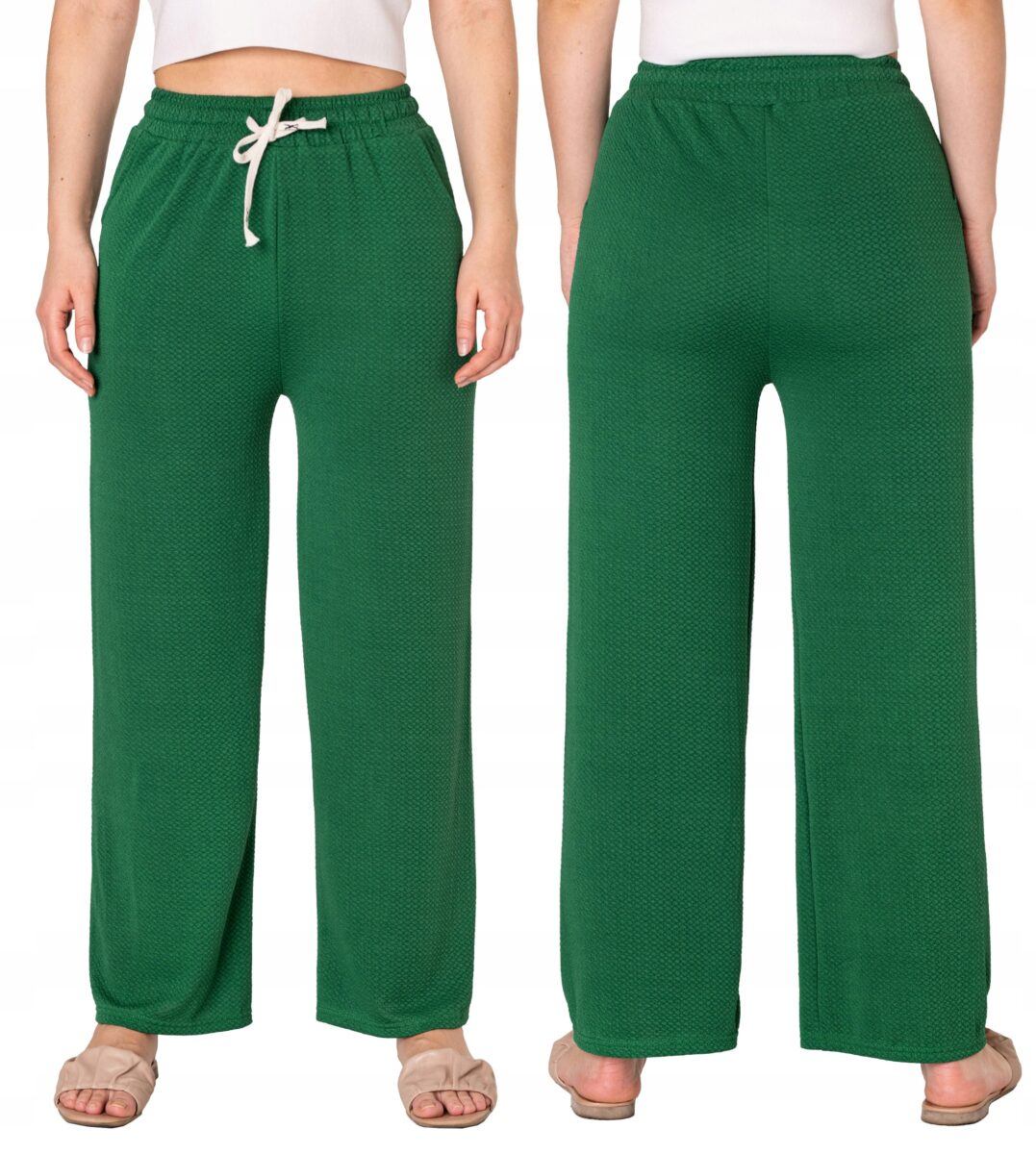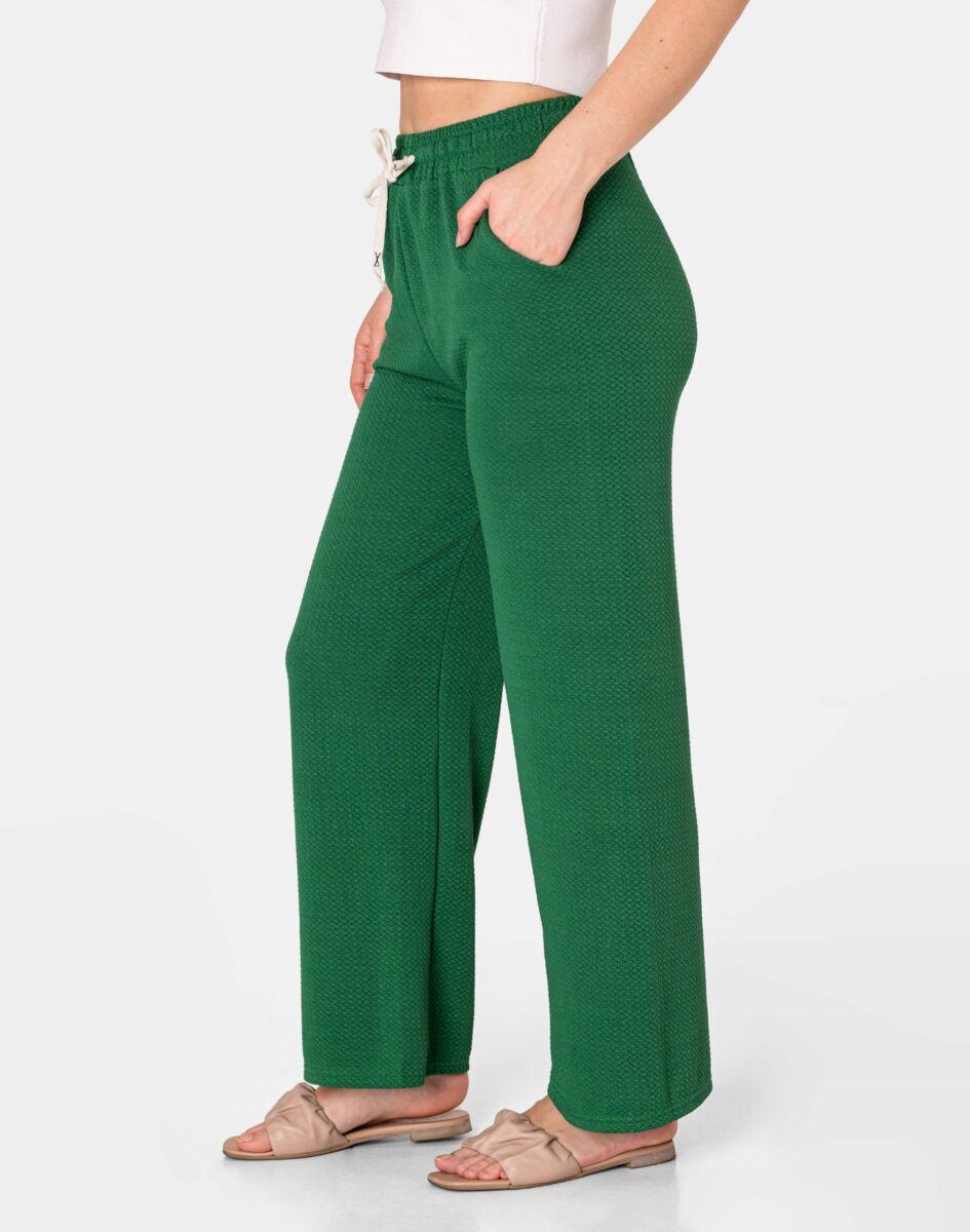 Wyjątkowo lekkie i przewiewne spodnie damskie z wysokim stanem i szeroką, luźną nogawką to jeden z najczęściej wybieranych na ciepłe i gorące dni wiosny i lata modeli spodni. Wykonane z wysokiej jakości cienkiej, przewiewnej i oddychającej tkaniny delikatnie gufrowanej. Dopasowanie w pasie zapewnia szeroki, elastyczny pas ściągający zgrabnie modelujący sylwetkę w talii oraz dodatkowo wpuszczona w pasek taśma regulacyjna z możliwością jej zawiązywania. Na bokach spodni dwie wpuszczane kieszonki na dłonie. Odpowiedni na wysokie temperatury luźny krój spodni nie ogranicza swobody ruchów, a niewielka gramatura tkaniny (140 g/m2) pozytywnie wpływa na komfort użytkowania. Idealne na co dzień jako element casualowego stroju czyniąc go lekkim i dostosowanym do wysokich temperatur.