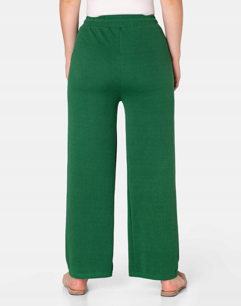 Wyjątkowo lekkie i przewiewne spodnie damskie z wysokim stanem i szeroką, luźną nogawką to jeden z najczęściej wybieranych na ciepłe i gorące dni wiosny i lata modeli spodni. Wykonane z wysokiej jakości cienkiej, przewiewnej i oddychającej tkaniny delikatnie gufrowanej. Dopasowanie w pasie zapewnia szeroki, elastyczny pas ściągający zgrabnie modelujący sylwetkę w talii oraz dodatkowo wpuszczona w pasek taśma regulacyjna z możliwością jej zawiązywania. Na bokach spodni dwie wpuszczane kieszonki na dłonie. Odpowiedni na wysokie temperatury luźny krój spodni nie ogranicza swobody ruchów, a niewielka gramatura tkaniny (140 g/m2) pozytywnie wpływa na komfort użytkowania. Idealne na co dzień jako element casualowego stroju czyniąc go lekkim i dostosowanym do wysokich temperatur.