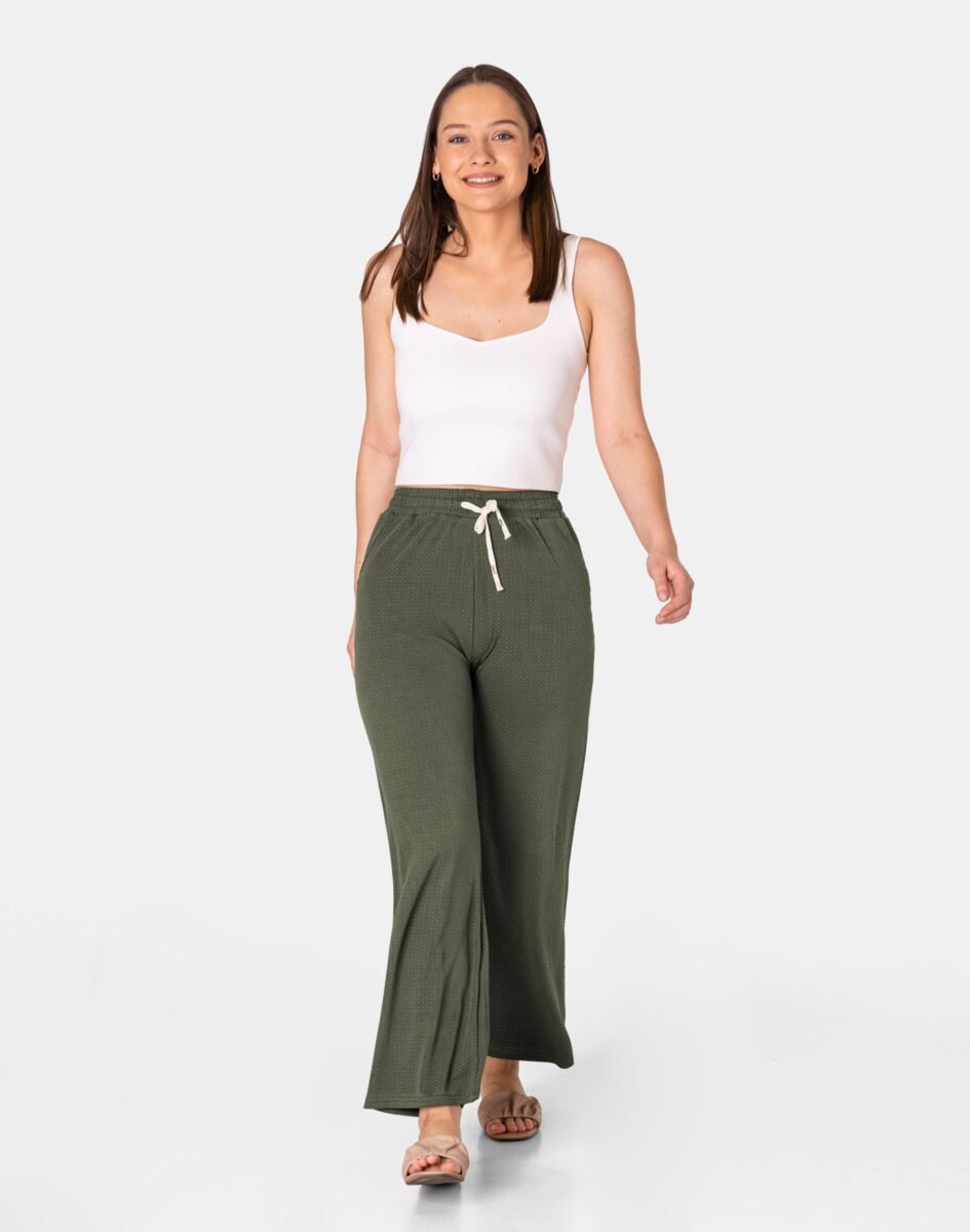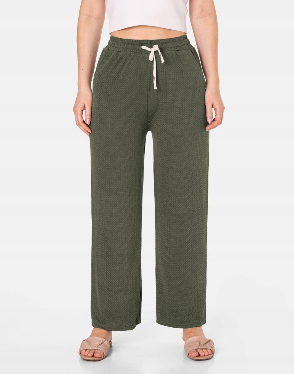 Wyjątkowo lekkie i przewiewne spodnie damskie z wysokim stanem i szeroką, luźną nogawką to jeden z najczęściej wybieranych na ciepłe i gorące dni wiosny i lata modeli spodni. Wykonane z wysokiej jakości cienkiej, przewiewnej i oddychającej tkaniny delikatnie gufrowanej. Dopasowanie w pasie zapewnia szeroki, elastyczny pas ściągający zgrabnie modelujący sylwetkę w talii oraz dodatkowo wpuszczona w pasek taśma regulacyjna z możliwością jej zawiązywania. Na bokach spodni dwie wpuszczane kieszonki na dłonie. Odpowiedni na wysokie temperatury luźny krój spodni nie ogranicza swobody ruchów, a niewielka gramatura tkaniny (140 g/m2) pozytywnie wpływa na komfort użytkowania. Idealne na co dzień jako element casualowego stroju czyniąc go lekkim i dostosowanym do wysokich temperatur.