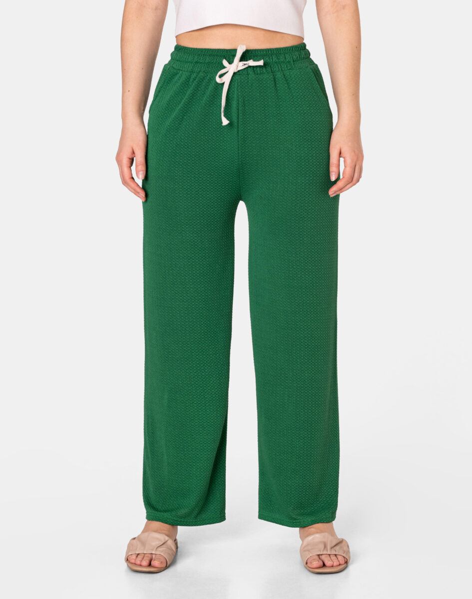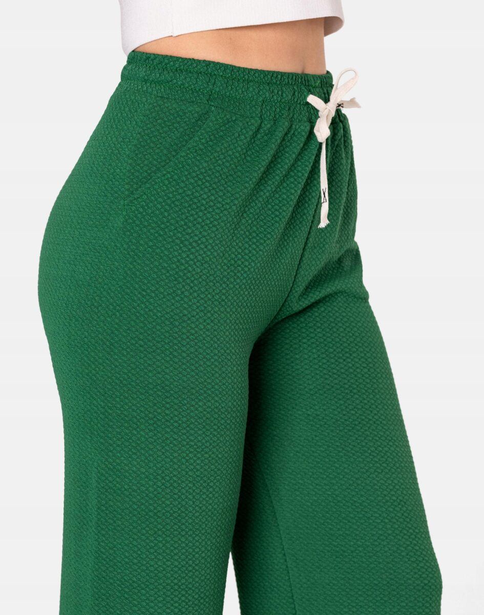 Wyjątkowo lekkie i przewiewne spodnie damskie z wysokim stanem i szeroką, luźną nogawką to jeden z najczęściej wybieranych na ciepłe i gorące dni wiosny i lata modeli spodni. Wykonane z wysokiej jakości cienkiej, przewiewnej i oddychającej tkaniny delikatnie gufrowanej. Dopasowanie w pasie zapewnia szeroki, elastyczny pas ściągający zgrabnie modelujący sylwetkę w talii oraz dodatkowo wpuszczona w pasek taśma regulacyjna z możliwością jej zawiązywania. Na bokach spodni dwie wpuszczane kieszonki na dłonie. Odpowiedni na wysokie temperatury luźny krój spodni nie ogranicza swobody ruchów, a niewielka gramatura tkaniny (140 g/m2) pozytywnie wpływa na komfort użytkowania. Idealne na co dzień jako element casualowego stroju czyniąc go lekkim i dostosowanym do wysokich temperatur.