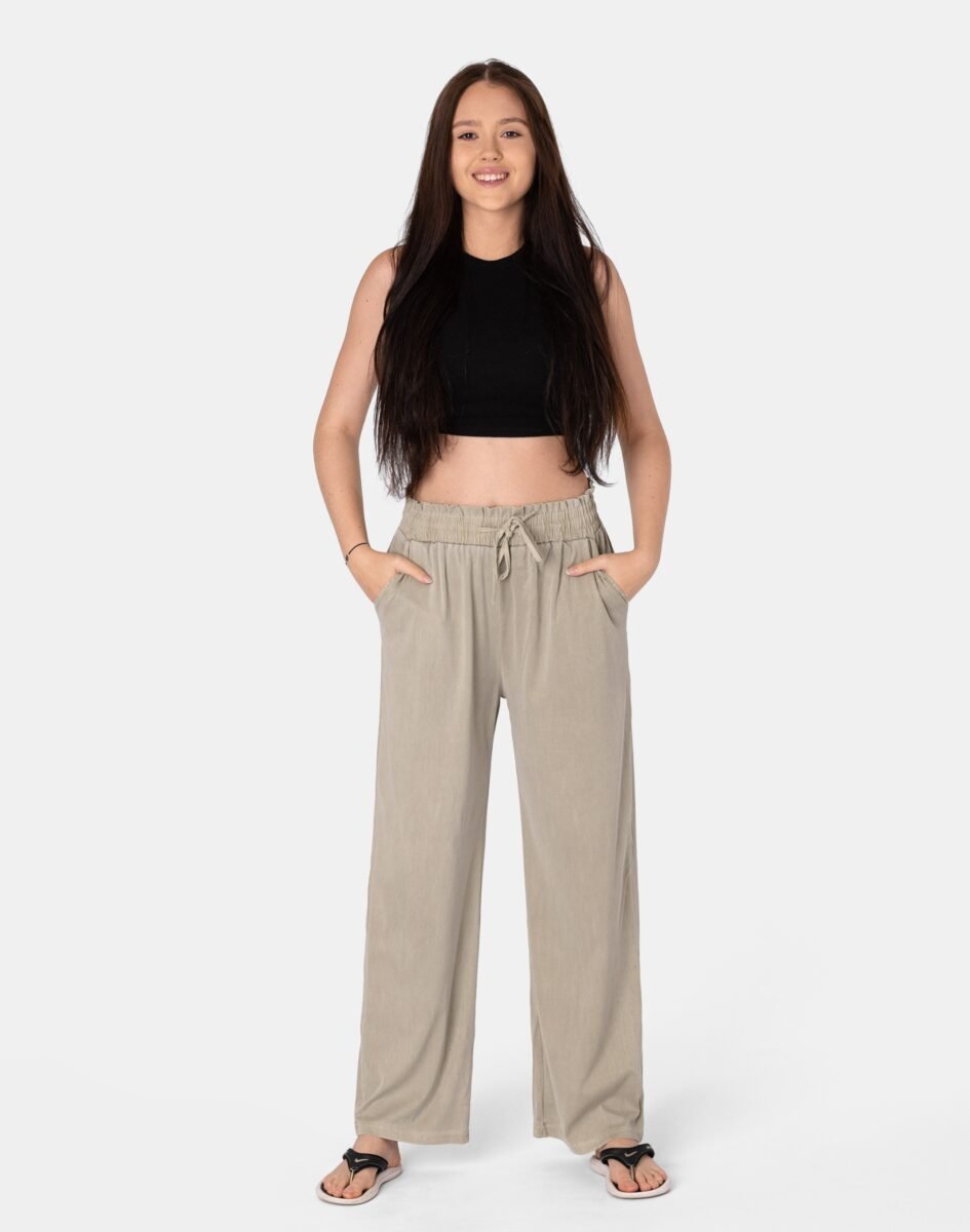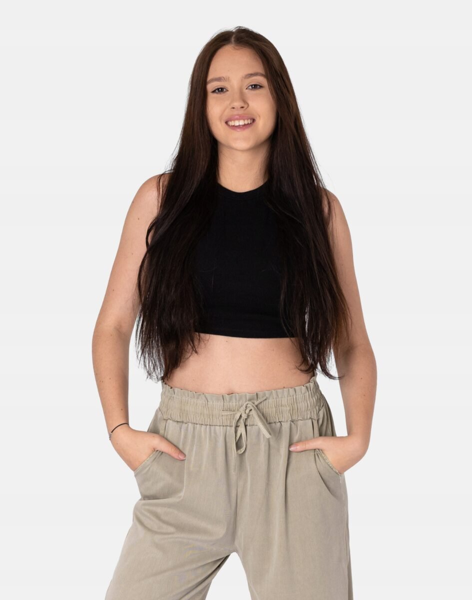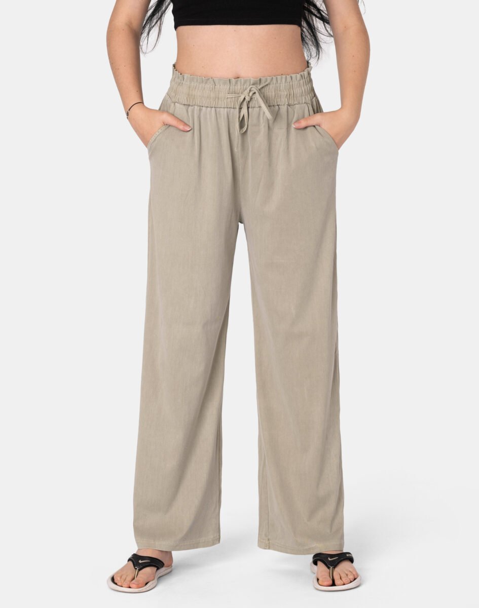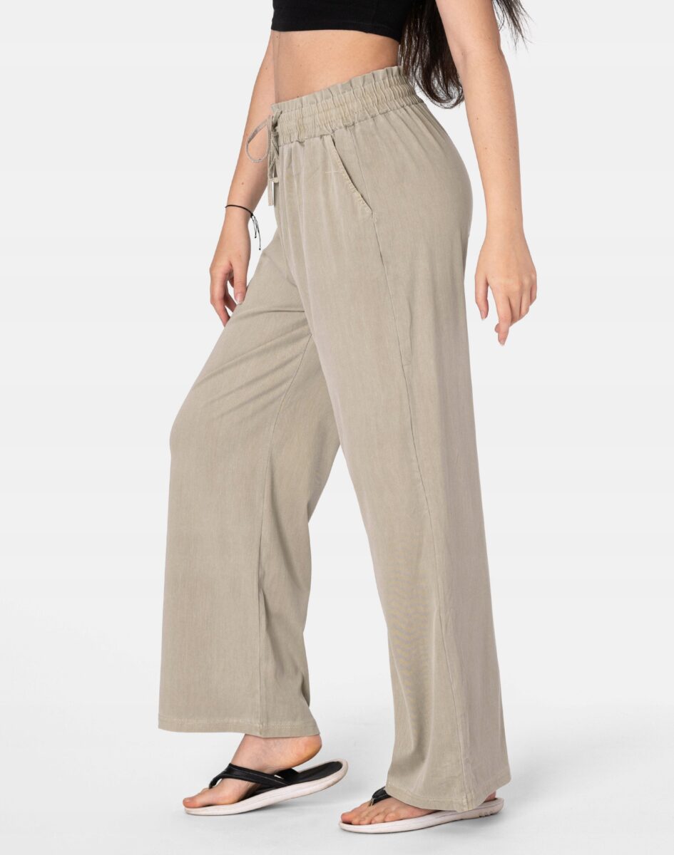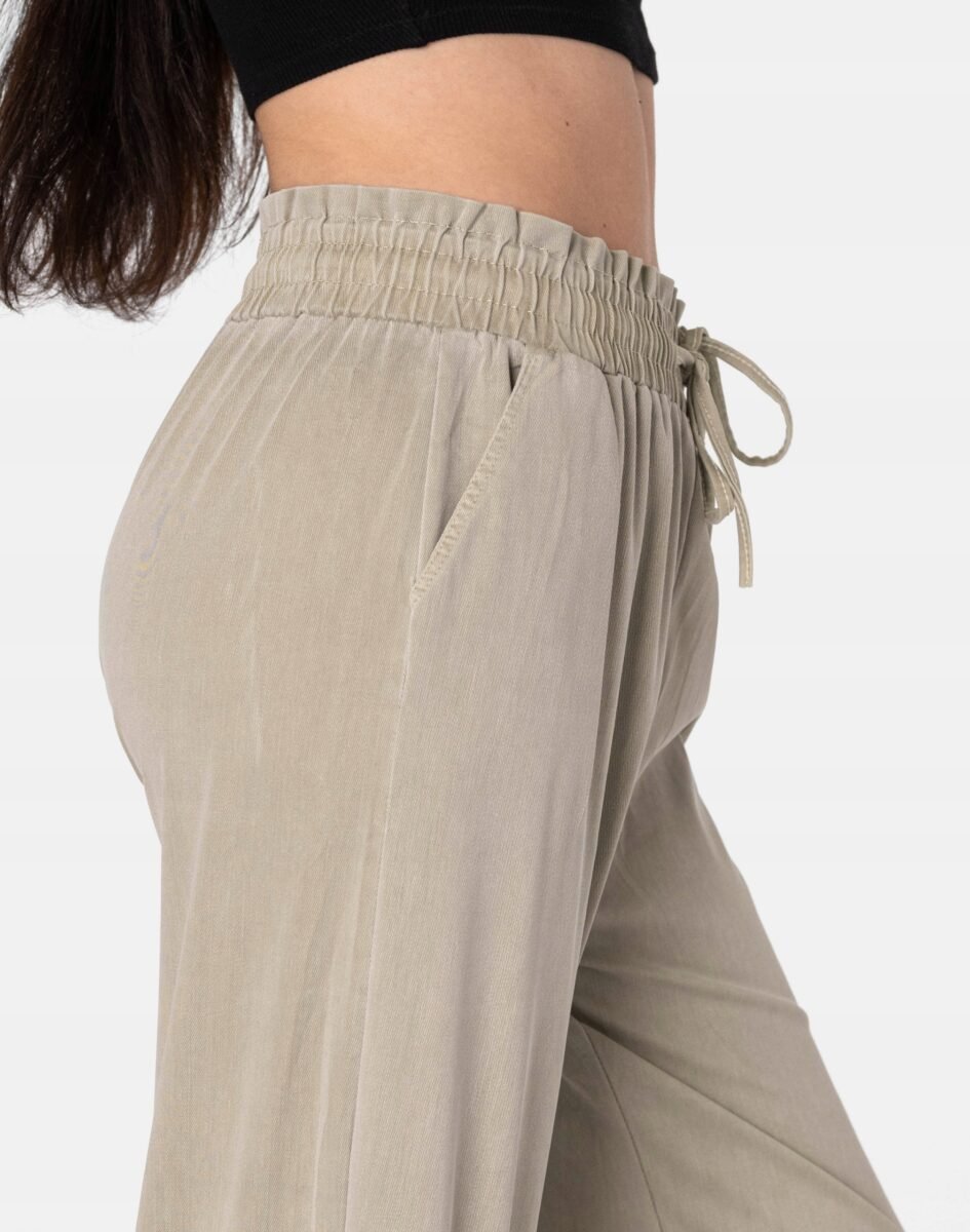 Wyjątkowo lekkie i przewiewne spodnie damskie z wysokim stanem i szeroką, luźną nogawką to jeden z najczęściej wybieranych na ciepłe i gorące dni wiosny i lata modeli spodni. Wykonane z wysokiej jakości cienkiej, przewiewnej i oddychającej tkaniny bawełnianej o jednolitym wybarwieniu. Dopasowanie w pasie zapewnia szeroki, elastyczny pas ściągający zgrabnie modelujący sylwetkę w talii oraz dodatkowo wpuszczona w pasek taśma regulacyjna z możliwością jej zawiązywania. Na bokach spodni dwie wpuszczane kieszonki na dłonie. Odpowiedni na wysokie temperatury luźny krój spodni nie ogranicza swobody ruchów, a niewielka gramatura tkaniny (140 g/m2) pozytywnie wpływa na komfort użytkowania. Idealne na co dzień jako element casualowego stroju czyniąc go lekkim i dostosowanym do wysokich temperatur.