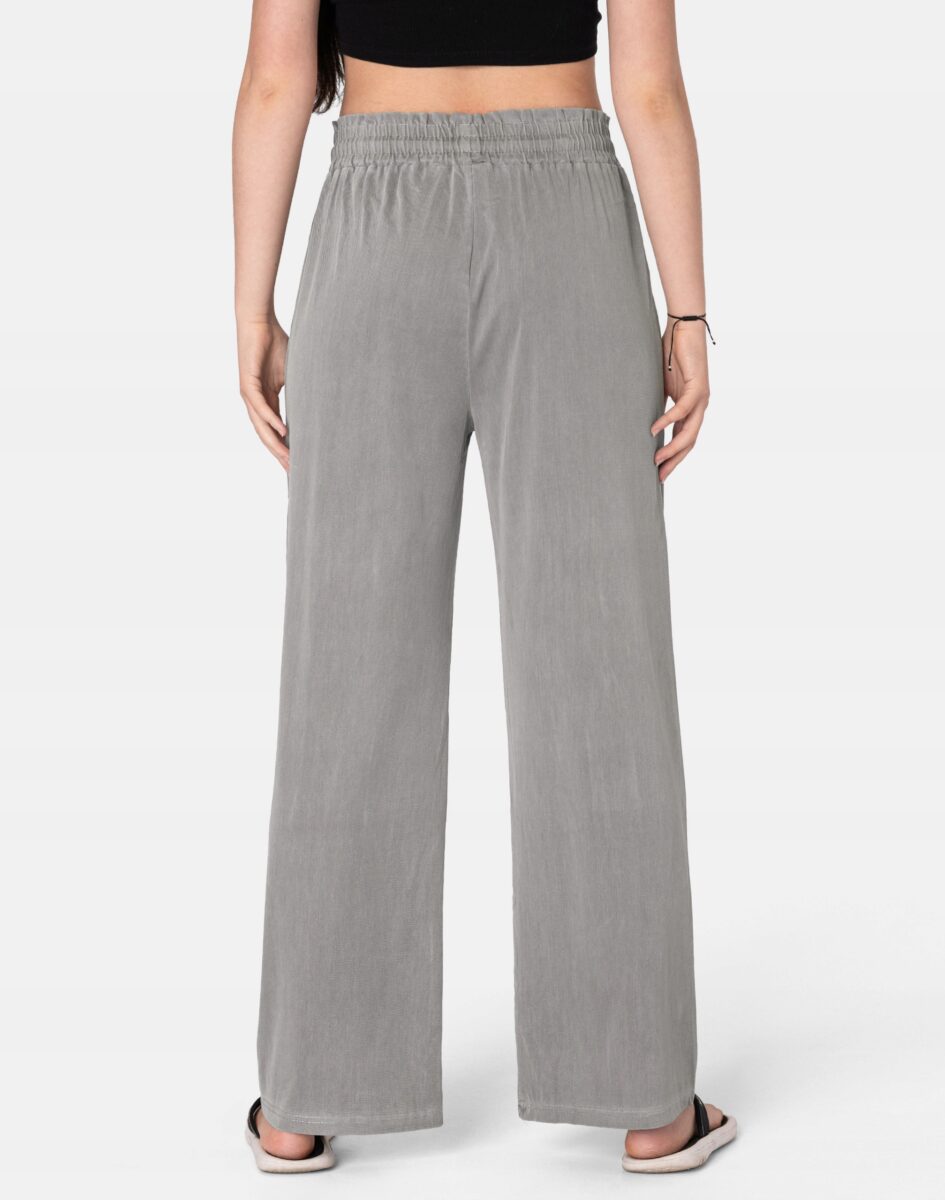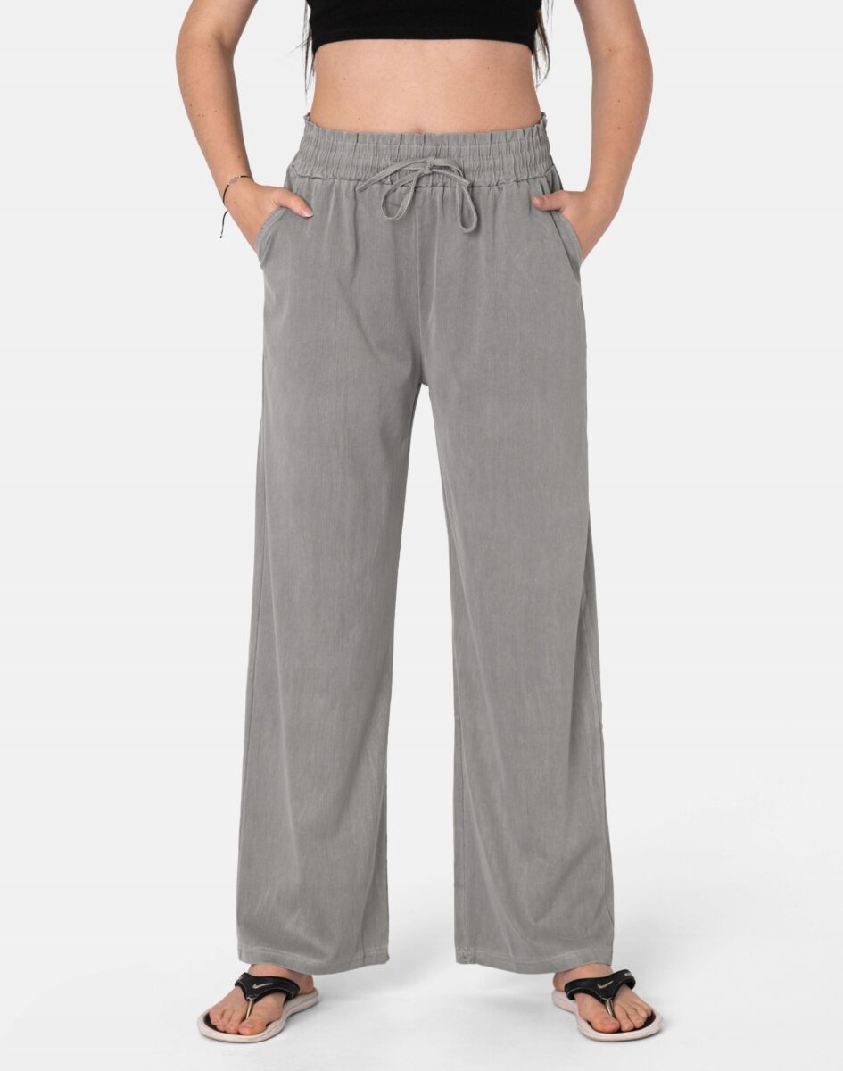 Wyjątkowo lekkie i przewiewne spodnie damskie z wysokim stanem i szeroką, luźną nogawką to jeden z najczęściej wybieranych na ciepłe i gorące dni wiosny i lata modeli spodni. Wykonane z wysokiej jakości cienkiej, przewiewnej i oddychającej tkaniny bawełnianej o jednolitym wybarwieniu. Dopasowanie w pasie zapewnia szeroki, elastyczny pas ściągający zgrabnie modelujący sylwetkę w talii oraz dodatkowo wpuszczona w pasek taśma regulacyjna z możliwością jej zawiązywania. Na bokach spodni dwie wpuszczane kieszonki na dłonie. Odpowiedni na wysokie temperatury luźny krój spodni nie ogranicza swobody ruchów, a niewielka gramatura tkaniny (140 g/m2) pozytywnie wpływa na komfort użytkowania. Idealne na co dzień jako element casualowego stroju czyniąc go lekkim i dostosowanym do wysokich temperatur.