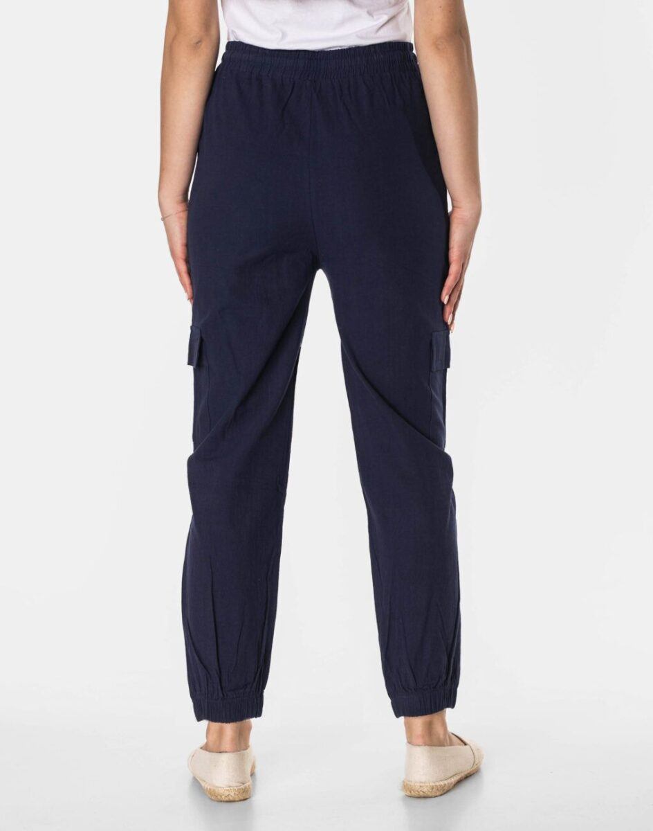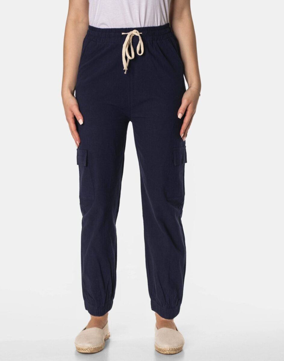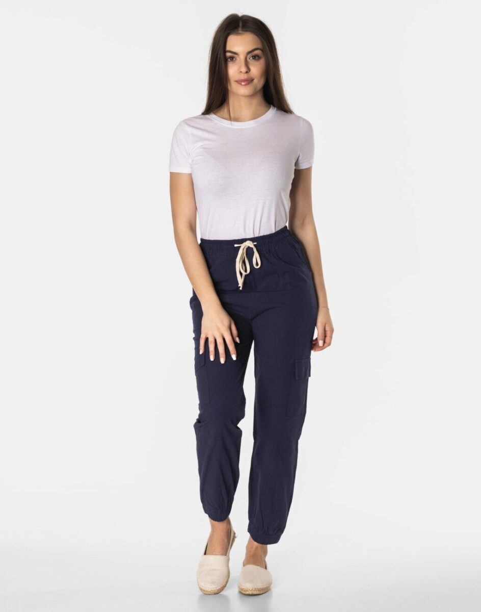 Niesłychanie wygodne, lekkie i przewiewne, damskie spodnie bawełniane z wysokim stanem i zwężaną nogawką zakończoną ściągaczem to jeden z najczęściej wybieranych na ciepłe i gorące dni wiosny i lata modeli spodni. Wykonane z wysokiej jakości cienkiej i oddychającej tkaniny bawełnianej o jednolitym wybarwieniu do złudzenia przypominającej naturalny len. Odpowiedni na wysokie temperatury luźny krój spodni nie ogranicza swobody ruchów, a niewielka gramatura tkaniny (140 g/m2) pozytywnie wpływa na komfort użytkowania. Dopasowanie w talii zapewnia szeroki, elastyczny pas ściągający, oraz dodatkowo wpuszczoną w pasek taśma regulacyjna z możliwością jej zawiązywania. Na bokach spodni dwie wpuszczane kieszonki na dłonie, a na udach dwie dodatkowe kieszonki kryte patkami, dzięki którym spodnie są jeszcze bardziej praktyczne bo schowasz w nich wiele przydatnych przedmiotów.