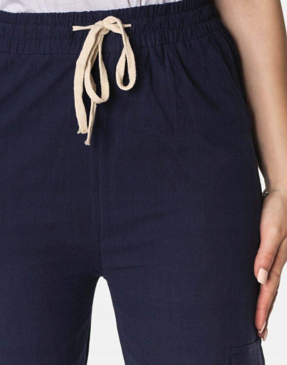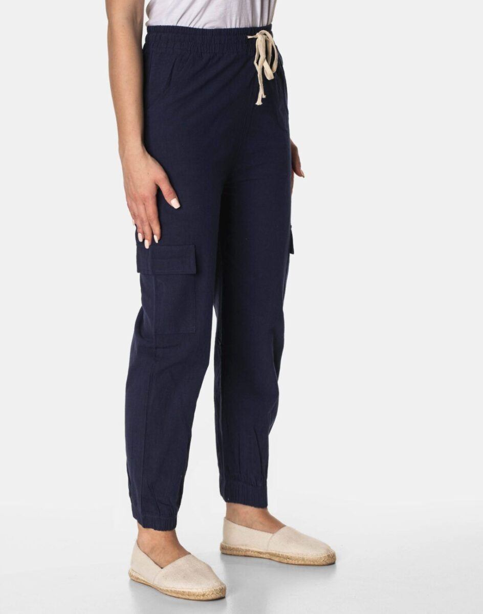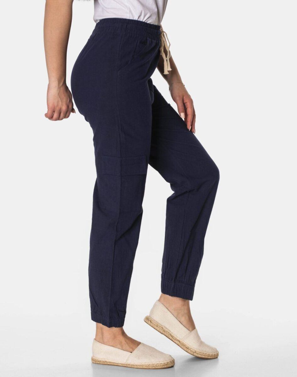 Niesłychanie wygodne, lekkie i przewiewne, damskie spodnie bawełniane z wysokim stanem i zwężaną nogawką zakończoną ściągaczem to jeden z najczęściej wybieranych na ciepłe i gorące dni wiosny i lata modeli spodni. Wykonane z wysokiej jakości cienkiej i oddychającej tkaniny bawełnianej o jednolitym wybarwieniu do złudzenia przypominającej naturalny len. Odpowiedni na wysokie temperatury luźny krój spodni nie ogranicza swobody ruchów, a niewielka gramatura tkaniny (140 g/m2) pozytywnie wpływa na komfort użytkowania. Dopasowanie w talii zapewnia szeroki, elastyczny pas ściągający, oraz dodatkowo wpuszczoną w pasek taśma regulacyjna z możliwością jej zawiązywania. Na bokach spodni dwie wpuszczane kieszonki na dłonie, a na udach dwie dodatkowe kieszonki kryte patkami, dzięki którym spodnie są jeszcze bardziej praktyczne bo schowasz w nich wiele przydatnych przedmiotów.