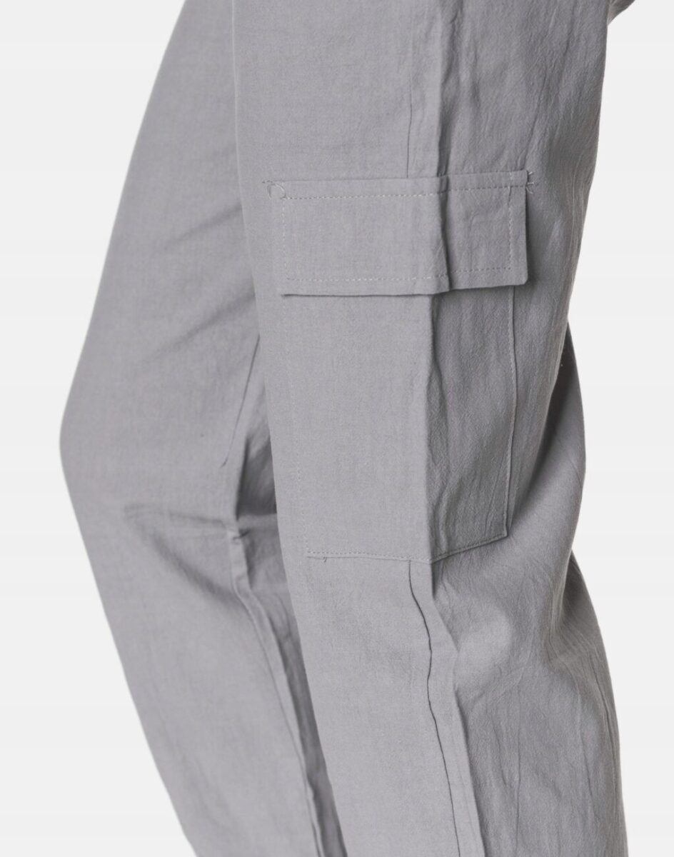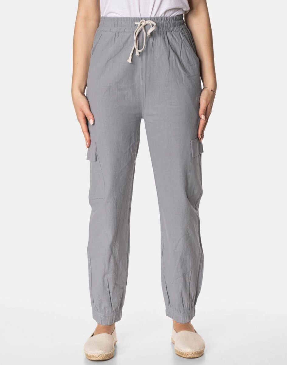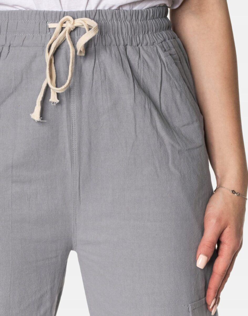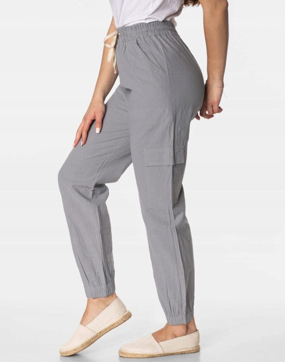 Niesłychanie wygodne, lekkie i przewiewne, damskie spodnie bawełniane z wysokim stanem i zwężaną nogawką zakończoną ściągaczem to jeden z najczęściej wybieranych na ciepłe i gorące dni wiosny i lata modeli spodni. Wykonane z wysokiej jakości cienkiej i oddychającej tkaniny bawełnianej o jednolitym wybarwieniu do złudzenia przypominającej naturalny len. Odpowiedni na wysokie temperatury luźny krój spodni nie ogranicza swobody ruchów, a niewielka gramatura tkaniny (140 g/m2) pozytywnie wpływa na komfort użytkowania. Dopasowanie w talii zapewnia szeroki, elastyczny pas ściągający, oraz dodatkowo wpuszczoną w pasek taśma regulacyjna z możliwością jej zawiązywania. Na bokach spodni dwie wpuszczane kieszonki na dłonie, a na udach dwie dodatkowe kieszonki kryte patkami, dzięki którym spodnie są jeszcze bardziej praktyczne bo schowasz w nich wiele przydatnych przedmiotów.
