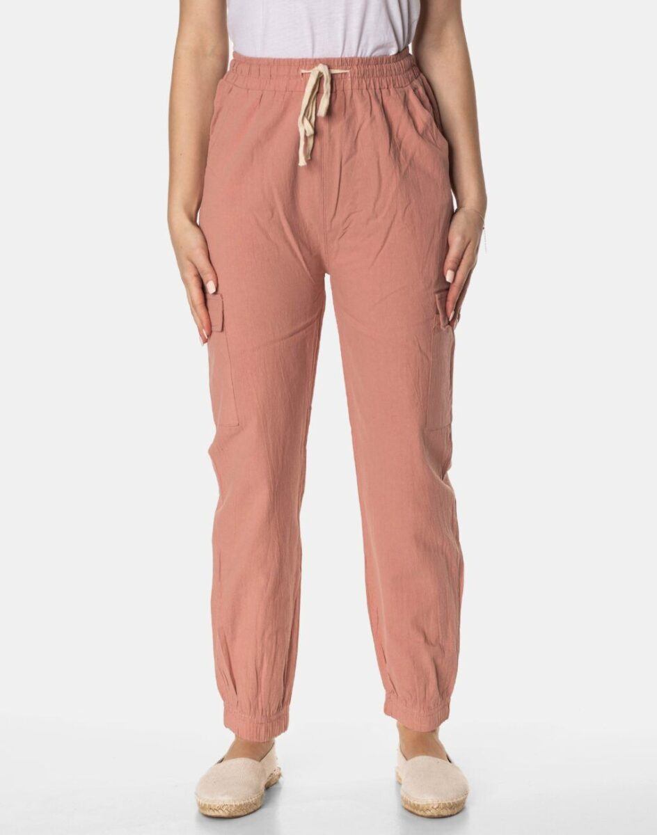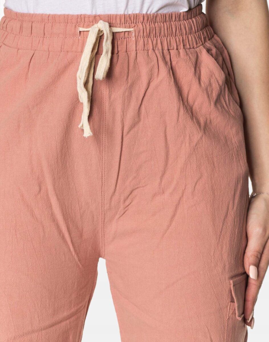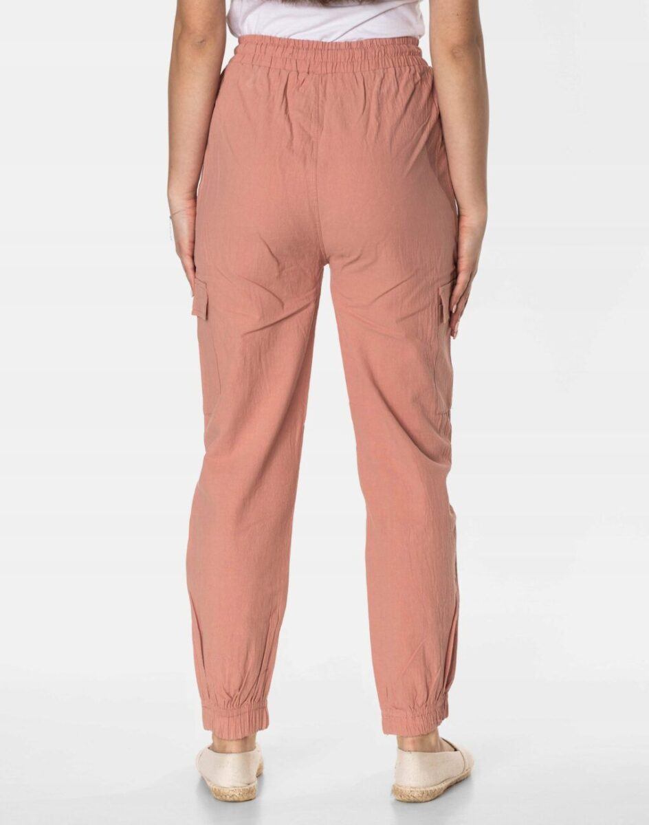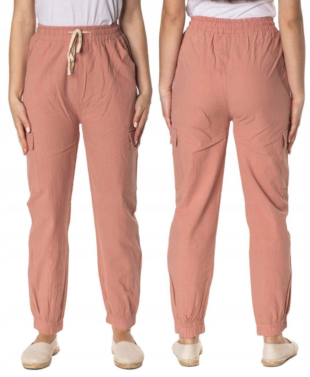 Niesłychanie wygodne, lekkie i przewiewne, damskie spodnie bawełniane z wysokim stanem i zwężaną nogawką zakończoną ściągaczem to jeden z najczęściej wybieranych na ciepłe i gorące dni wiosny i lata modeli spodni. Wykonane z wysokiej jakości cienkiej i oddychającej tkaniny bawełnianej o jednolitym wybarwieniu do złudzenia przypominającej naturalny len. Odpowiedni na wysokie temperatury luźny krój spodni nie ogranicza swobody ruchów, a niewielka gramatura tkaniny (140 g/m2) pozytywnie wpływa na komfort użytkowania. Dopasowanie w talii zapewnia szeroki, elastyczny pas ściągający, oraz dodatkowo wpuszczoną w pasek taśma regulacyjna z możliwością jej zawiązywania. Na bokach spodni dwie wpuszczane kieszonki na dłonie, a na udach dwie dodatkowe kieszonki kryte patkami, dzięki którym spodnie są jeszcze bardziej praktyczne bo schowasz w nich wiele przydatnych przedmiotów.