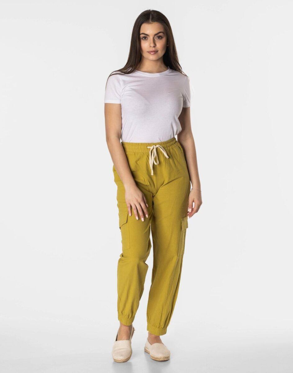 Niesłychanie wygodne, lekkie i przewiewne, damskie spodnie bawełniane z wysokim stanem i zwężaną nogawką zakończoną ściągaczem to jeden z najczęściej wybieranych na ciepłe i gorące dni wiosny i lata modeli spodni. Wykonane z wysokiej jakości cienkiej i oddychającej tkaniny bawełnianej o jednolitym wybarwieniu do złudzenia przypominającej naturalny len. Odpowiedni na wysokie temperatury luźny krój spodni nie ogranicza swobody ruchów, a niewielka gramatura tkaniny (140 g/m2) pozytywnie wpływa na komfort użytkowania. Dopasowanie w talii zapewnia szeroki, elastyczny pas ściągający, oraz dodatkowo wpuszczoną w pasek taśma regulacyjna z możliwością jej zawiązywania. Na bokach spodni dwie wpuszczane kieszonki na dłonie, a na udach dwie dodatkowe kieszonki kryte patkami, dzięki którym spodnie są jeszcze bardziej praktyczne bo schowasz w nich wiele przydatnych przedmiotów.