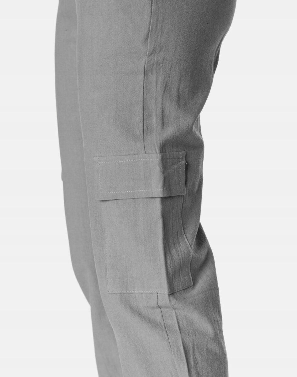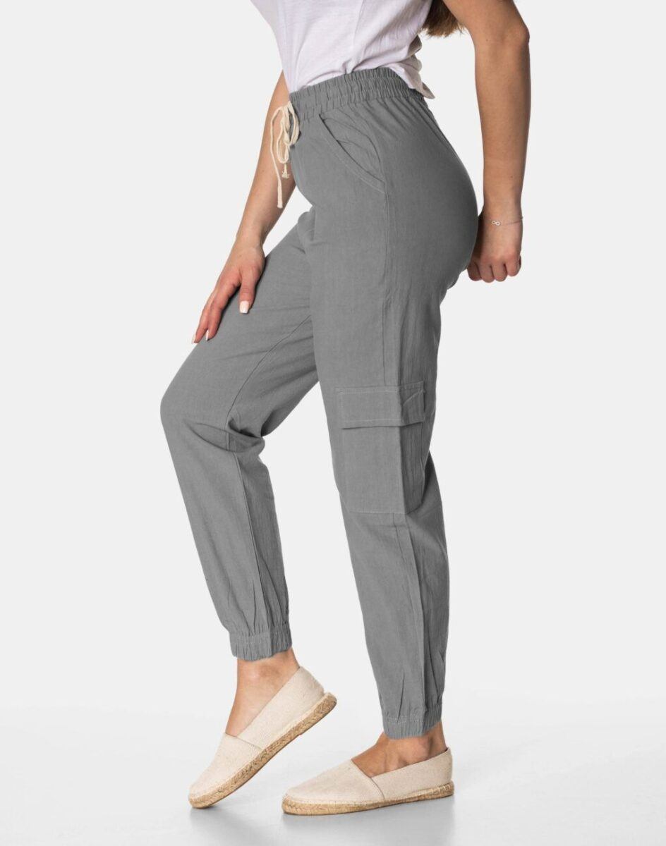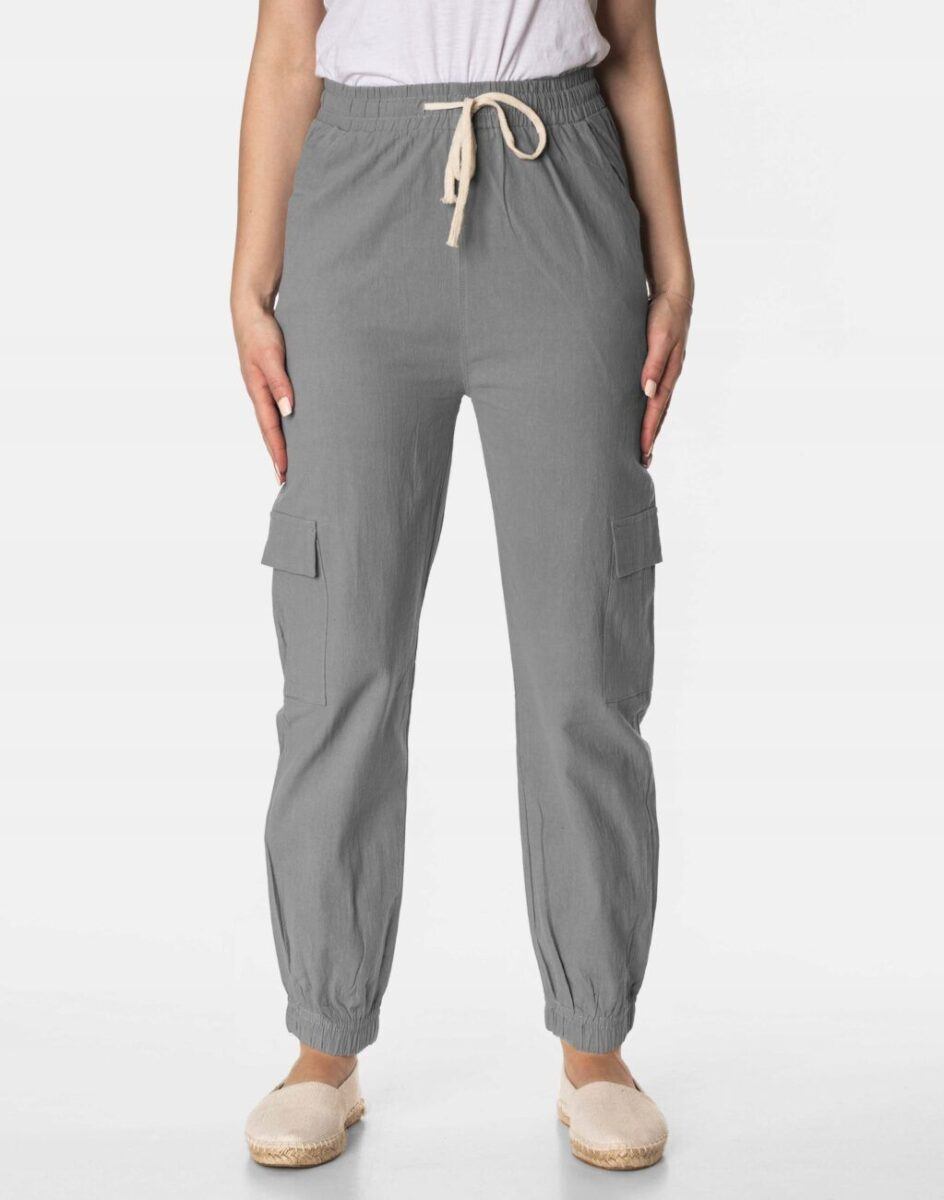 Niesłychanie wygodne, lekkie i przewiewne, damskie spodnie bawełniane z wysokim stanem i zwężaną nogawką zakończoną ściągaczem to jeden z najczęściej wybieranych na ciepłe i gorące dni wiosny i lata modeli spodni. Wykonane z wysokiej jakości cienkiej i oddychającej tkaniny bawełnianej o jednolitym wybarwieniu do złudzenia przypominającej naturalny len. Odpowiedni na wysokie temperatury luźny krój spodni nie ogranicza swobody ruchów, a niewielka gramatura tkaniny (140 g/m2) pozytywnie wpływa na komfort użytkowania. Dopasowanie w talii zapewnia szeroki, elastyczny pas ściągający, oraz dodatkowo wpuszczoną w pasek taśma regulacyjna z możliwością jej zawiązywania. Na bokach spodni dwie wpuszczane kieszonki na dłonie, a na udach dwie dodatkowe kieszonki kryte patkami, dzięki którym spodnie są jeszcze bardziej praktyczne bo schowasz w nich wiele przydatnych przedmiotów.