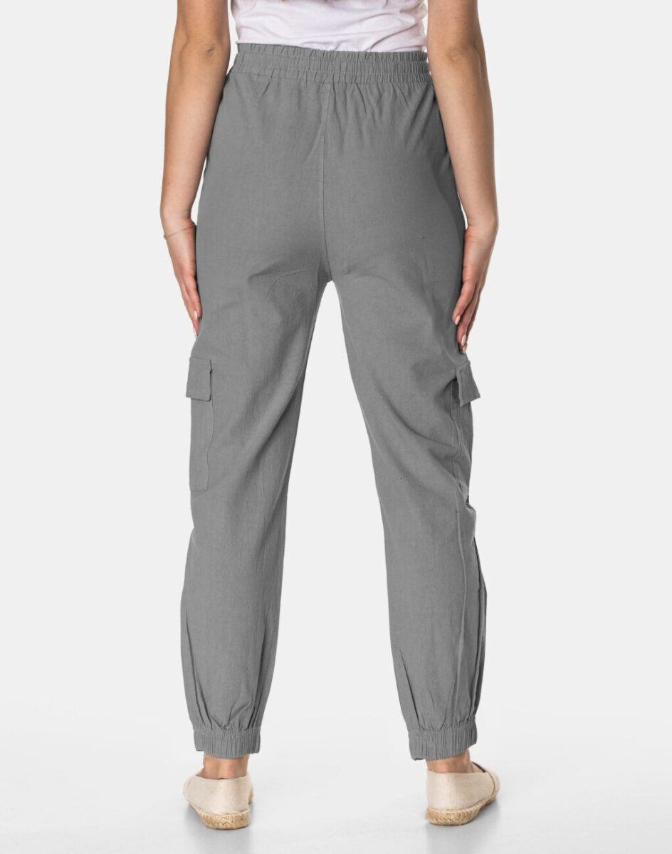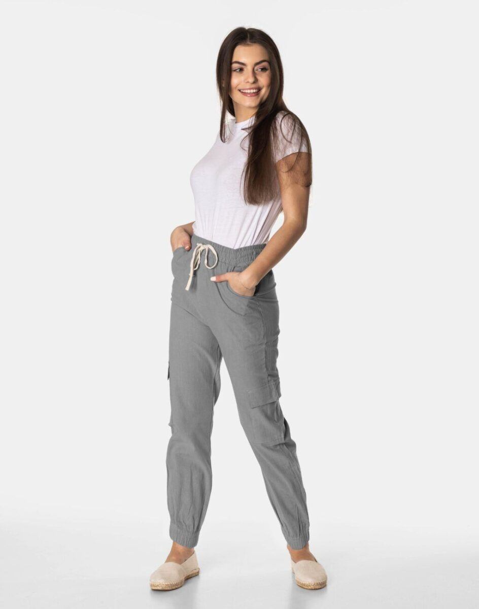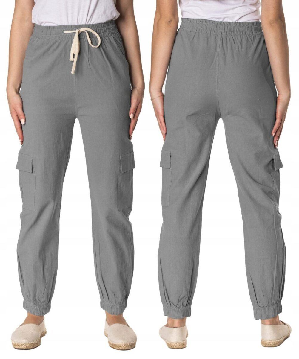 Niesłychanie wygodne, lekkie i przewiewne, damskie spodnie bawełniane z wysokim stanem i zwężaną nogawką zakończoną ściągaczem to jeden z najczęściej wybieranych na ciepłe i gorące dni wiosny i lata modeli spodni. Wykonane z wysokiej jakości cienkiej i oddychającej tkaniny bawełnianej o jednolitym wybarwieniu do złudzenia przypominającej naturalny len. Odpowiedni na wysokie temperatury luźny krój spodni nie ogranicza swobody ruchów, a niewielka gramatura tkaniny (140 g/m2) pozytywnie wpływa na komfort użytkowania. Dopasowanie w talii zapewnia szeroki, elastyczny pas ściągający, oraz dodatkowo wpuszczoną w pasek taśma regulacyjna z możliwością jej zawiązywania. Na bokach spodni dwie wpuszczane kieszonki na dłonie, a na udach dwie dodatkowe kieszonki kryte patkami, dzięki którym spodnie są jeszcze bardziej praktyczne bo schowasz w nich wiele przydatnych przedmiotów.