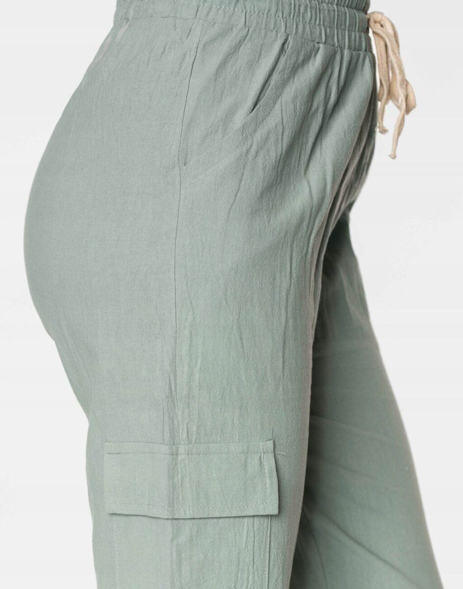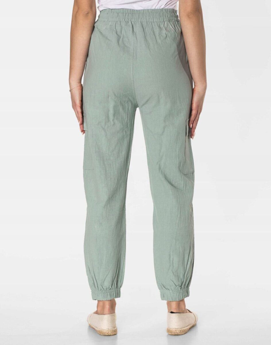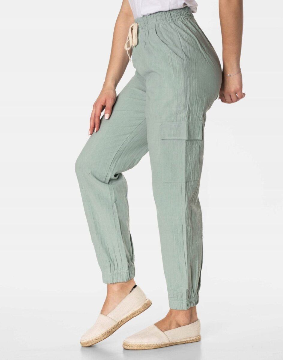 Niesłychanie wygodne, lekkie i przewiewne, damskie spodnie bawełniane z wysokim stanem i zwężaną nogawką zakończoną ściągaczem to jeden z najczęściej wybieranych na ciepłe i gorące dni wiosny i lata modeli spodni. Wykonane z wysokiej jakości cienkiej i oddychającej tkaniny bawełnianej o jednolitym wybarwieniu do złudzenia przypominającej naturalny len. Odpowiedni na wysokie temperatury luźny krój spodni nie ogranicza swobody ruchów, a niewielka gramatura tkaniny (140 g/m2) pozytywnie wpływa na komfort użytkowania. Dopasowanie w talii zapewnia szeroki, elastyczny pas ściągający, oraz dodatkowo wpuszczoną w pasek taśma regulacyjna z możliwością jej zawiązywania. Na bokach spodni dwie wpuszczane kieszonki na dłonie, a na udach dwie dodatkowe kieszonki kryte patkami, dzięki którym spodnie są jeszcze bardziej praktyczne bo schowasz w nich wiele przydatnych przedmiotów.