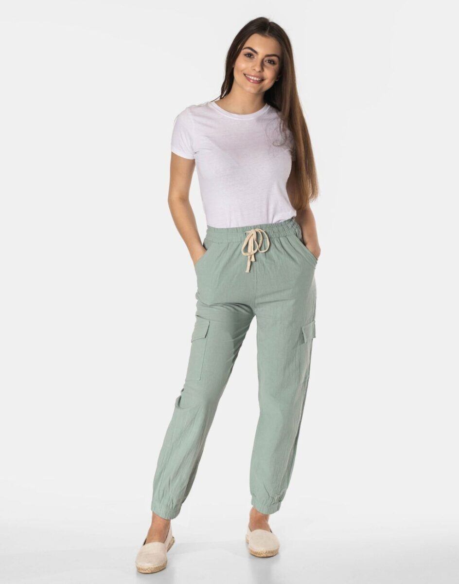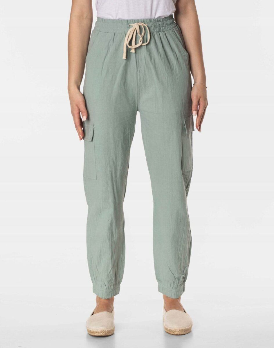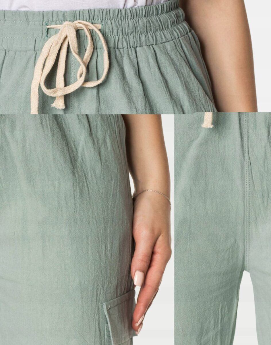Niesłychanie wygodne, lekkie i przewiewne, damskie spodnie bawełniane z wysokim stanem i zwężaną nogawką zakończoną ściągaczem to jeden z najczęściej wybieranych na ciepłe i gorące dni wiosny i lata modeli spodni. Wykonane z wysokiej jakości cienkiej i oddychającej tkaniny bawełnianej o jednolitym wybarwieniu do złudzenia przypominającej naturalny len. Odpowiedni na wysokie temperatury luźny krój spodni nie ogranicza swobody ruchów, a niewielka gramatura tkaniny (140 g/m2) pozytywnie wpływa na komfort użytkowania. Dopasowanie w talii zapewnia szeroki, elastyczny pas ściągający, oraz dodatkowo wpuszczoną w pasek taśma regulacyjna z możliwością jej zawiązywania. Na bokach spodni dwie wpuszczane kieszonki na dłonie, a na udach dwie dodatkowe kieszonki kryte patkami, dzięki którym spodnie są jeszcze bardziej praktyczne bo schowasz w nich wiele przydatnych przedmiotów.