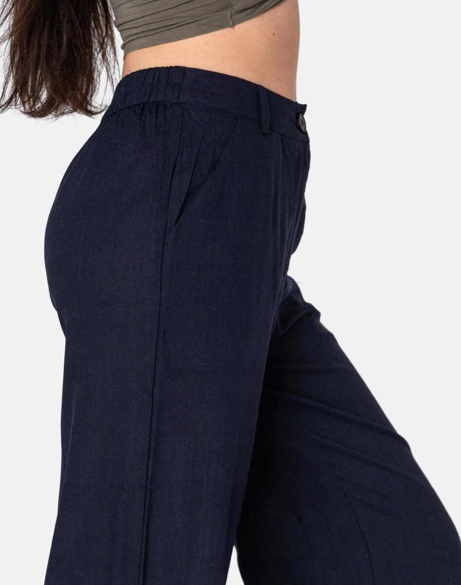 Wyjątkowo lekkie i przewiewne damskie spodnie z wysokim stanem i luźną, szeroką nogawką to jeden z najczęściej wybieranych na ciepłe i gorące dni wiosny i lata modeli spodni. Wykonane z wysokiej jakości cienkiej i oddychającej, zwiewnej tkaniny bawełnianej z dodatkiem naturalnego lnu o jednolitym wybarwieniu. Len jest wytrzymały, przewiewny, dobrze chłonie wilgoć a jednocześnie szybko schnie, przez co zapewnia uczucie suchości i świeżości jak również ma właściwości termoregulacyjne, co sprawia, że jest idealny na ciepłe i gorące dni. Odpowiedni na wysokie temperatury luźny krój spodni palazzo nie ogranicza swobody ruchów, a niewielka gramatura tkaniny (140 g/m2) pozytywnie wpływa na komfort użytkowania. Z założenia wyróżniają się dużą wygodą a dopasowanie w pasie zapewnia szeroki, elastyczny pas ściągający zgrabnie modelujący sylwetkę w talii. W pasie szlufki do stylizacji z paskiem. Na bokach spodni dwie wpuszczane kieszonki na dłonie.