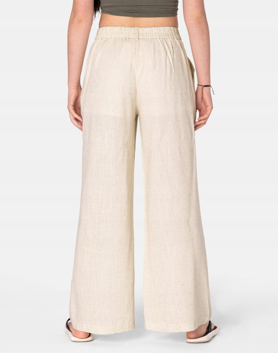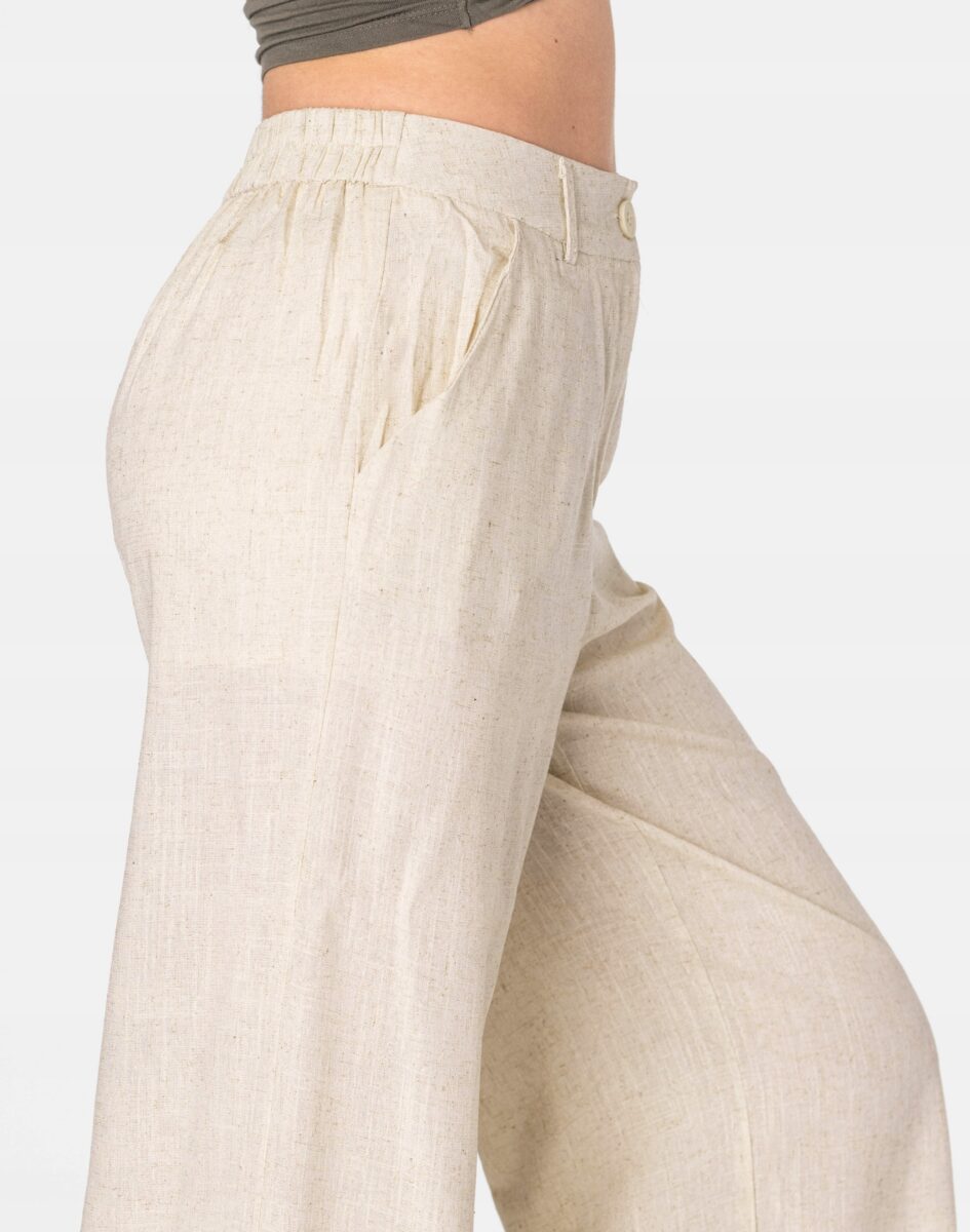 Wyjątkowo lekkie i przewiewne damskie spodnie z wysokim stanem i luźną, szeroką nogawką to jeden z najczęściej wybieranych na ciepłe i gorące dni wiosny i lata modeli spodni. Wykonane z wysokiej jakości cienkiej i oddychającej, zwiewnej tkaniny bawełnianej z dodatkiem naturalnego lnu o jednolitym wybarwieniu. Len jest wytrzymały, przewiewny, dobrze chłonie wilgoć a jednocześnie szybko schnie, przez co zapewnia uczucie suchości i świeżości jak również ma właściwości termoregulacyjne, co sprawia, że jest idealny na ciepłe i gorące dni. Odpowiedni na wysokie temperatury luźny krój spodni palazzo nie ogranicza swobody ruchów, a niewielka gramatura tkaniny (140 g/m2) pozytywnie wpływa na komfort użytkowania. Z założenia wyróżniają się dużą wygodą a dopasowanie w pasie zapewnia szeroki, elastyczny pas ściągający zgrabnie modelujący sylwetkę w talii. W pasie szlufki do stylizacji z paskiem. Na bokach spodni dwie wpuszczane kieszonki na dłonie.
