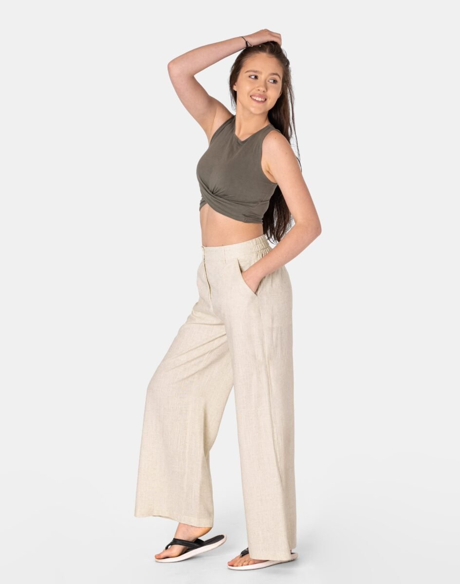 Wyjątkowo lekkie i przewiewne damskie spodnie z wysokim stanem i luźną, szeroką nogawką to jeden z najczęściej wybieranych na ciepłe i gorące dni wiosny i lata modeli spodni. Wykonane z wysokiej jakości cienkiej i oddychającej, zwiewnej tkaniny bawełnianej z dodatkiem naturalnego lnu o jednolitym wybarwieniu. Len jest wytrzymały, przewiewny, dobrze chłonie wilgoć a jednocześnie szybko schnie, przez co zapewnia uczucie suchości i świeżości jak również ma właściwości termoregulacyjne, co sprawia, że jest idealny na ciepłe i gorące dni. Odpowiedni na wysokie temperatury luźny krój spodni palazzo nie ogranicza swobody ruchów, a niewielka gramatura tkaniny (140 g/m2) pozytywnie wpływa na komfort użytkowania. Z założenia wyróżniają się dużą wygodą a dopasowanie w pasie zapewnia szeroki, elastyczny pas ściągający zgrabnie modelujący sylwetkę w talii. W pasie szlufki do stylizacji z paskiem. Na bokach spodni dwie wpuszczane kieszonki na dłonie.