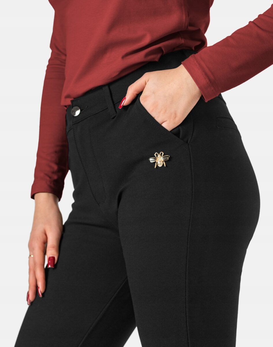 Ciepłe spodnie damskie w kolorze czarnym na jesień/zimę ocieplone od wewnętrznej strony mikropolarem, z zwężanymi nogawkami o wyszczuplającym optycznie kobiecą sylwetkę fasonie i wyższym stanie. Zapinane na kryty zamek błyskawiczny i metalowy guzik sygnowany logiem firmy. Z przodu mają dwie wpuszczane kieszonki na dłonie, a na tyle atrapy kieszeni wpuszczanych. W pasie szlufki umożliwiające stylizacje z paskiem. Wyprodukowane z wysokiej jakości delikatnie elastycznej tkaniny bawełnianej ocieplonej mikropolarem, dostosowanej do użytku w zmiennych warunkach pogodowych i niskiej temperaturze, która zapewnia bardzo wysoki współczynnik ochrony termicznej. Niewielki dodatek spandexu (lycra) sprawia, że spodnie są bardziej elastyczne, dobrze dopasowują się do sylwetki i są bardzo komfortowe w użytkowaniu. Łatwo się je zakłada i są znacznie wygodniejsze od spodni które lycry nie mają. Poza tym bawełna ma tendencję do kurczenia się w praniu a lycra sprawia, że spodnie są wyjątkowo praktyczne i można je bez problemu założyć po wysuszeniu. Pozwalają na pełną swobodę ruchów co daje wygodę przy siadaniu i zapewnia ogromny komfort noszenia.