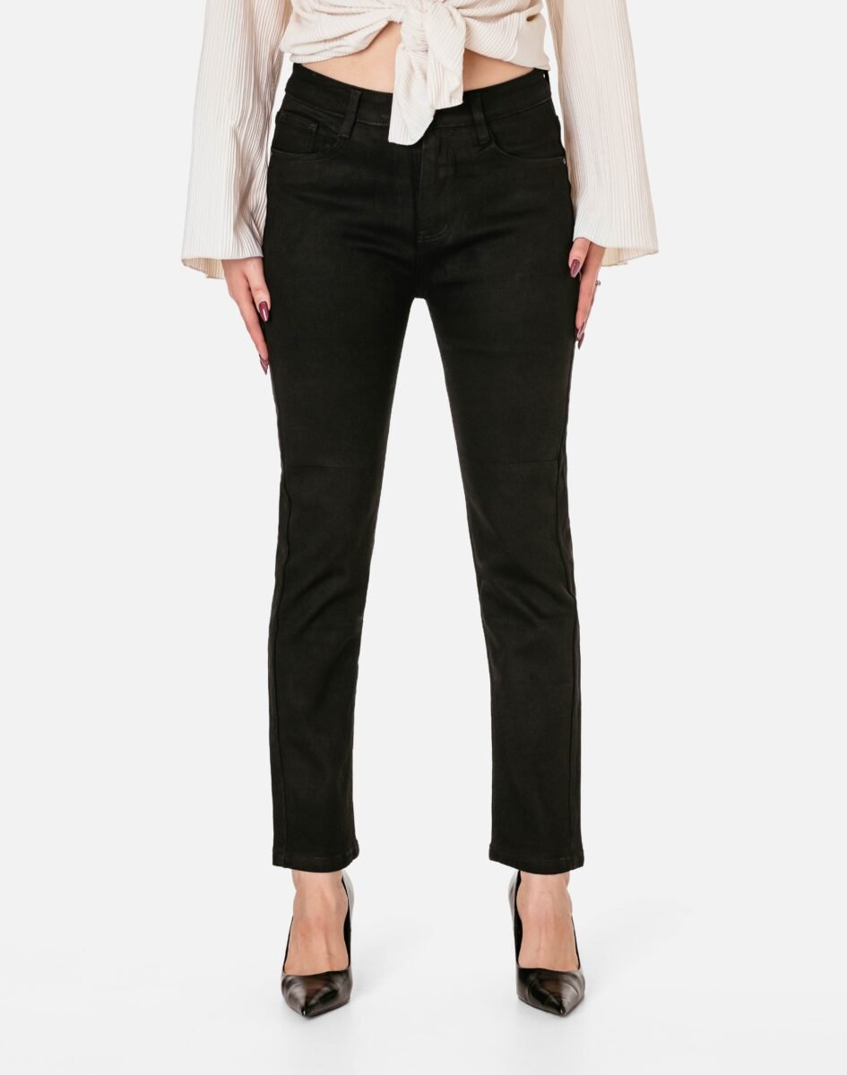 Ciepłe spodnie jeansowe damskie w kolorze czarnym "Super Black" na jesień/zimę ocieplone od wewnętrznej strony polarem, z klasycznymi prostymi nogawkami i wyszczuplającym optycznie kobiecą sylwetkę fasonie i wyższym stanie. Zapinane na kryty zamek błyskawiczny i metalowy guzik sygnowany logiem firmy. Z przodu mają dwie kieszonki zaokrąglone oraz mniejszą kieszonkę tzw. bilonówkę, a na tyle klasyczne kieszenie naszywane jak w typowych spodniach jeansowych. W pasie szlufki umożliwiające stylizacje z paskiem. Najbardziej podatne na uszkodzenia miejsca wzmocnione są dodatkowymi przeszyciami i małymi metalowymi nitami. Wykonane z wysokiej jakości, trwałej i mocnej, delikatnie elastycznej tkaniny jeansowej o jednolitym czarnym wybarwieniu "Super Black". Niewielki dodatek poliestru (lycra) sprawia, że spodnie są bardziej elastyczne, dobrze dopasowują się do sylwetki, i są bardzo komfortowe w użytkowaniu. Łatwo się je zakłada i są znacznie wygodniejsze od jeansów, które lycry nie mają. Poza tym bawełna ma tendencję do kurczenia się w praniu, dlatego lycra sprawia, że spodnie są wyjątkowo praktyczne i można je bez problemu założyć po wysuszeniu. Pozwalają na pełną swobodę ruchów, co daje wygodę przy siadaniu i zapewnia ogromny komfort noszenia.