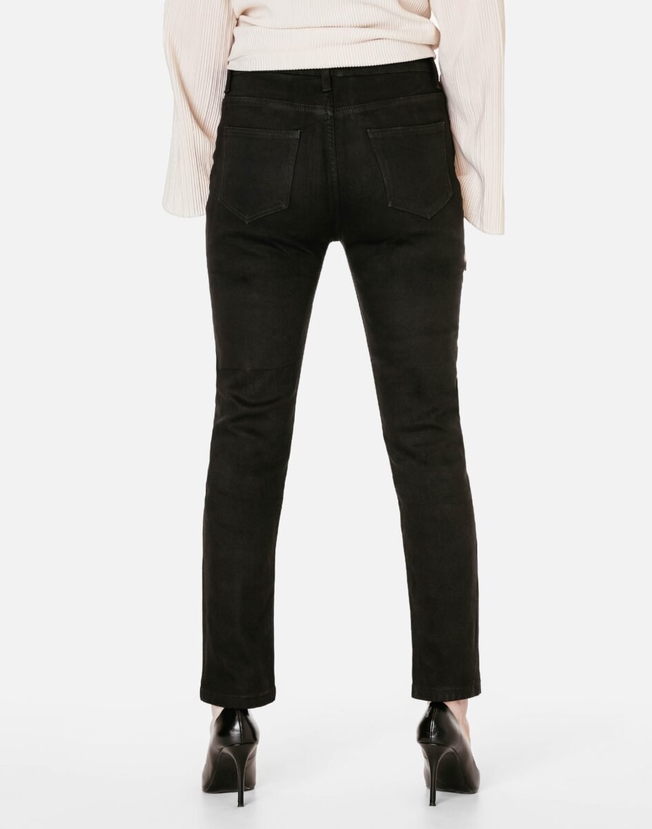 Ciepłe spodnie jeansowe damskie w kolorze czarnym "Super Black" na jesień/zimę ocieplone od wewnętrznej strony polarem, z klasycznymi prostymi nogawkami i wyszczuplającym optycznie kobiecą sylwetkę fasonie i wyższym stanie. Zapinane na kryty zamek błyskawiczny i metalowy guzik sygnowany logiem firmy. Z przodu mają dwie kieszonki zaokrąglone oraz mniejszą kieszonkę tzw. bilonówkę, a na tyle klasyczne kieszenie naszywane jak w typowych spodniach jeansowych. W pasie szlufki umożliwiające stylizacje z paskiem. Najbardziej podatne na uszkodzenia miejsca wzmocnione są dodatkowymi przeszyciami i małymi metalowymi nitami. Wykonane z wysokiej jakości, trwałej i mocnej, delikatnie elastycznej tkaniny jeansowej o jednolitym czarnym wybarwieniu "Super Black". Niewielki dodatek poliestru (lycra) sprawia, że spodnie są bardziej elastyczne, dobrze dopasowują się do sylwetki, i są bardzo komfortowe w użytkowaniu. Łatwo się je zakłada i są znacznie wygodniejsze od jeansów, które lycry nie mają. Poza tym bawełna ma tendencję do kurczenia się w praniu, dlatego lycra sprawia, że spodnie są wyjątkowo praktyczne i można je bez problemu założyć po wysuszeniu. Pozwalają na pełną swobodę ruchów, co daje wygodę przy siadaniu i zapewnia ogromny komfort noszenia.