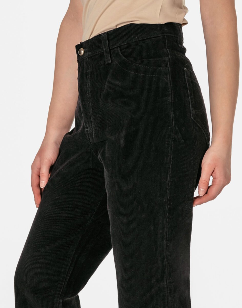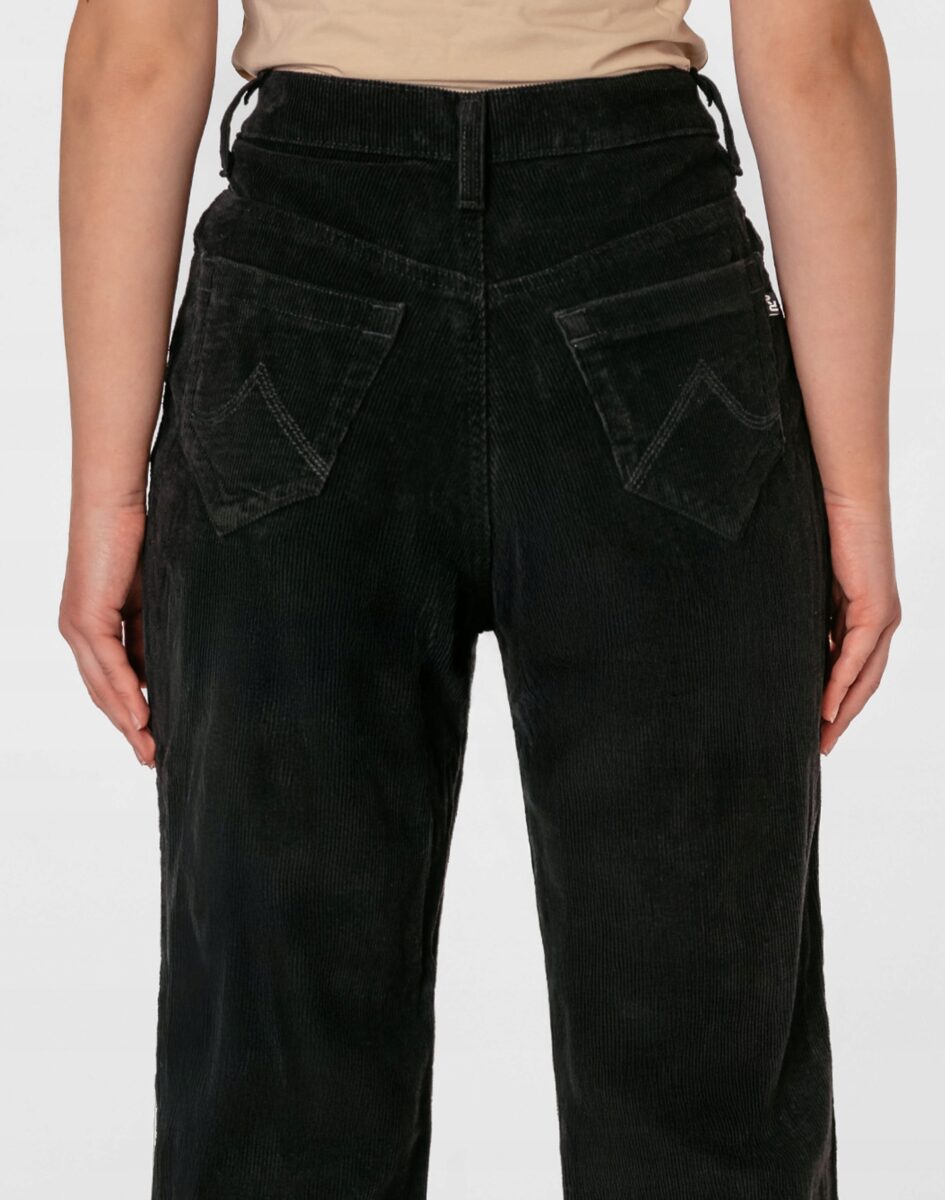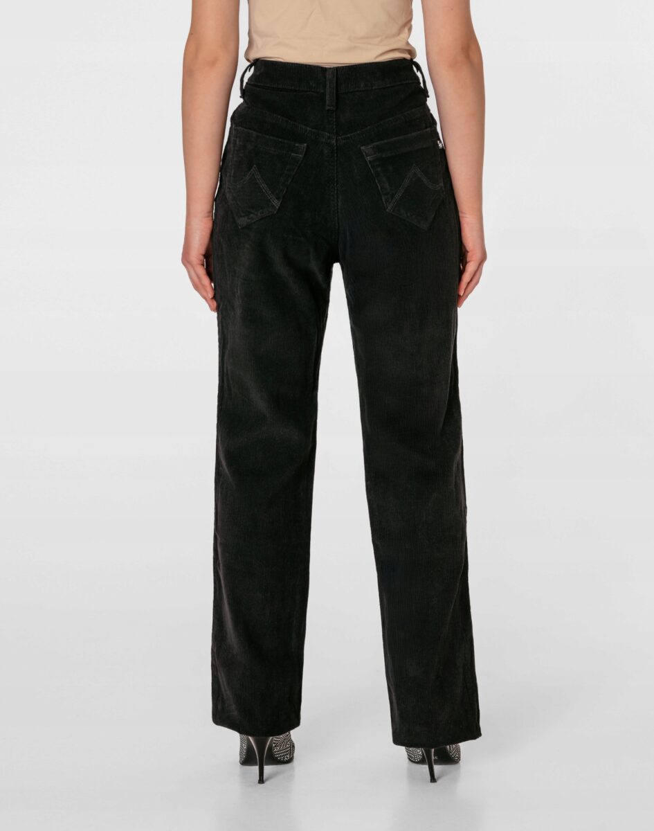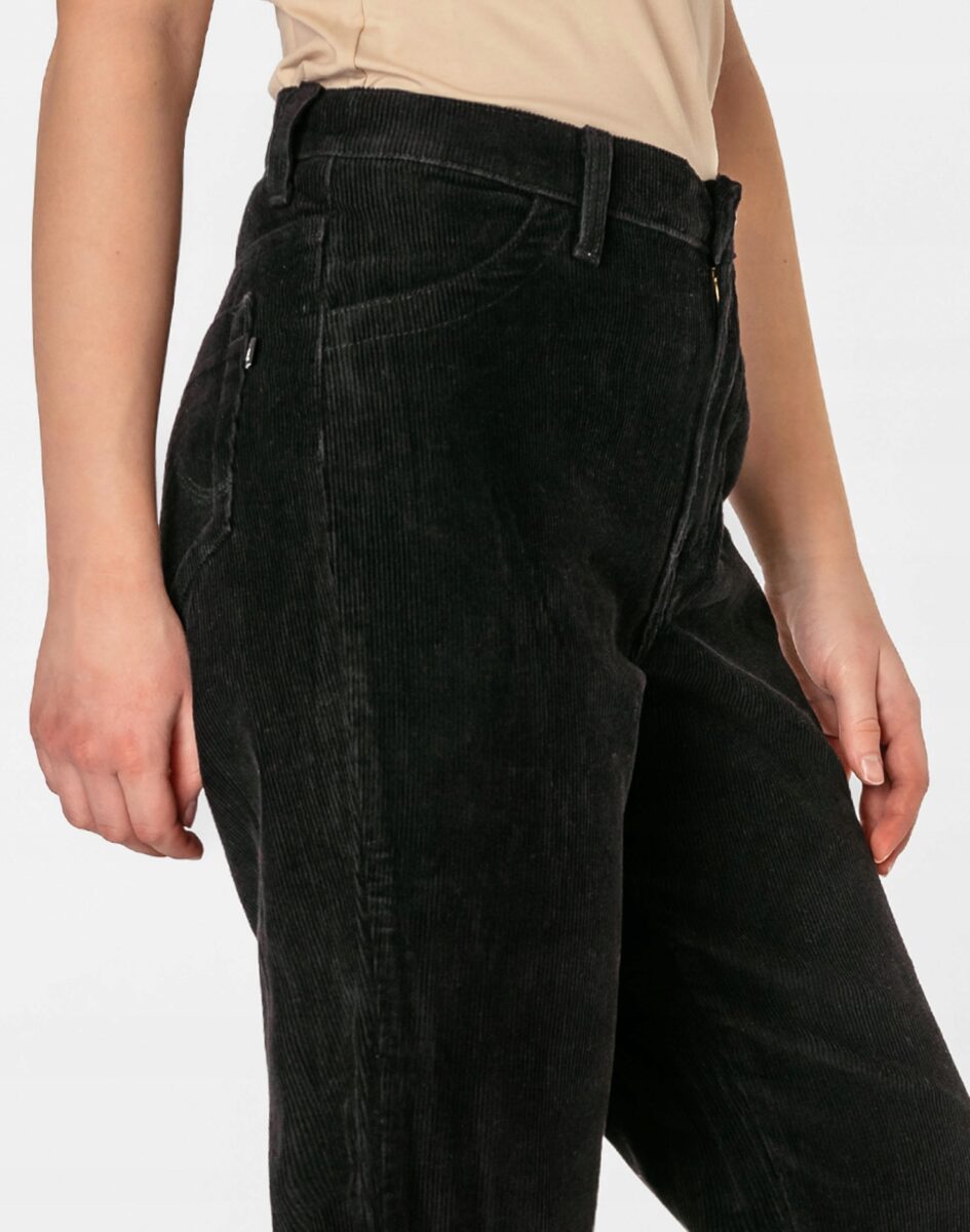 Czarne spodnie sztruksowe damskie z klasyczną prostą nogawką to klasyka wśród klasyki i jeden z najczęściej wybieranych modeli spodni. Wyprodukowane z wysokiej jakości delikatnie elastycznej tkaniny sztruksowej 100% bawełnianej, w charakterystyczny drobny prążek, miękkiej i ciepłej, bardzo wygodnej w użytkowaniu, pozwalającej na pełną swobodę ruchów, co daje wygodę przy siadaniu i zapewnia ogromny komfort noszenia. Zapinane na kryty zamek błyskawiczny i metalowy guzik. Z przodu mają dwie kieszonki zaokrąglone na dłonie, a na tyle klasyczne kieszenie naszywane jak w typowych spodniach jeansowych. W pasie szlufki umożliwiające stylizacje z paskiem. Stan podwyższony "High Rise" zapewnia świetne dopasowanie i zgrabnie modeluje sylwetkę w talii. Najbardziej podatne na uszkodzenia miejsca wzmocnione są dodatkowymi przeszyciami.