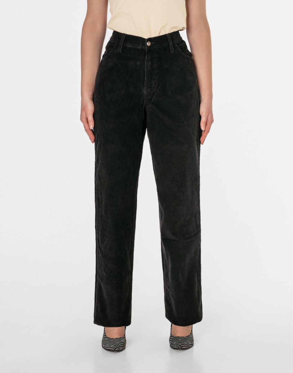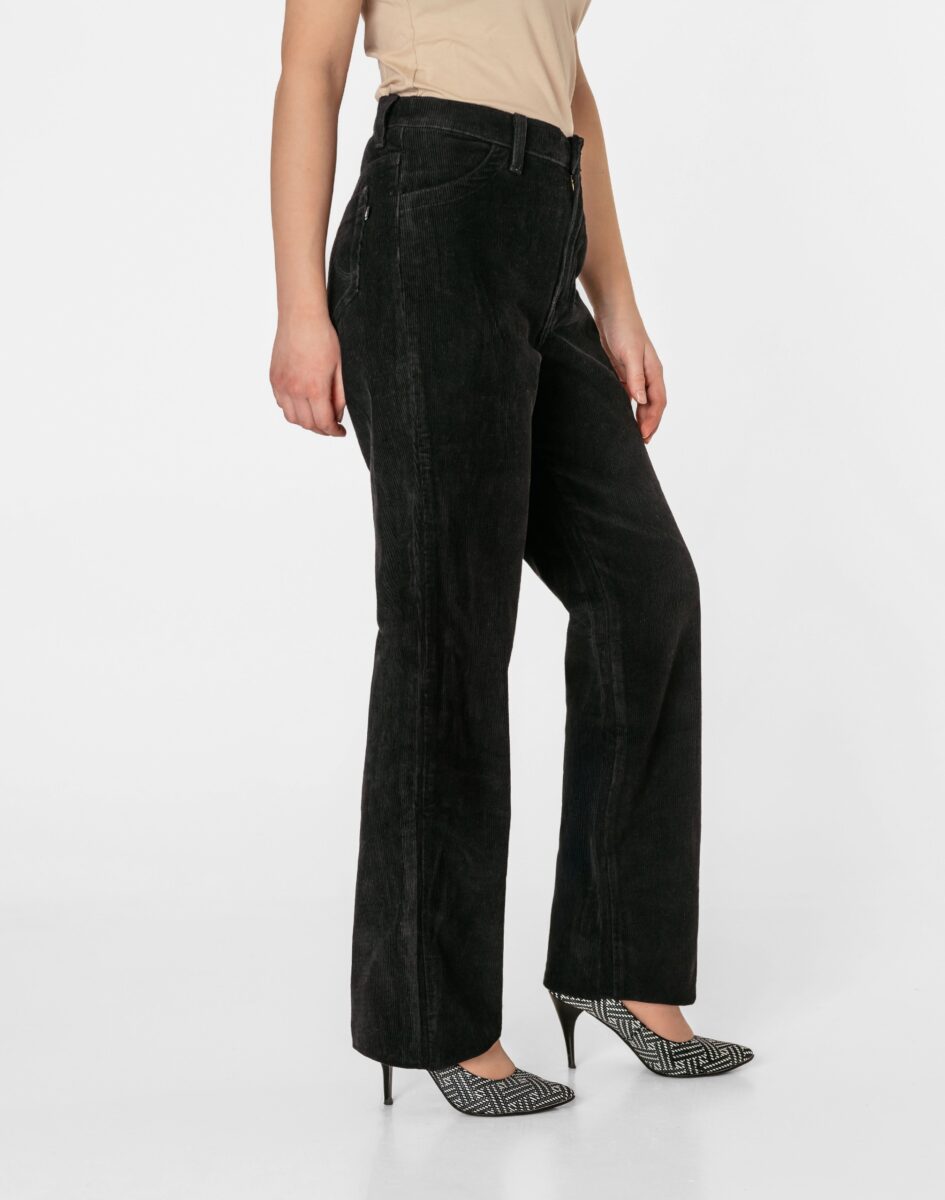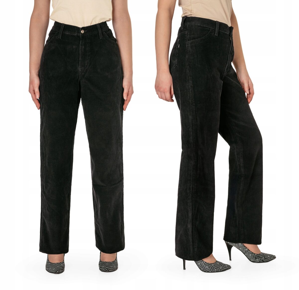 Czarne spodnie sztruksowe damskie z klasyczną prostą nogawką to klasyka wśród klasyki i jeden z najczęściej wybieranych modeli spodni. Wyprodukowane z wysokiej jakości delikatnie elastycznej tkaniny sztruksowej 100% bawełnianej, w charakterystyczny drobny prążek, miękkiej i ciepłej, bardzo wygodnej w użytkowaniu, pozwalającej na pełną swobodę ruchów, co daje wygodę przy siadaniu i zapewnia ogromny komfort noszenia. Zapinane na kryty zamek błyskawiczny i metalowy guzik. Z przodu mają dwie kieszonki zaokrąglone na dłonie, a na tyle klasyczne kieszenie naszywane jak w typowych spodniach jeansowych. W pasie szlufki umożliwiające stylizacje z paskiem. Stan podwyższony "High Rise" zapewnia świetne dopasowanie i zgrabnie modeluje sylwetkę w talii. Najbardziej podatne na uszkodzenia miejsca wzmocnione są dodatkowymi przeszyciami.