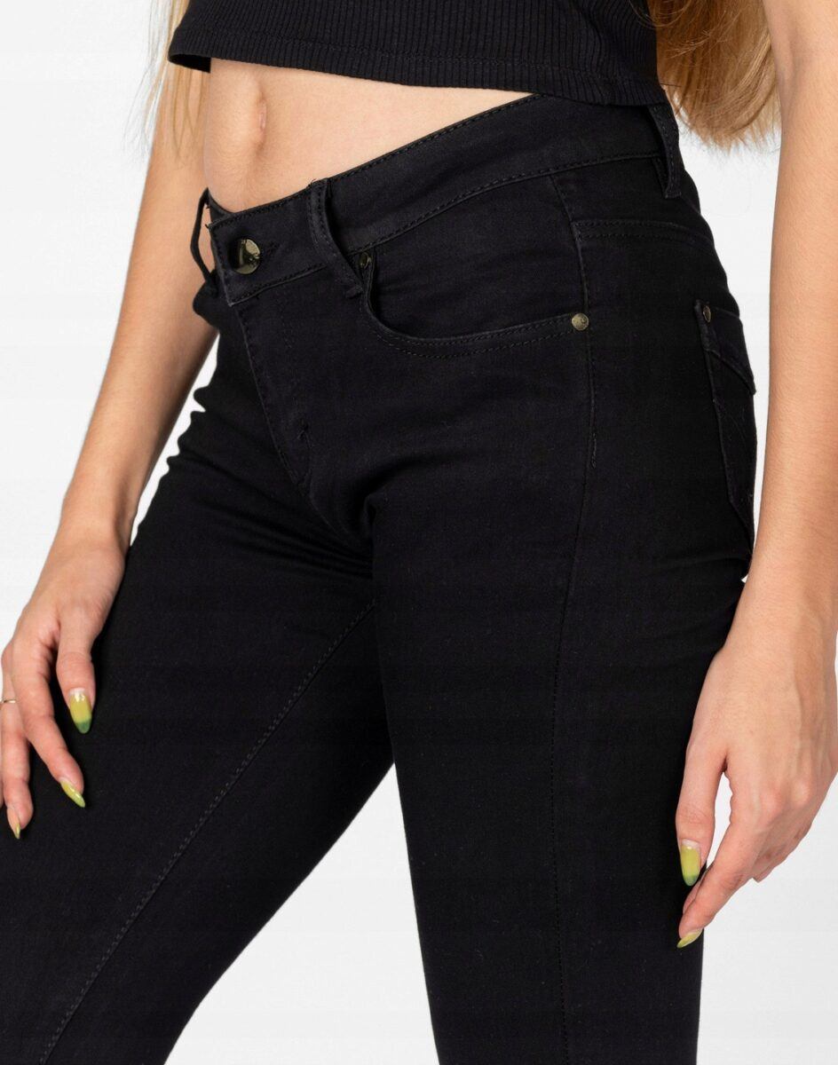Oferowane przez nas spodnie uszyte są z wysokiej jakości, trwałej i mocnej, elastycznej tkaniny jeansowej o czarnym wybarwieniu „Denim Super Black” z domieszką lycry. Niewielki dodatek lycry sprawia, że spodnie są bardziej elastyczne, ładnie dopasowują się do sylwetki i są bardzo komfortowe w użytkowaniu, a nogi wydają się się optycznie dłuższe. Dobrze wyglądają również z podwiniętymi nogawkami. Niepozorne podwinięcie nogawek spodni nadaje stylizacjom ciekawej nonszalancji i zadziorności. Łatwo się je zakłada i są znacznie wygodniejsze od jeansów, które lycry nie mają. Poza tym bawełna ma tendencję do kurczenia się w praniu, dlatego lycra sprawia, że spodnie są wyjątkowo praktyczne i można je bez problemu założyć po wysuszeniu. Pozwalają na pełną swobodę ruchów, co daje wygodę przy siadaniu i zapewnia ogromny komfort noszenia. Możesz je śmiało łączyć zarówno ze szpilkami (idealnie wydłużają kobiece nogi), jak i obuwiem sportowym. Zapewniają poczucie atrakcyjności przy jednoczesnym zachowaniu wygody i pełnej swobody ruchów.