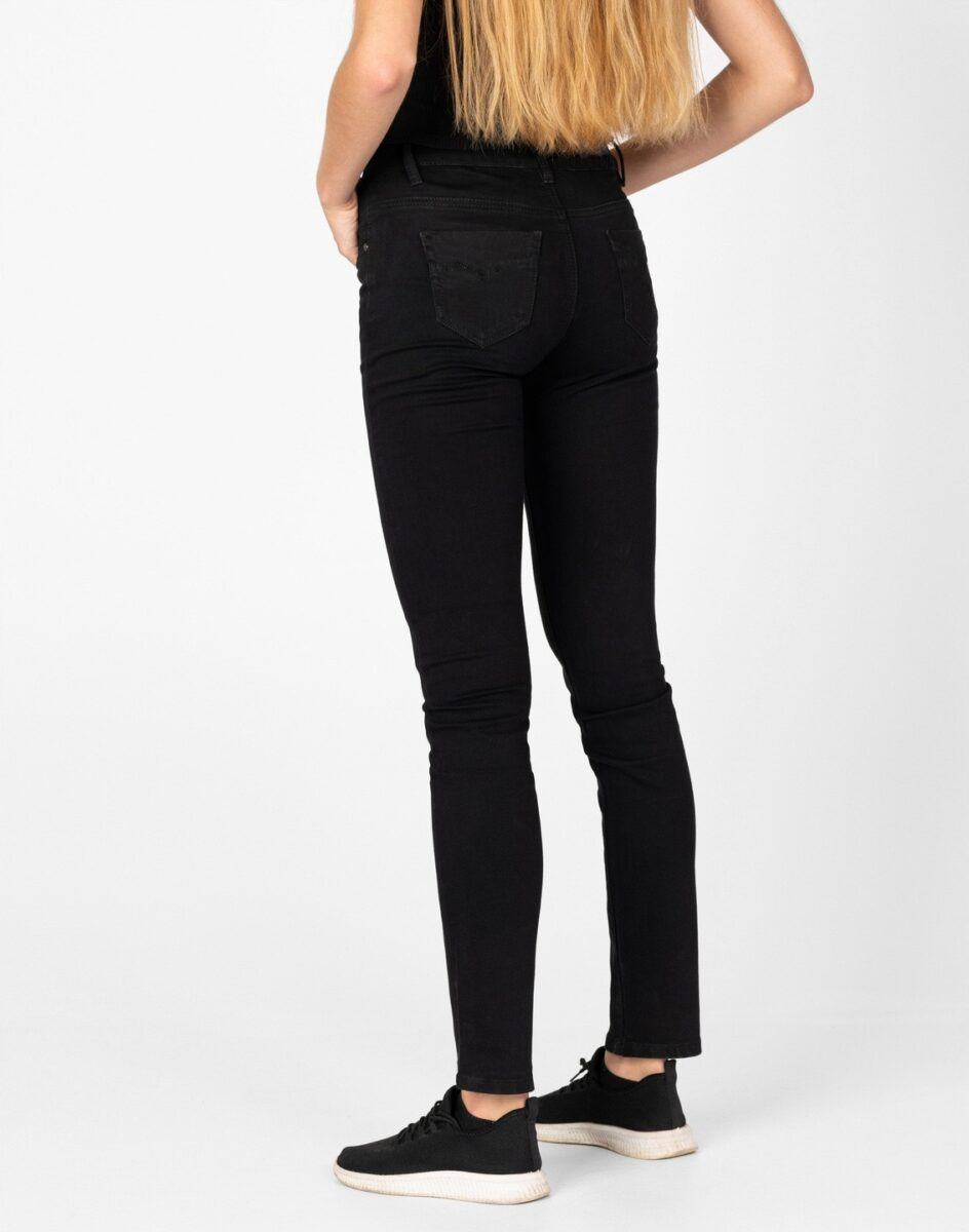 Spodnie damskie model 024# to klasyczne, bardzo szykowne rurki w kolorze czarnym „Super Black” z wąskimi nogawkami o wyszczuplającym optycznie kobiecą sylwetkę fasonie (Skinny) i wyższym stanie (High Waist). Zapinane są na kryty zamek błyskawiczny i metalowy guzik sygnowany logiem firmy. Z przodu mają dwie kieszonki zaokrąglone oraz mniejszą kieszonkę tzw. bilonówkę, a na tyle klasyczne kieszenie naszywane jak w typowych spodniach jeansowych. W pasie szlufki umożliwiające stylizacje z paskiem. Najbardziej podatne na uszkodzenia miejsca wzmocnione są dodatkowymi przeszyciami oraz małymi metalowymi nitami.