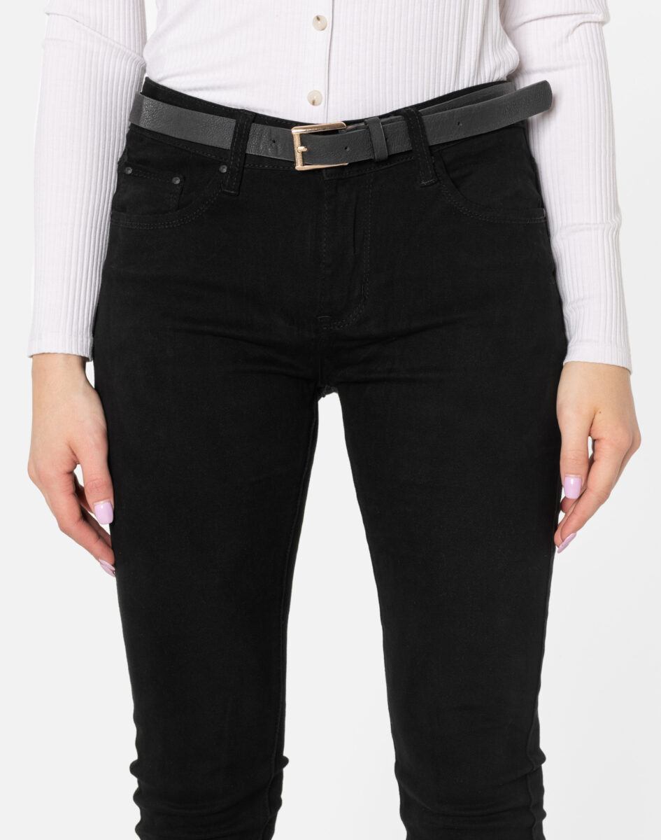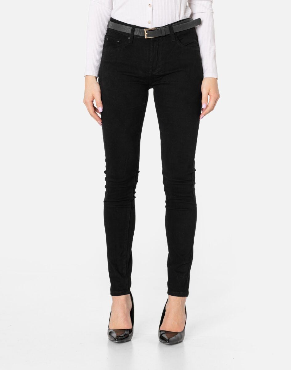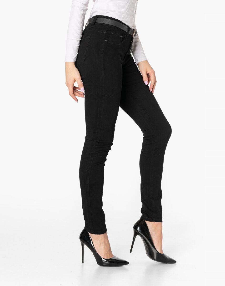 Spodnie damskie model 20529# to klasyczne, bardzo szykowne rurki w kolorze czarnym „Super Black” z wąskimi nogawkami o wyszczuplającym optycznie kobiecą sylwetkę fasonie (Skinny) i wyższym stanie (High Waist). Zapinane są na kryty zamek błyskawiczny i metalowy guzik sygnowany logiem firmy. Z przodu mają dwie kieszonki zaokrąglone oraz mniejszą kieszonkę tzw. bilonówkę, a na tyle klasyczne kieszenie naszywane jak w typowych spodniach jeansowych. W pasie szlufki umożliwiające stylizacje z paskiem. Najbardziej podatne na uszkodzenia miejsca wzmocnione są dodatkowymi przeszyciami oraz małymi metalowymi nitami.