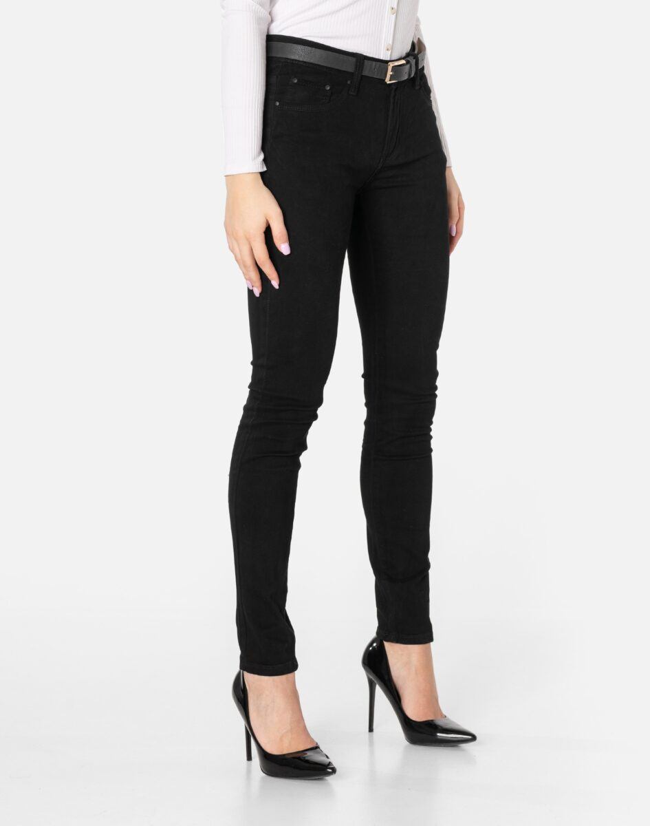 Spodnie damskie model 20529# to klasyczne, bardzo szykowne rurki w kolorze czarnym „Super Black” z wąskimi nogawkami o wyszczuplającym optycznie kobiecą sylwetkę fasonie (Skinny) i wyższym stanie (High Waist). Zapinane są na kryty zamek błyskawiczny i metalowy guzik sygnowany logiem firmy. Z przodu mają dwie kieszonki zaokrąglone oraz mniejszą kieszonkę tzw. bilonówkę, a na tyle klasyczne kieszenie naszywane jak w typowych spodniach jeansowych. W pasie szlufki umożliwiające stylizacje z paskiem. Najbardziej podatne na uszkodzenia miejsca wzmocnione są dodatkowymi przeszyciami oraz małymi metalowymi nitami.