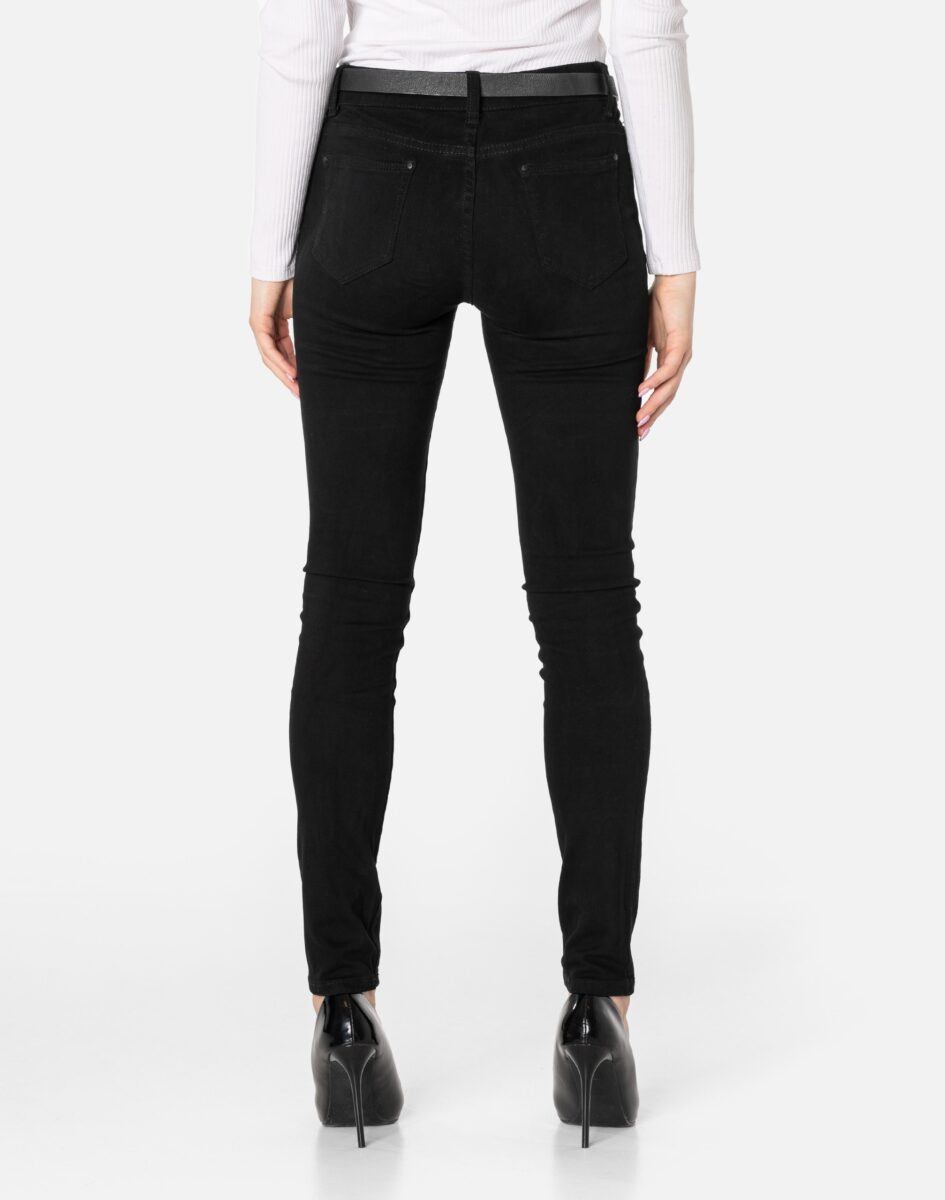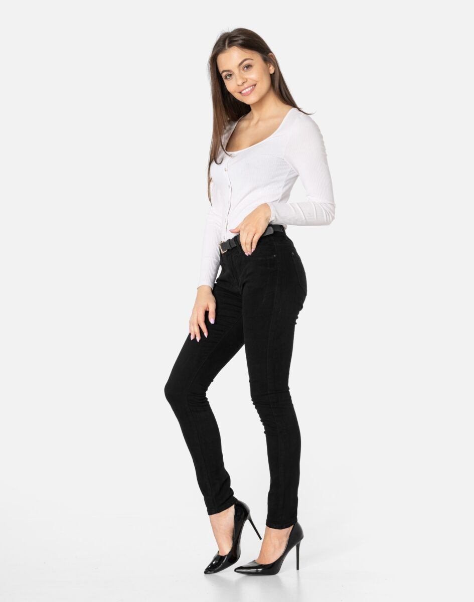 Oferowane przez nas spodnie uszyte są z wysokiej jakości, trwałej i mocnej, elastycznej tkaniny jeansowej o czarnym wybarwieniu „Denim Super Black” z domieszką lycry (elastan). Niewielki dodatek elastanu (lycra) sprawia, że spodnie są bardziej elastyczne, ładnie dopasowują się do sylwetki i są bardzo komfortowe w użytkowaniu, a nogi wydają się się optycznie dłuższe. Dobrze wyglądają również z podwiniętymi nogawkami. Niepozorne podwinięcie nogawek spodni nadaje stylizacjom ciekawej nonszalancji i zadziorności. Łatwo się je zakłada i są znacznie wygodniejsze od jeansów, które lycry nie mają. Poza tym bawełna ma tendencję do kurczenia się w praniu, dlatego lycra sprawia, że spodnie są wyjątkowo praktyczne i można je bez problemu założyć po wysuszeniu. Pozwalają na pełną swobodę ruchów, co daje wygodę przy siadaniu i zapewnia ogromny komfort noszenia. Możesz je śmiało łączyć zarówno ze szpilkami (idealnie wydłużają kobiece nogi), jak i obuwiem sportowym. Zapewniają poczucie atrakcyjności przy jednoczesnym zachowaniu wygody i pełnej swobody ruchów.