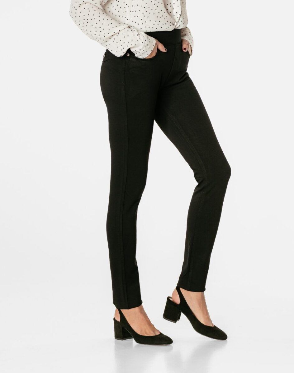 Oferowane przez nas spodnie uszyte są z wysokiej jakości tkaniny bawełnianej średniej grubości z domieszką poliestru i spandexu (elastan) dzięki czemu spodnie są bardziej elastyczne, bardzo dobrze się układają i dopasowują do każdej figury a nogi wydają się się optycznie dłuższe. Trwałe i elastyczne wykończenie spodni (użycie do produkcji elastycznych nici) gwarantuje komfort i wygodę ich użytkownikowi w każdych warunkach, a tkanina jest na tyle gruba, że nie widać przez nią bielizny. Możesz je śmiało łączyć zarówno ze szpilkami (idealnie wydłużają kobiece nogi), jak i obuwiem sportowym. Zapewniają poczucie atrakcyjności przy jednoczesnym zachowaniu wygody i pełnej swobody ruchów. Klasyczne, a jednocześnie zawsze nowoczesne, urzekają minimalistycznym wzornictwem. Elegancki czarny kolor, zawsze modny krój Slim Fit z wąską nogawką pozwoli Ci założyć je na wiele różnych okazji. Sprawdzony przez wiele zadowolonych klientek fason spodni sprawi, że w zależności od dopasowanego do nich elementu garderoby, będziesz zawsze odpowiednio ubrana na każdą okazję, zarówno na „sportowo” jak i na „elegancko”.