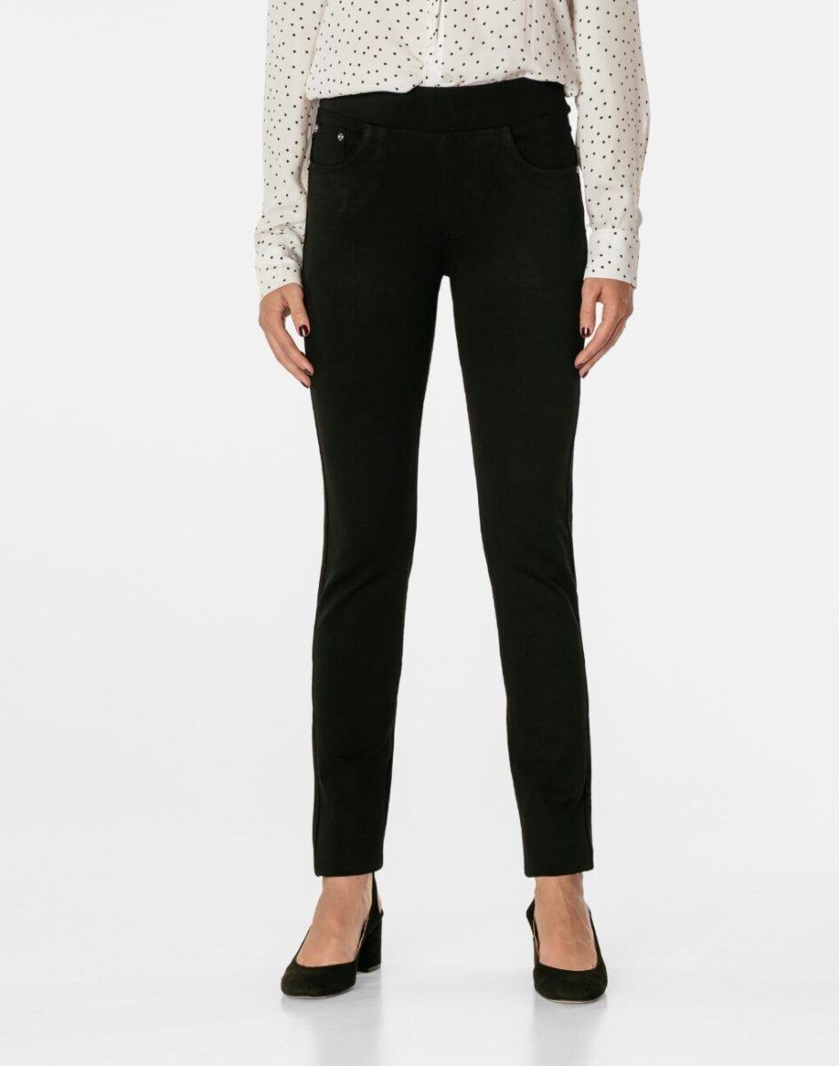 Oferowane przez nas spodnie uszyte są z wysokiej jakości tkaniny bawełnianej średniej grubości z domieszką poliestru i spandexu (elastan) dzięki czemu spodnie są bardziej elastyczne, bardzo dobrze się układają i dopasowują do każdej figury a nogi wydają się się optycznie dłuższe. Trwałe i elastyczne wykończenie spodni (użycie do produkcji elastycznych nici) gwarantuje komfort i wygodę ich użytkownikowi w każdych warunkach, a tkanina jest na tyle gruba, że nie widać przez nią bielizny. Możesz je śmiało łączyć zarówno ze szpilkami (idealnie wydłużają kobiece nogi), jak i obuwiem sportowym. Zapewniają poczucie atrakcyjności przy jednoczesnym zachowaniu wygody i pełnej swobody ruchów. Klasyczne, a jednocześnie zawsze nowoczesne, urzekają minimalistycznym wzornictwem. Elegancki czarny kolor, zawsze modny krój Slim Fit z wąską nogawką pozwoli Ci założyć je na wiele różnych okazji. Sprawdzony przez wiele zadowolonych klientek fason spodni sprawi, że w zależności od dopasowanego do nich elementu garderoby, będziesz zawsze odpowiednio ubrana na każdą okazję, zarówno na „sportowo” jak i na „elegancko”.
